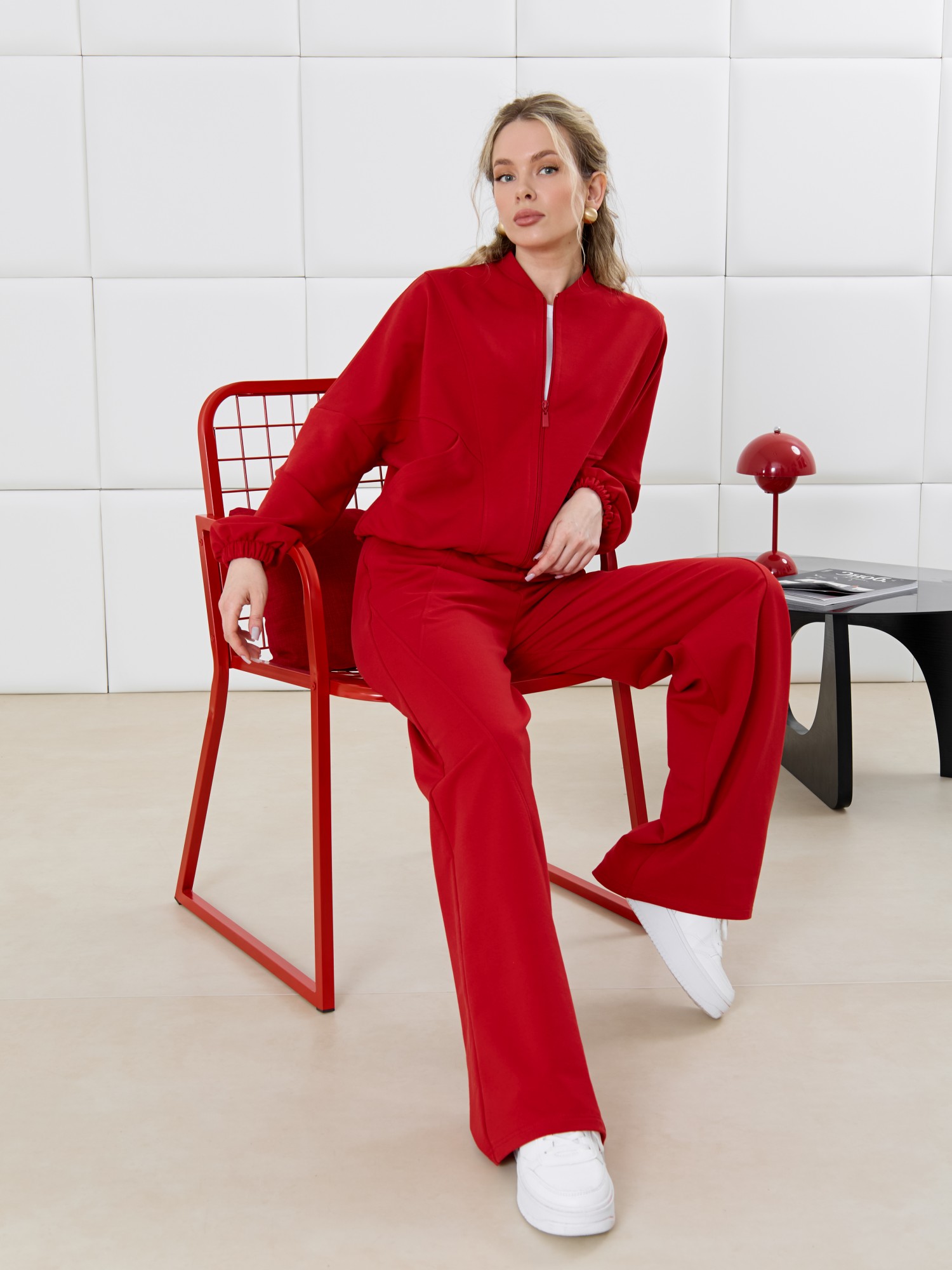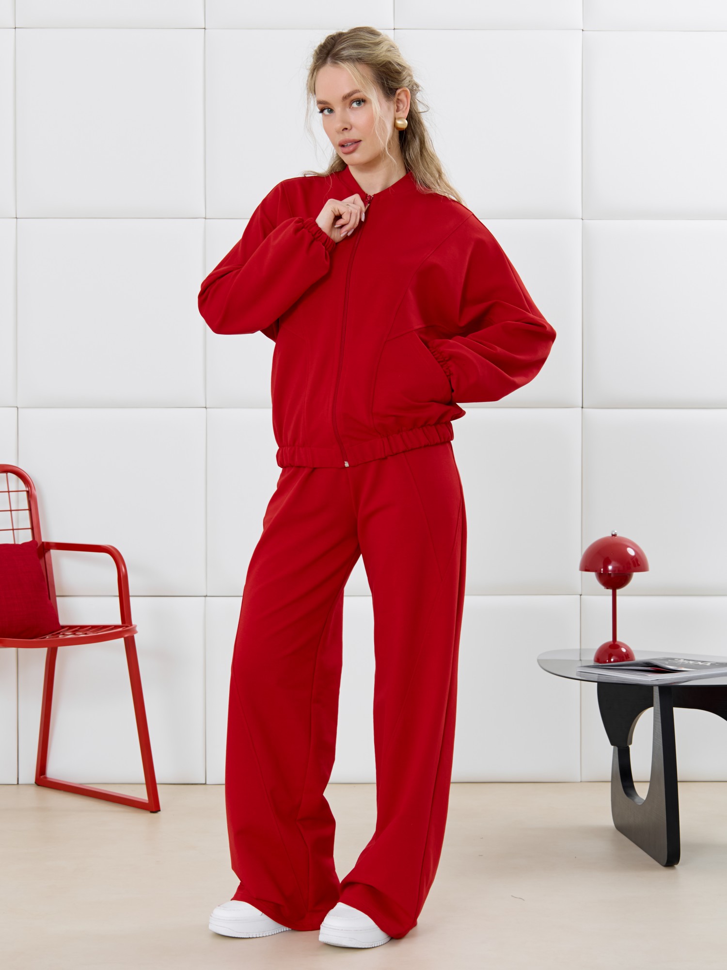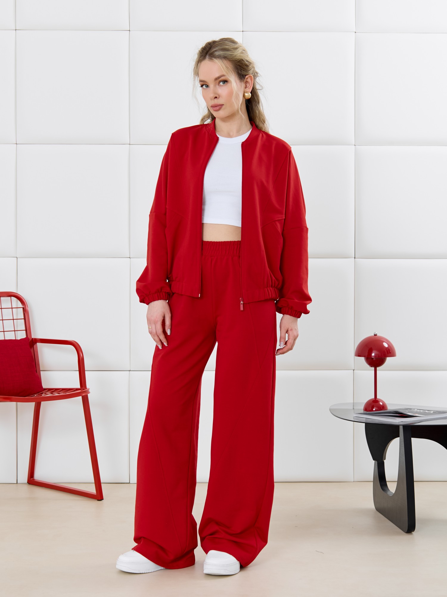 Брюки молодежные из трикотажного гладкокрашенного полотна «футер», длинные, на притачном поясе с эластичной тесьмой внутри, с карманами в боковых швах. Правая и левая половины брюк состоят из трех частей, скроенных по косой, с отделочными строчками по шву стачивания.