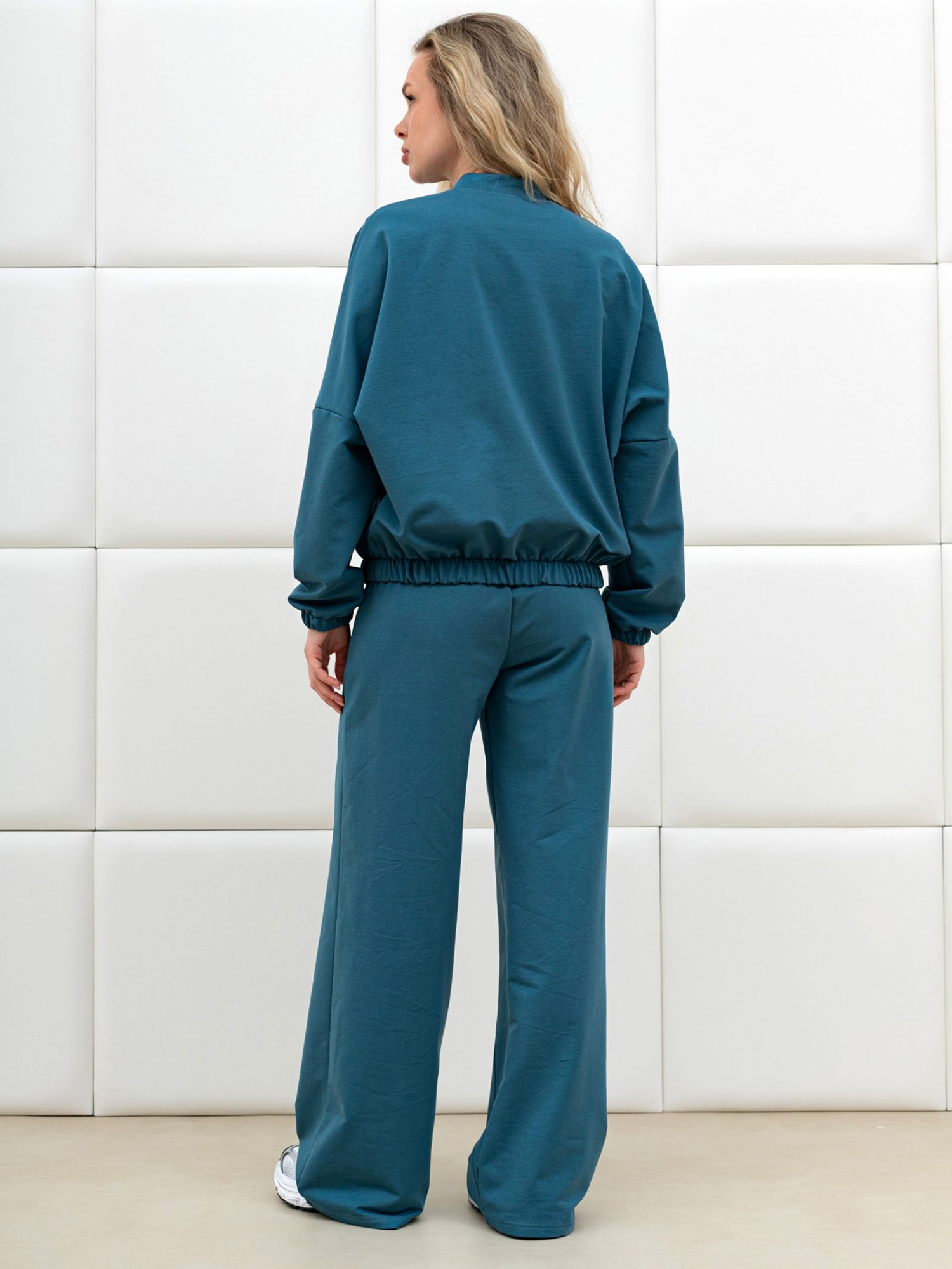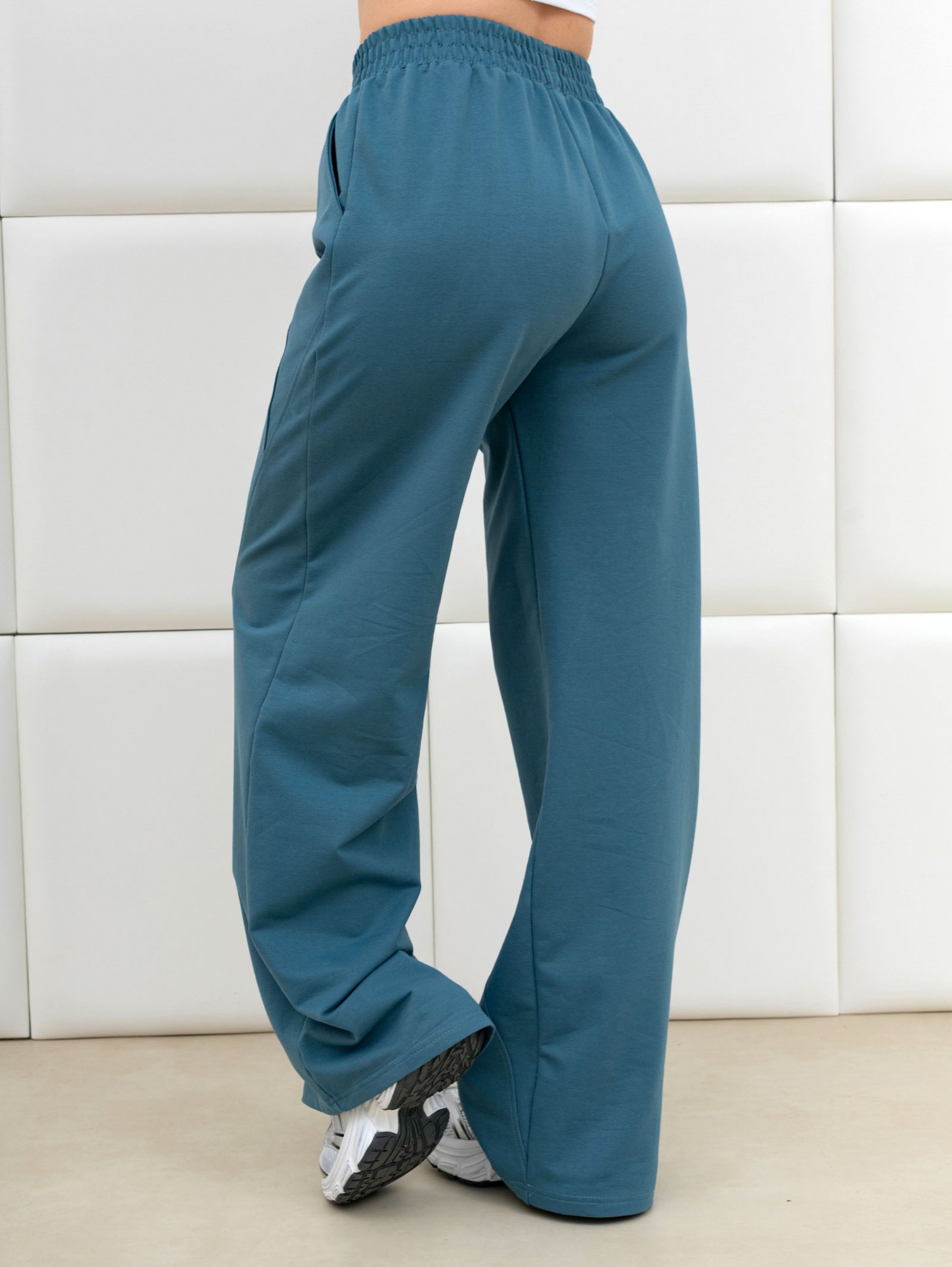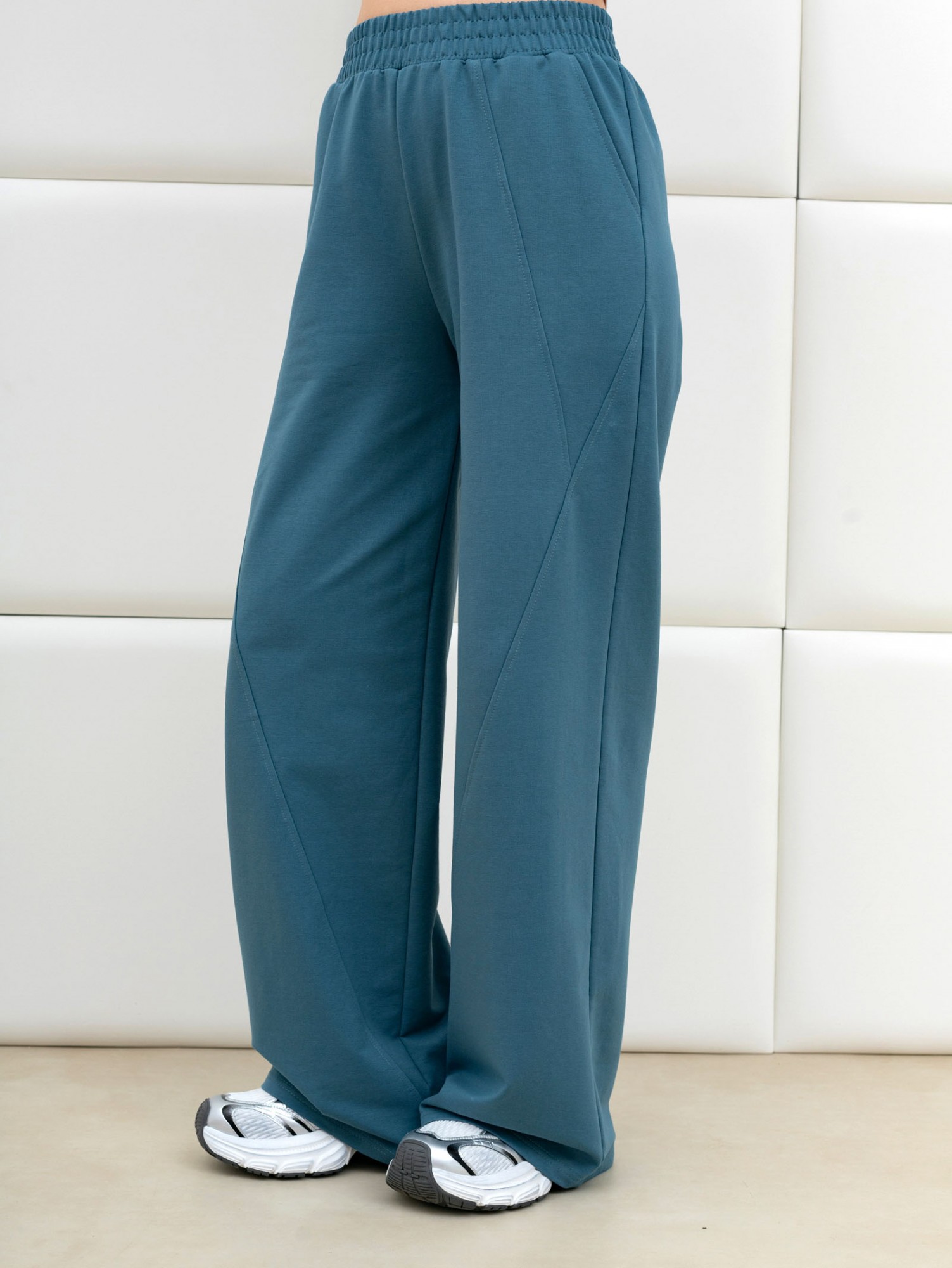 Брюки молодежные из трикотажного гладкокрашенного полотна «футер», длинные, на притачном поясе с эластичной тесьмой внутри, с карманами в боковых швах. Правая и левая половины брюк состоят из трех частей, скроенных по косой, с отделочными строчками по шву стачивания.