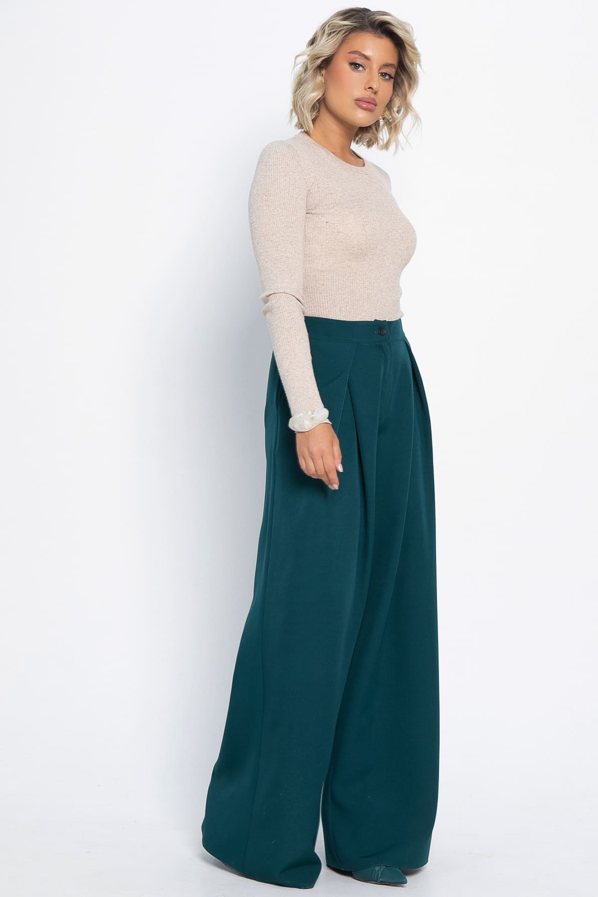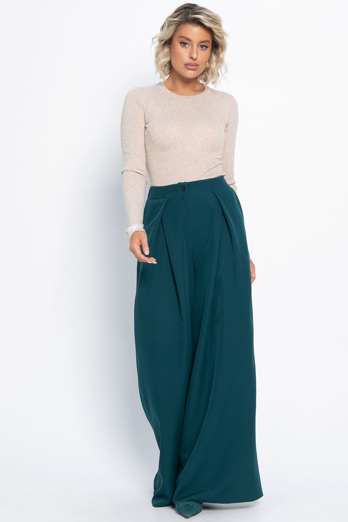 Классические широкие брюки-палаццо в красивом изумрудном цвете — идеальный выбор для модниц, ценящих комфорт и элегантность. Эти брюки идеально подходят как для повседневной носки, так и для особых мероприятий, что делает их универсальным элементом гардероба. Спинка на резинке для удобной и комфортной посадки, а спереди встречные складки придают им стильный вид. Свободный фасон брюк гармонично сочетается с различными верхами, позволяя создавать разнообразные образы — от casual до более формальных. Добавьте эти брюки-палаццо в свой гардероб и наслаждайтесь стильными и комфортными нарядами!