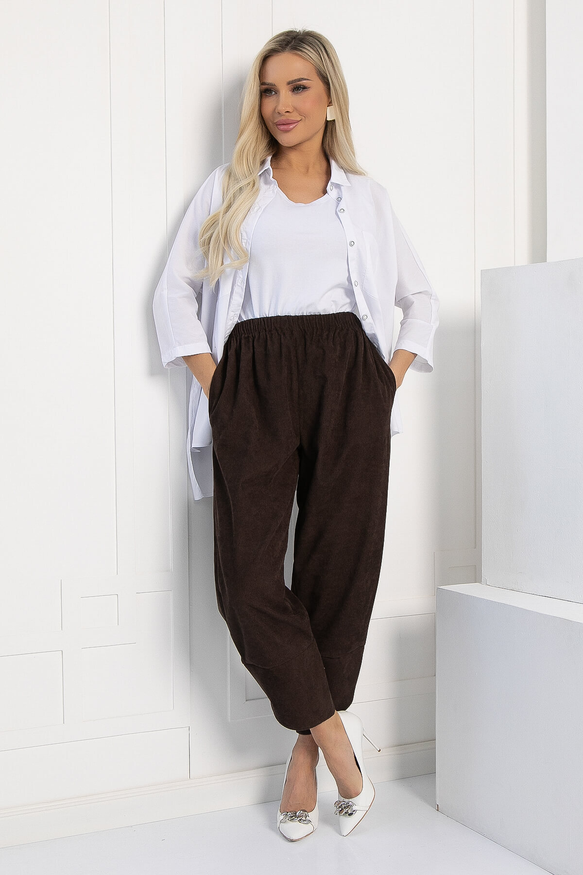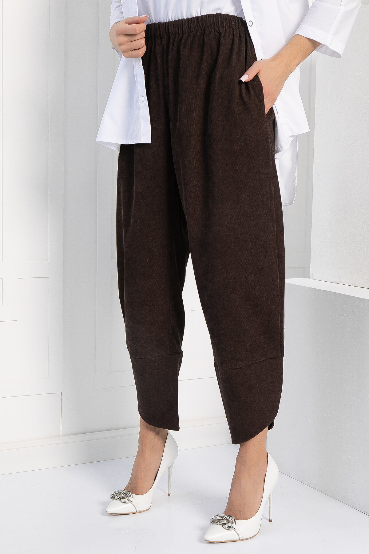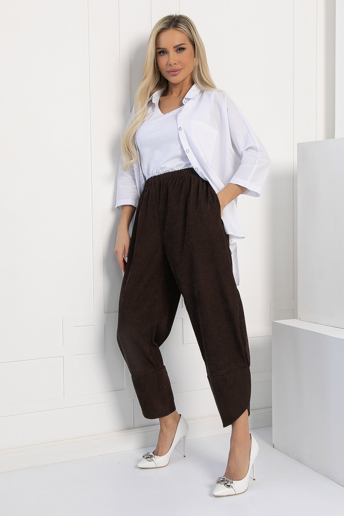 Объёмные брюки в стиле бохо — это свободный непринуждённый стиль в современной моде. Шароварный силуэт создается за счет резинки по талии, свободной посадки в бедрах, бокового защипа по низу и оригинального высокого манжета в виде тюльпана. Свободные, прямые, просторные брюки бананы выгодно подчеркивают женские формы и скрывают недостатки. Комбинируйте их с различными видами топов, джемперов, блузок или футболок. Различные аутфиты сделают вас стильной, модной для любого выхода. Такие штаны универсальны и могут быть частью городского casual образа или классического делового, повседневного школьного и даже спортивного. Брюки бананы можно носить как домашнюю одежду, они незаменимы для поездок в путешествие или командировки.