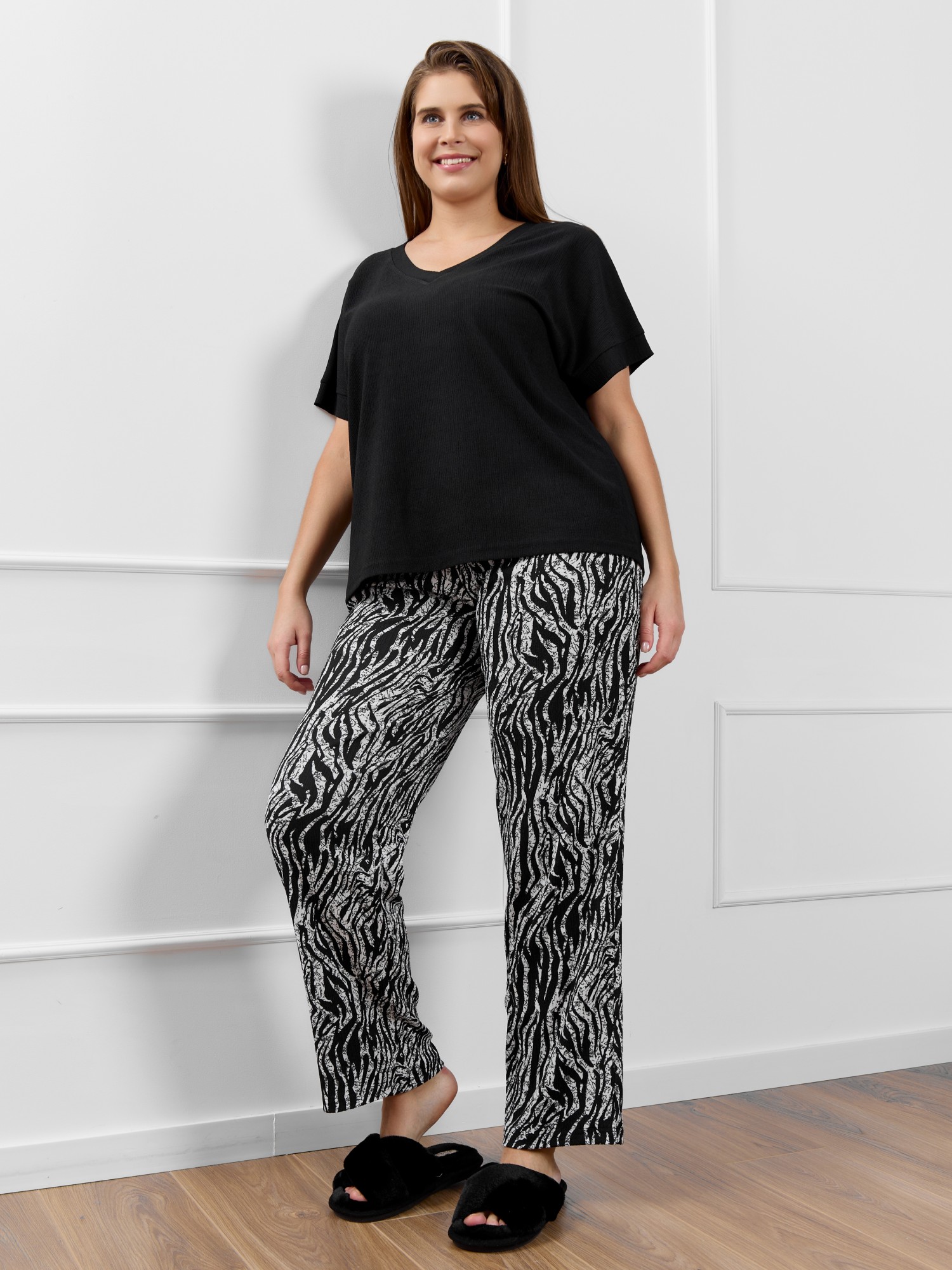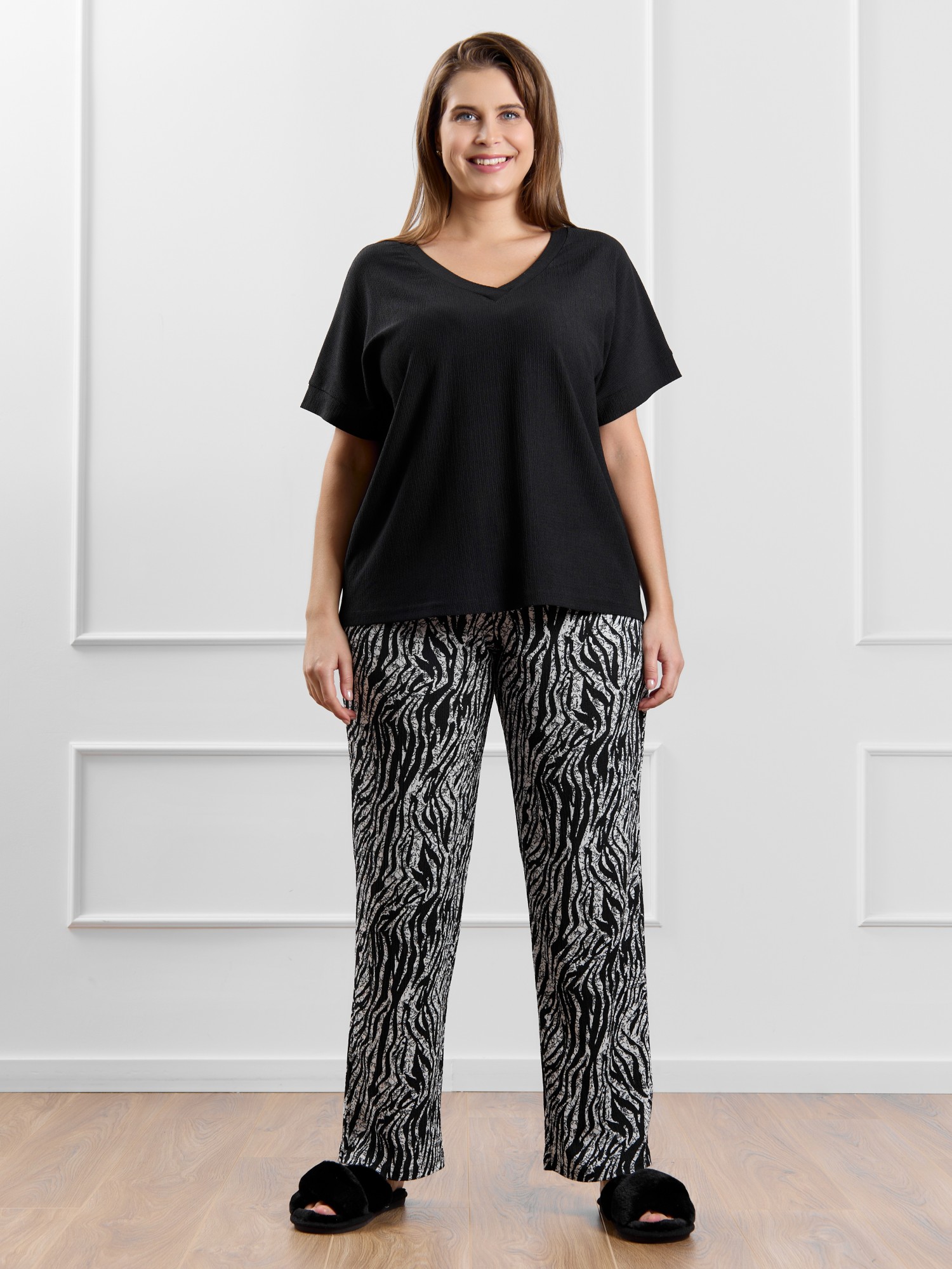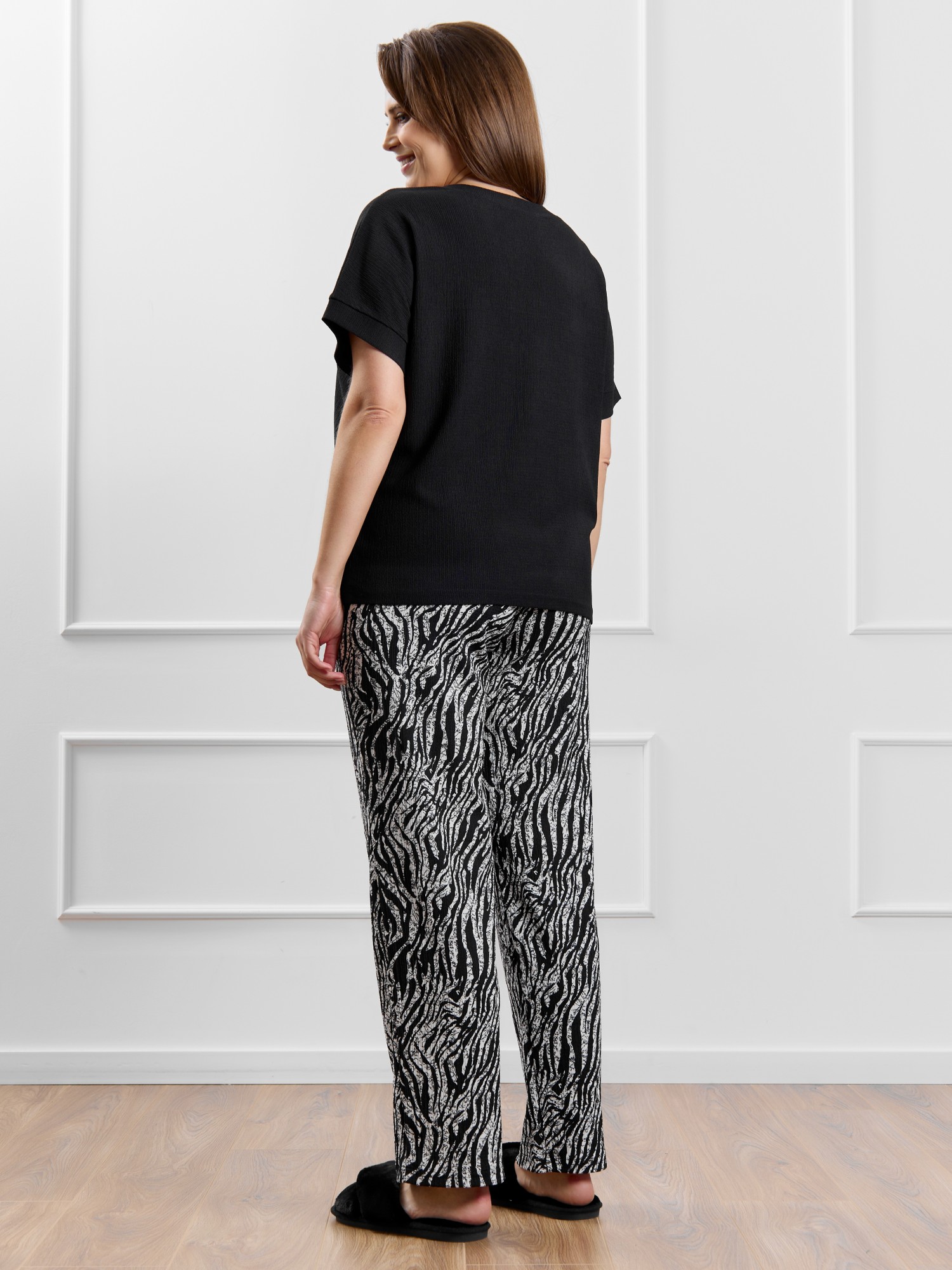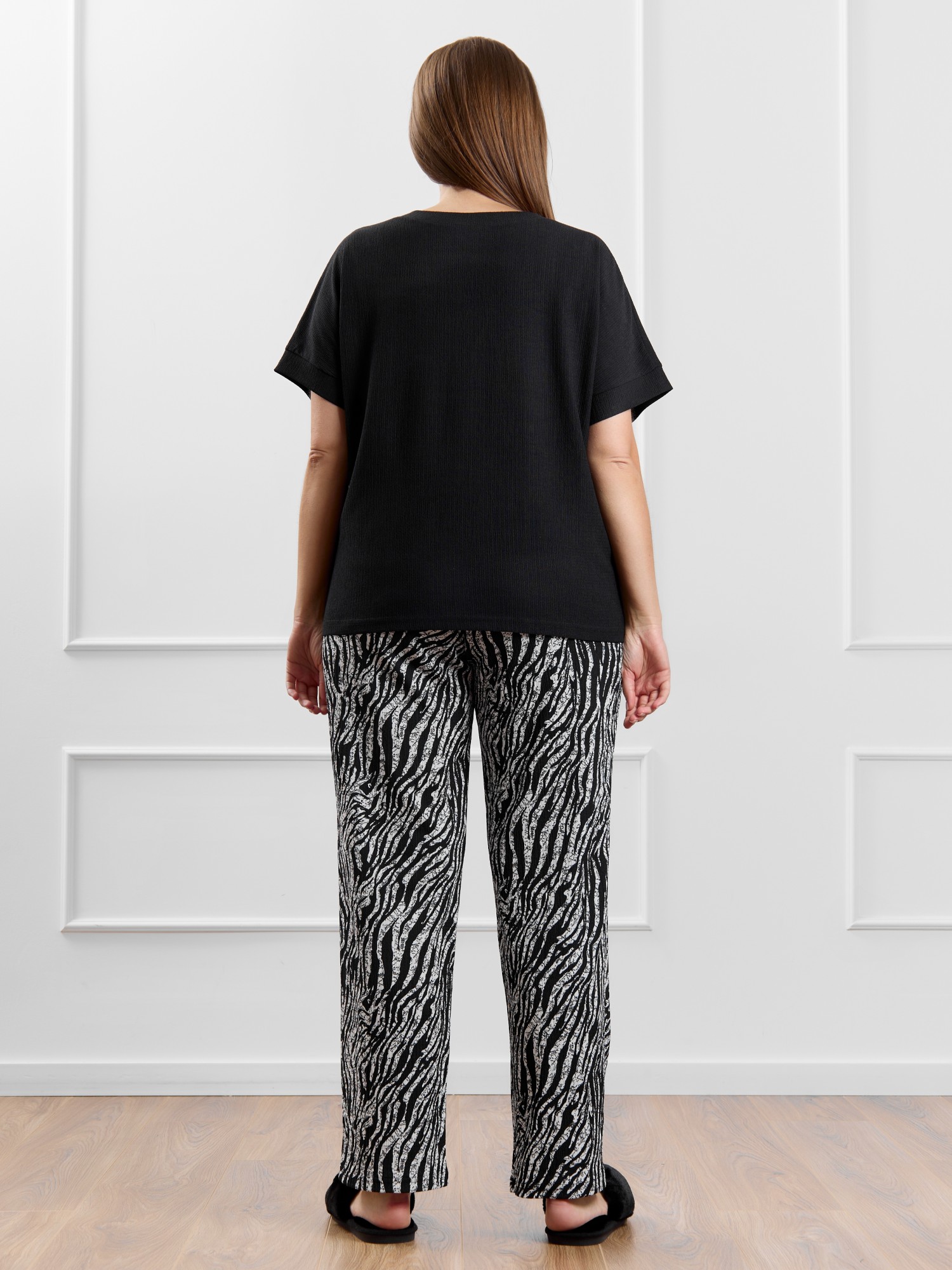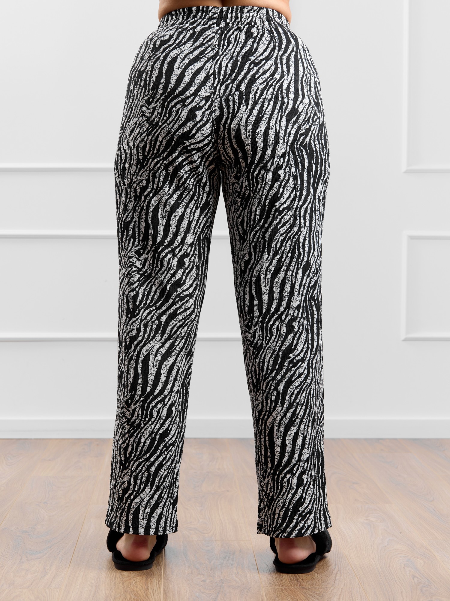 Брюки женские из трикотажного полотна «бурумчук» (шелковый креп) с набивным рисунком, прямого кроя, свободные, с карманами в боковых швах, на притачном поясе с эластичной тесьмой внутри.
