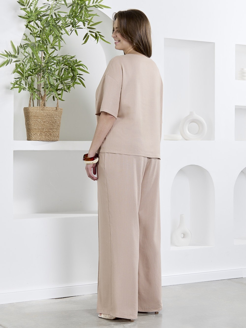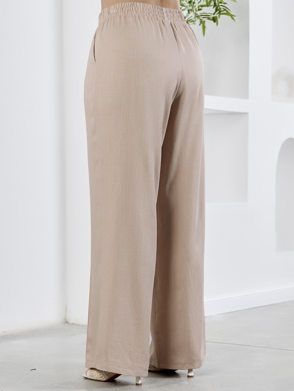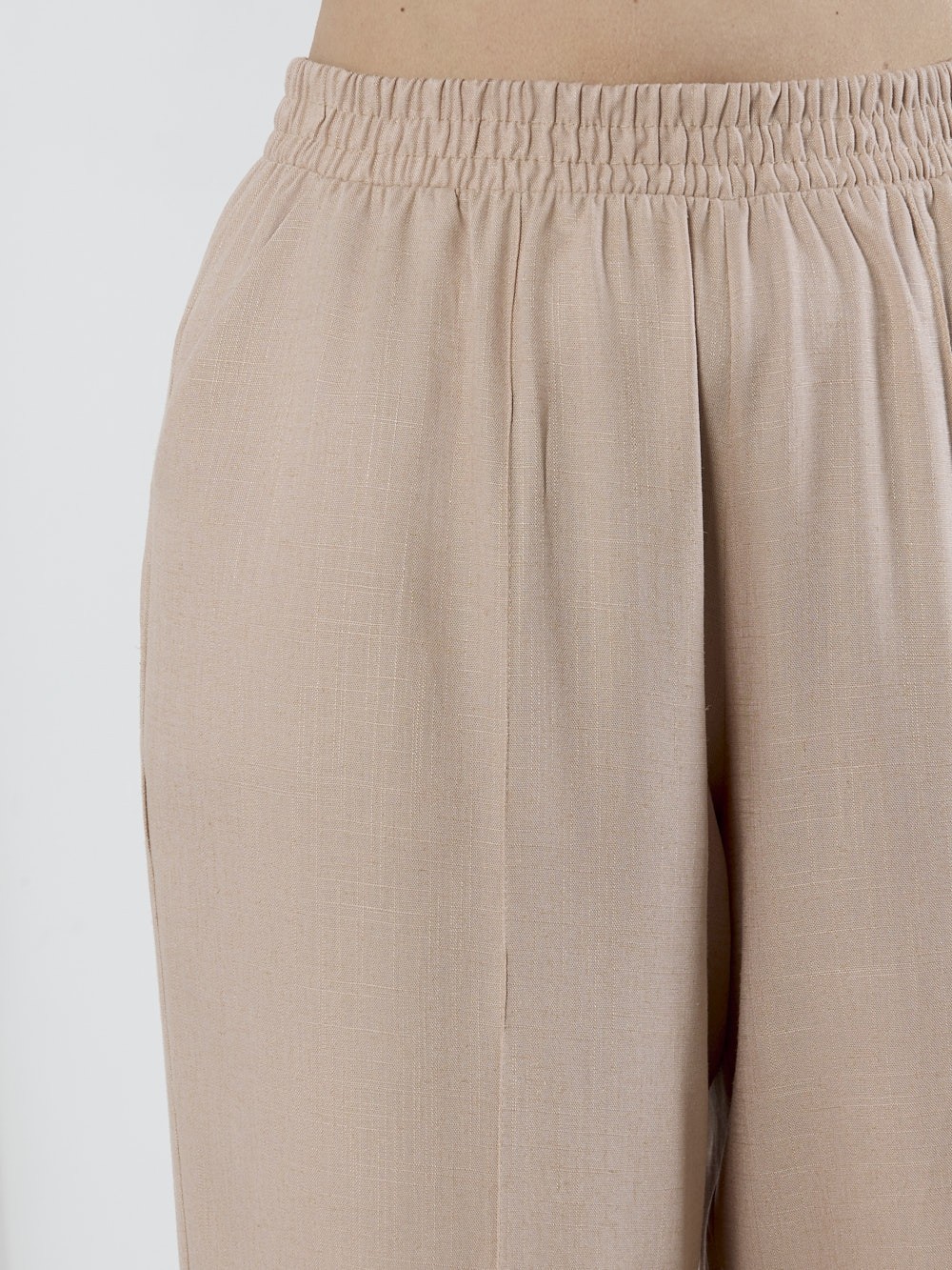 Брюки женские из гладкокрашеного тканого полотна, свободного кроя, удлиненные, с карманами в боковых швах, на притачном поясе с эластичной тесьмой внутри. Передние половины застрочены по центральным линиям.