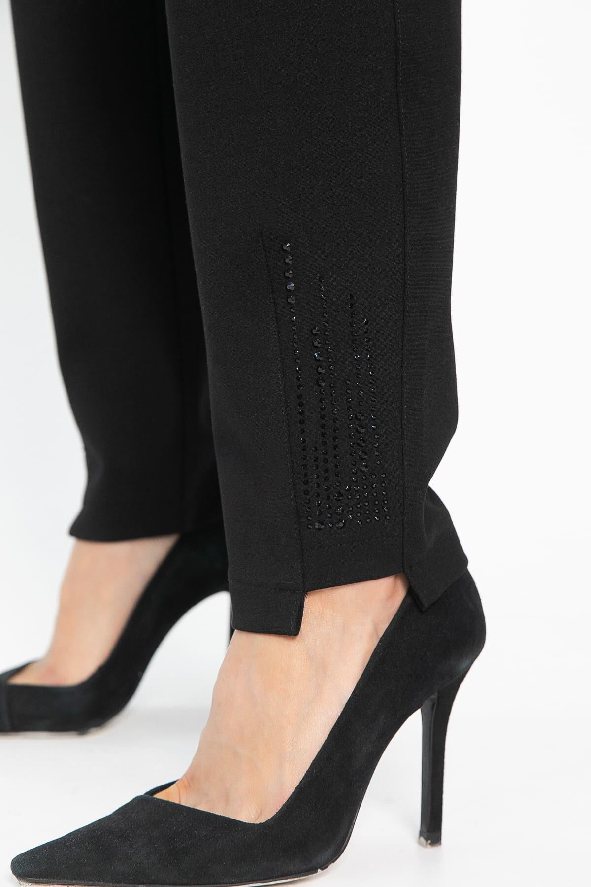 Классические брюки из плотного трикотажа станут отличным дополнением к вашему гардеробу. Брюки прямые, слегка заужены к низу. В боковых швах карманы, край входа в карман декорирован стразами. По низу брюк по боковому декоративная деталь-вставка со стразами. Эти брюки можно носить как на работу, так и на прогулку или встречу с друзьями.