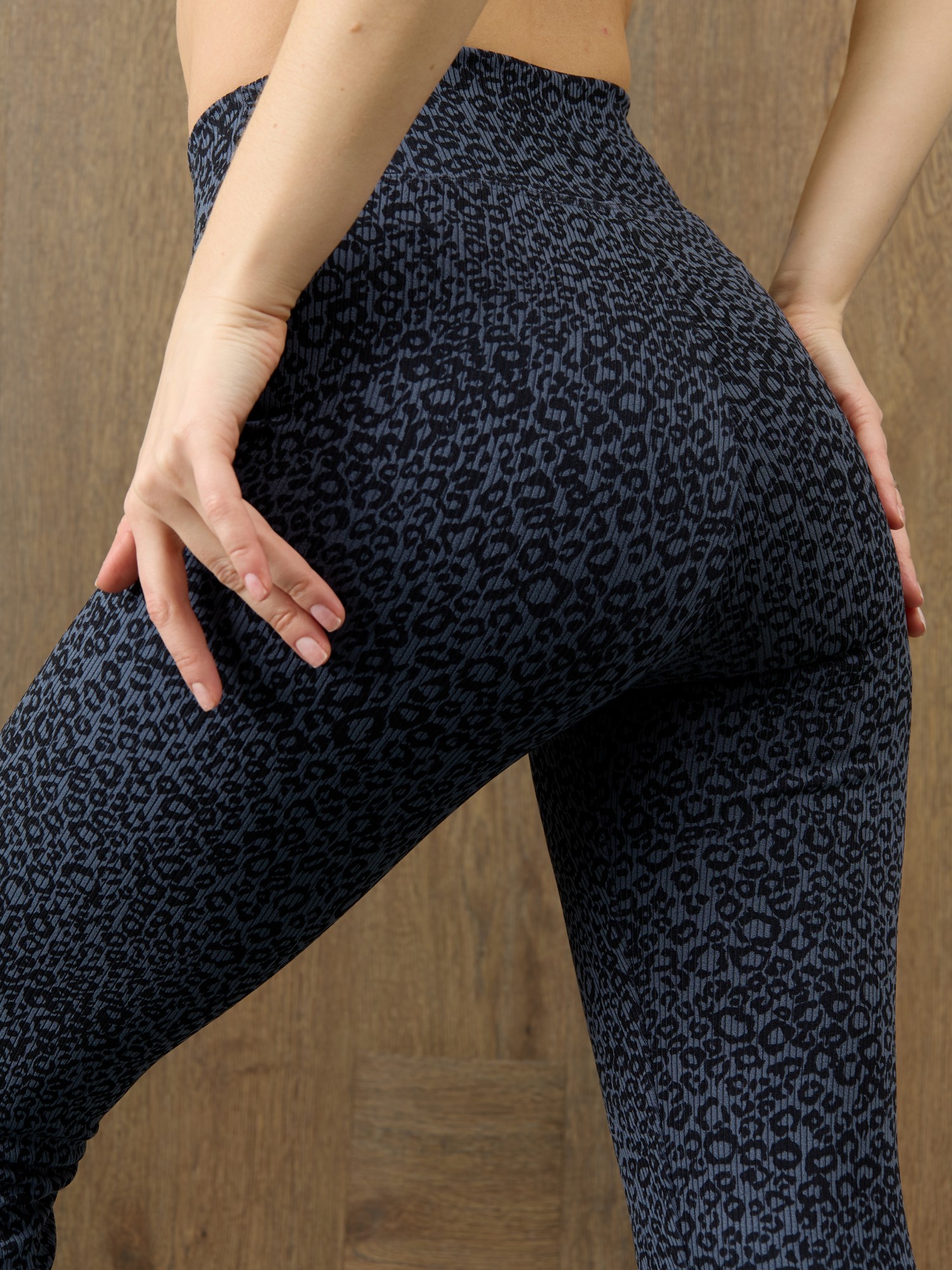 Леггинсы молодежные из трикотажного полотна «рибана» с набивным «леопардовым» рисунком, длинные, облегающие фигуру, с эластичной тесьмой по талии.