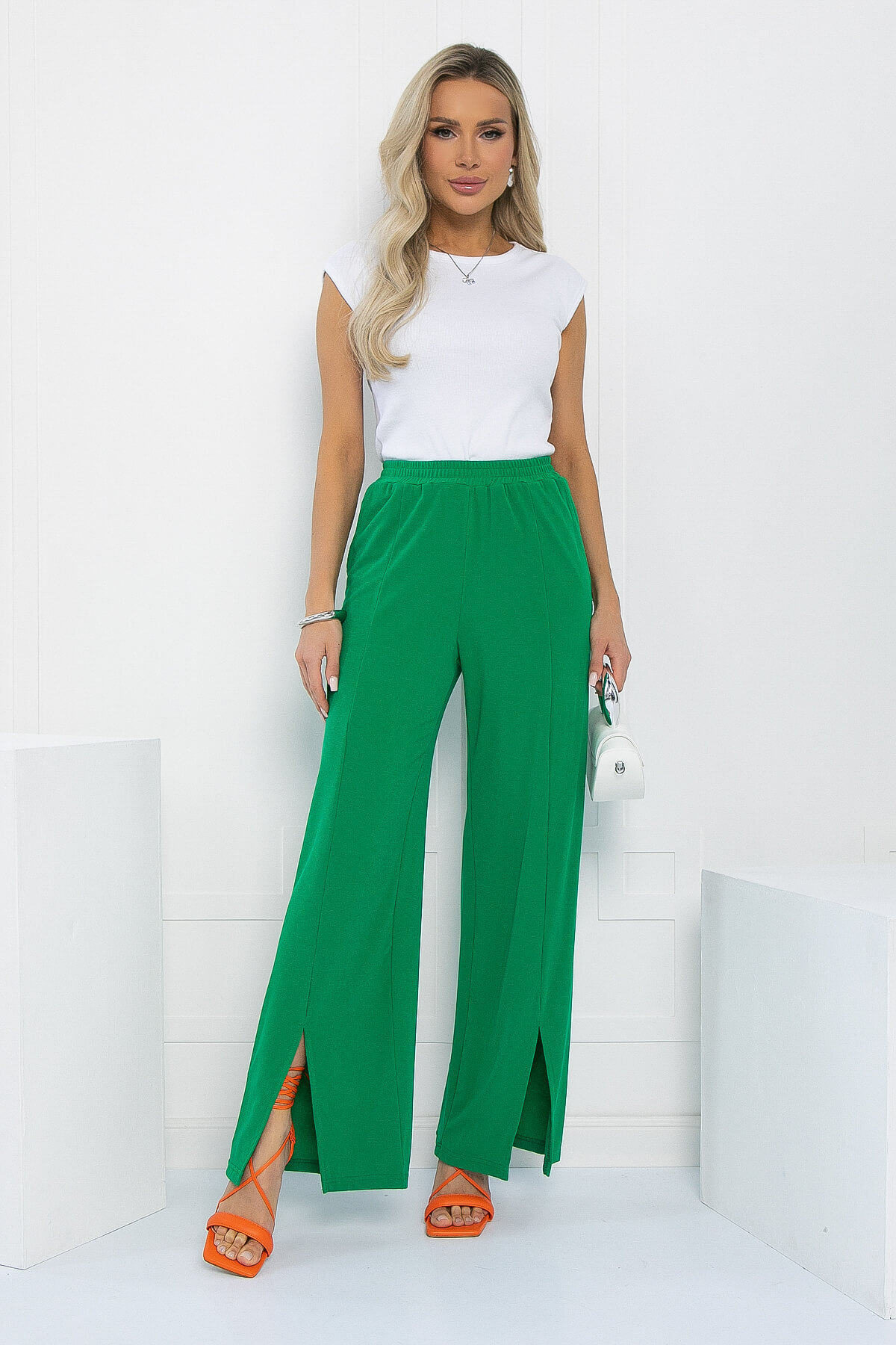 Свободные трикотажные брюки с V-образными разрезами по низу. Пояс притачной с резинкой. На передних половинках карманы. Чтобы совместить в одной базовой вещи гардероба стиль, комфорт и остромодные тенденции, достаточно присмотреться к таким эффектным и очень удобным трикотажным брюкам. V-образный разрез позволит визуально удлинить ноги, приоткрыть стильную обувь и придать эффектную изюминку всему образу.