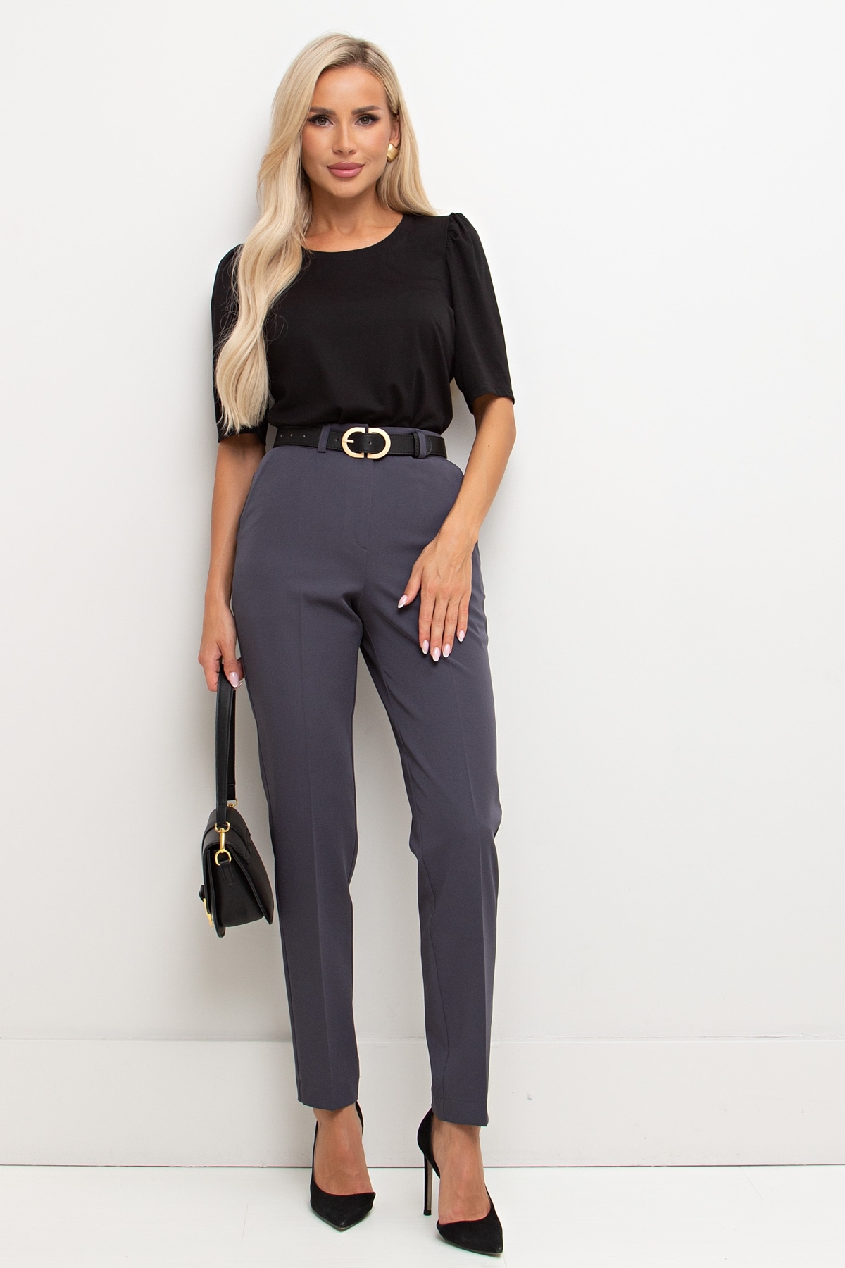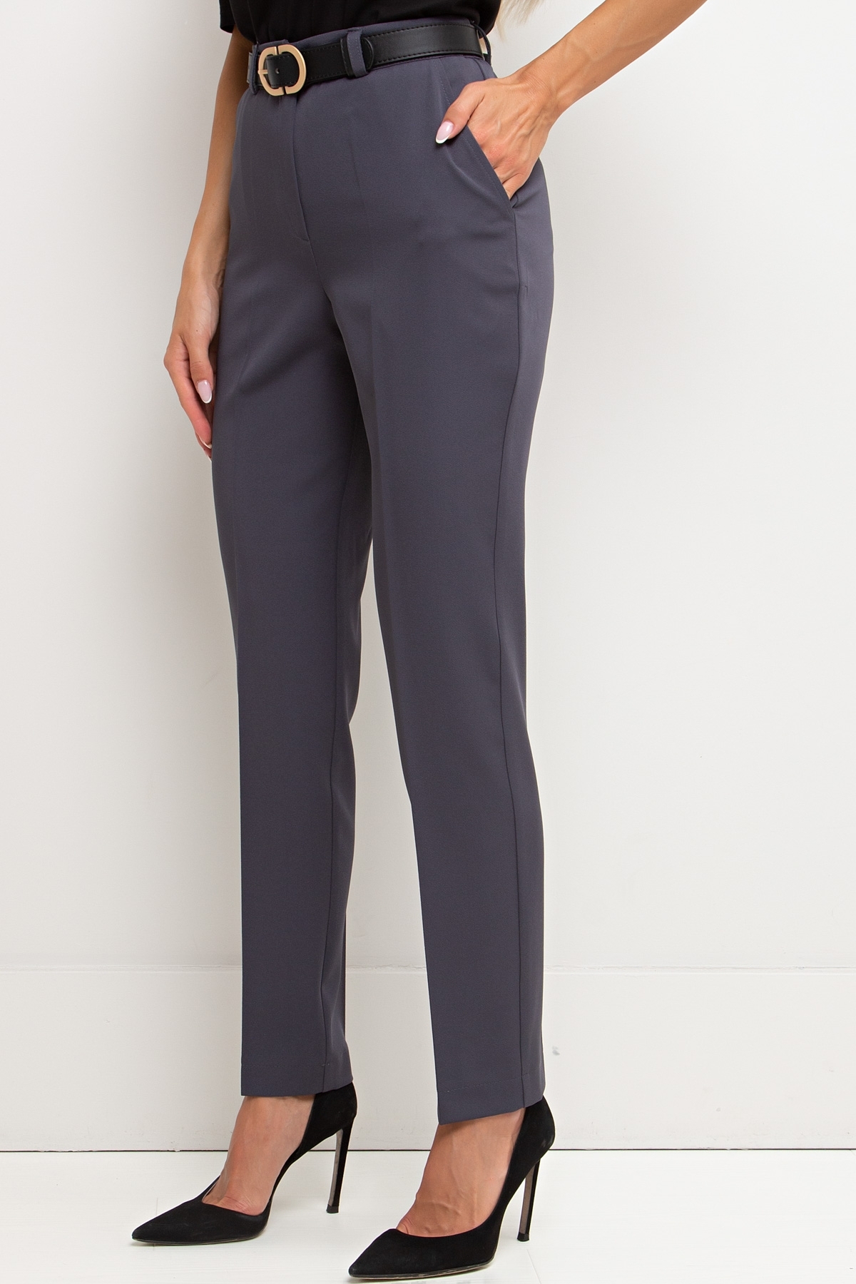 Стильные зауженные брюки из плательно - костюмной ткани, со средней посадкой на талии. Втачной пояс дополнен шлевками под ремень, переходит в застежку-гульфик на молнию и пуговицу. В боковых швах расположены функциональные карманы с отрезным бочком. Отутюженные стрелки идут по всей длине брючин.