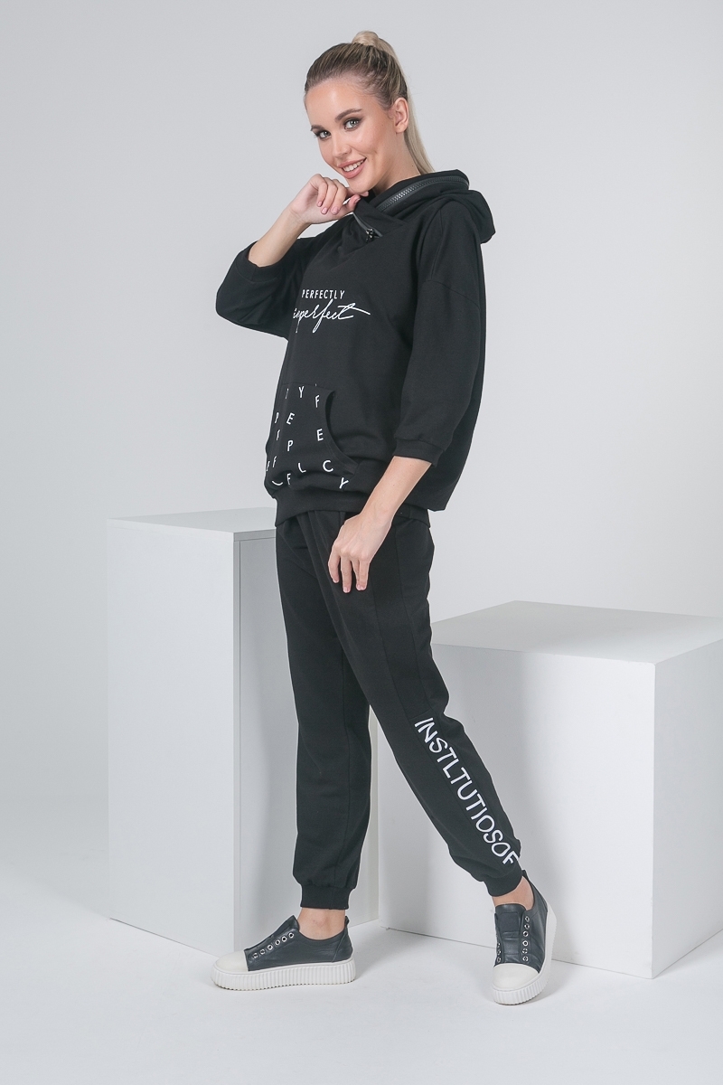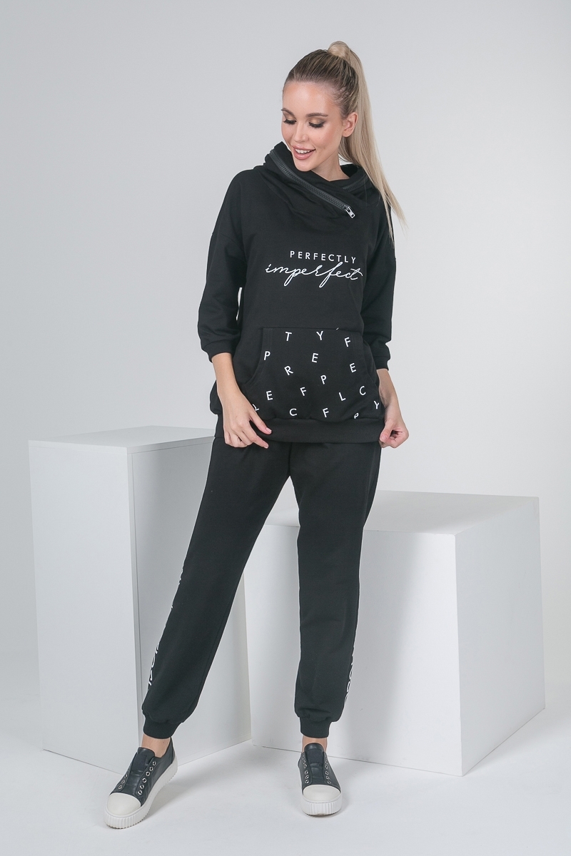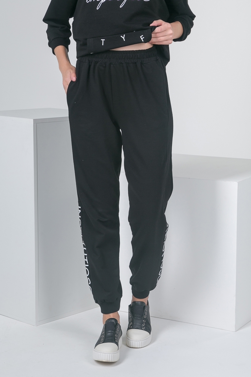 Стильные брюки из трикотажного полотна двунитка. Брюки с комфортной посадкой на талии, которую обеспечивает эластичный пояс на резинке, оканчивается притачной манжетой. Боковой шов дополнен стачными лампасами с принтом.