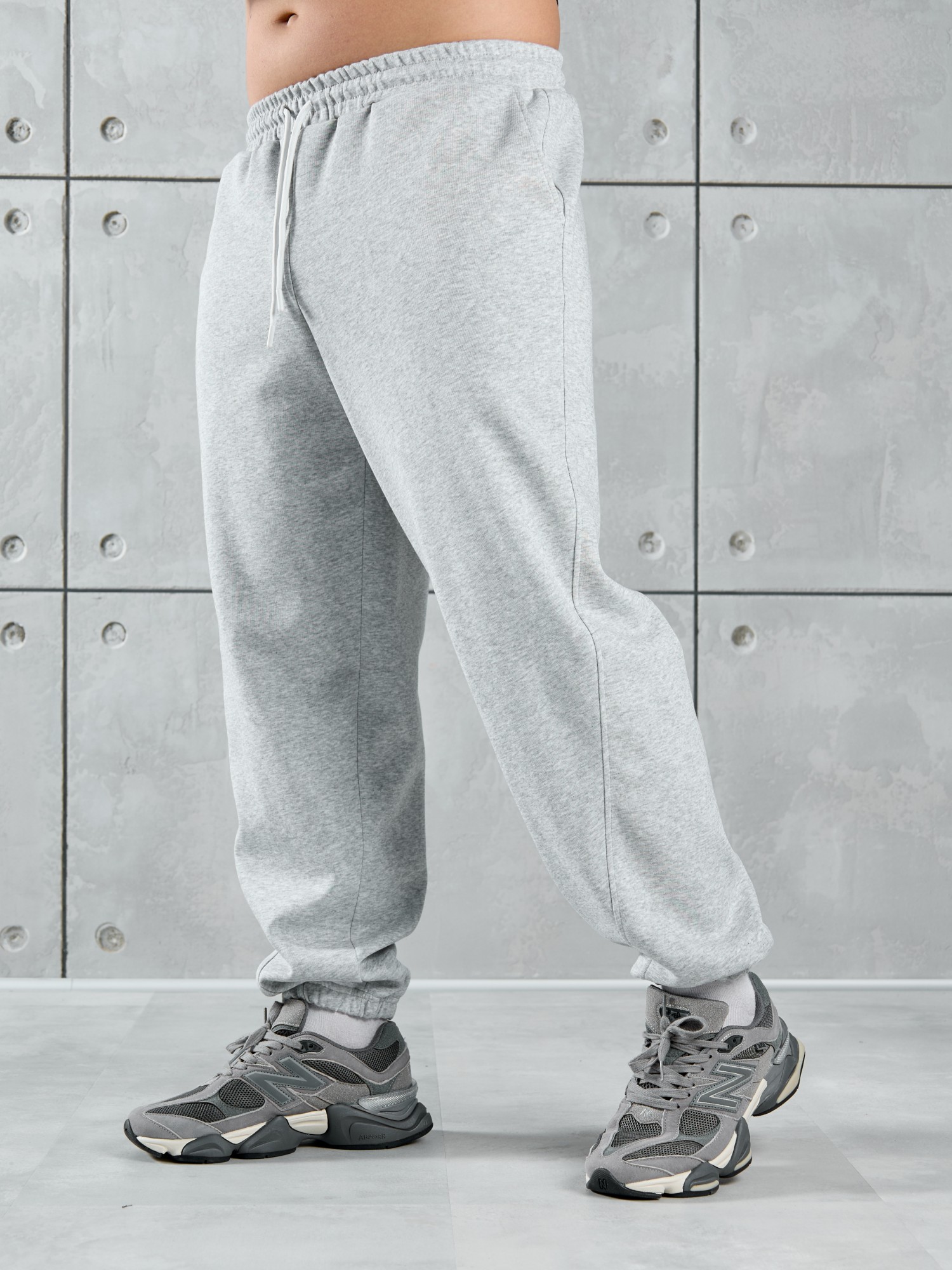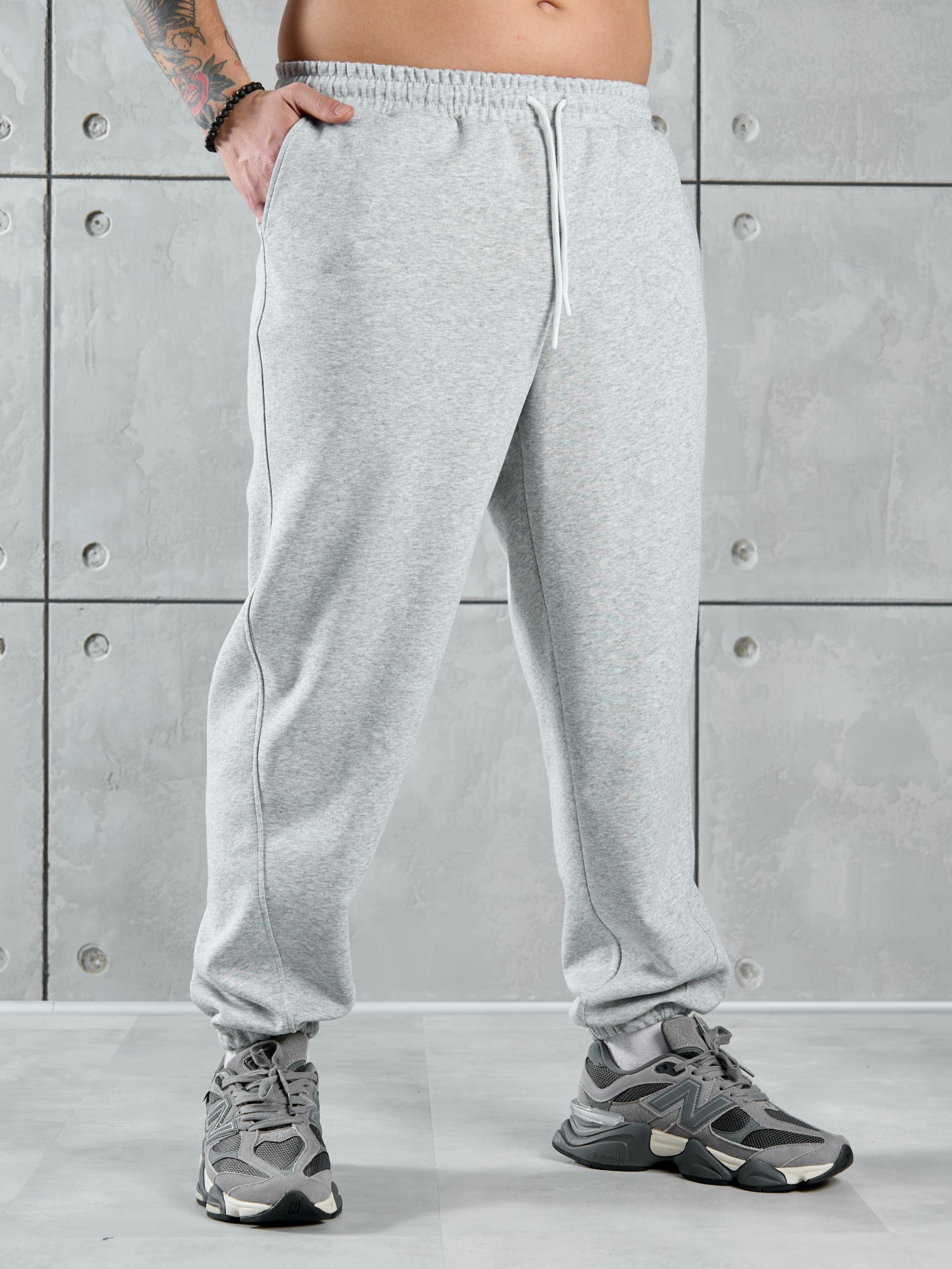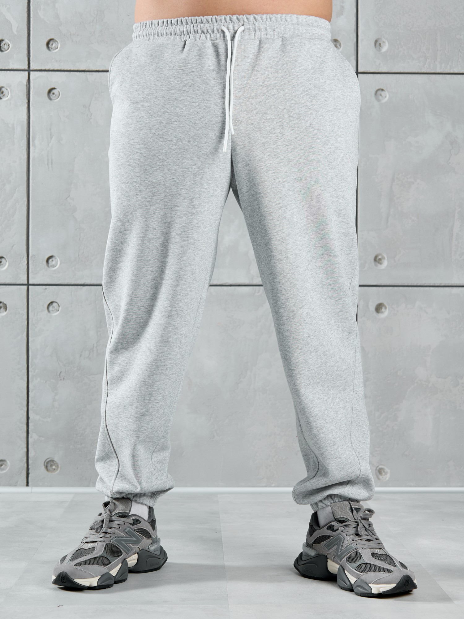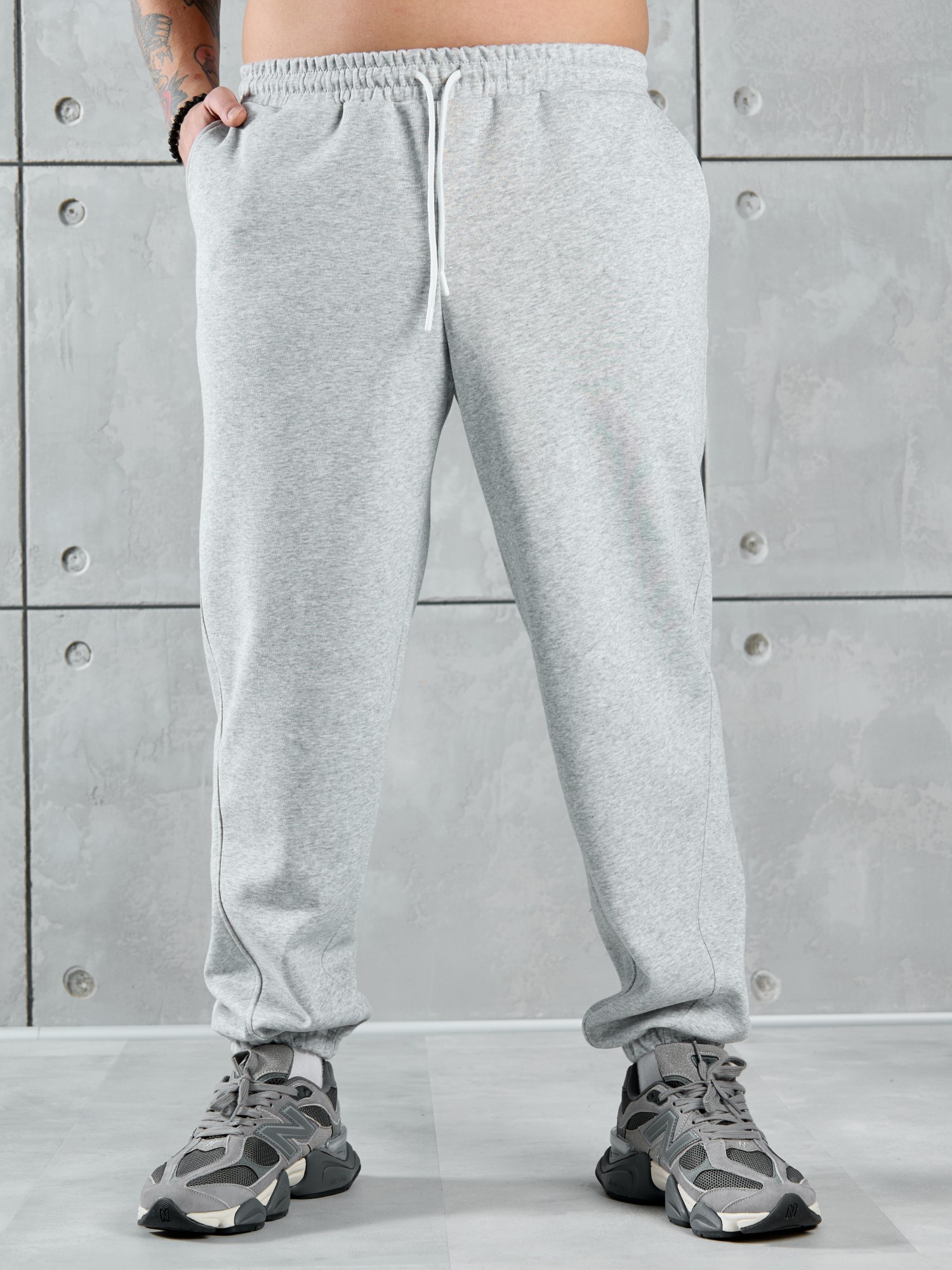 Брюки мужские из трикотажного полотна "лининг" свободного покроя, со смещенными к центрам передних половин боковыми швами, карманами в боковых швах и притачным поясом с эластичной тесьмой внутри. Нижние срезы обработаны подгибкой с эластичной тесьмой. Для регулирования степени прилегания изделия по талии предусмотрен шнурок, вставленный через две обметанные петли в центре пояса спереди.