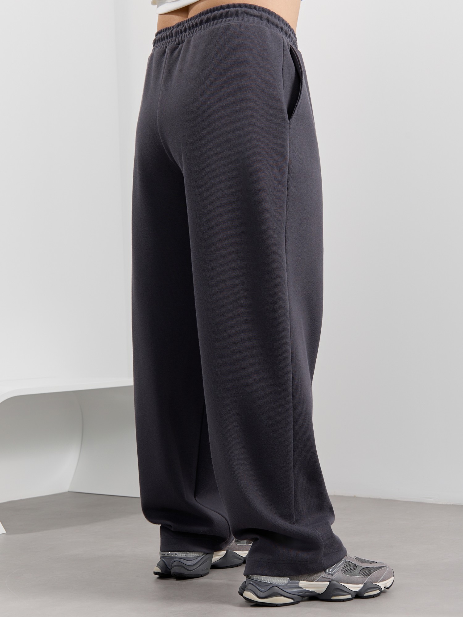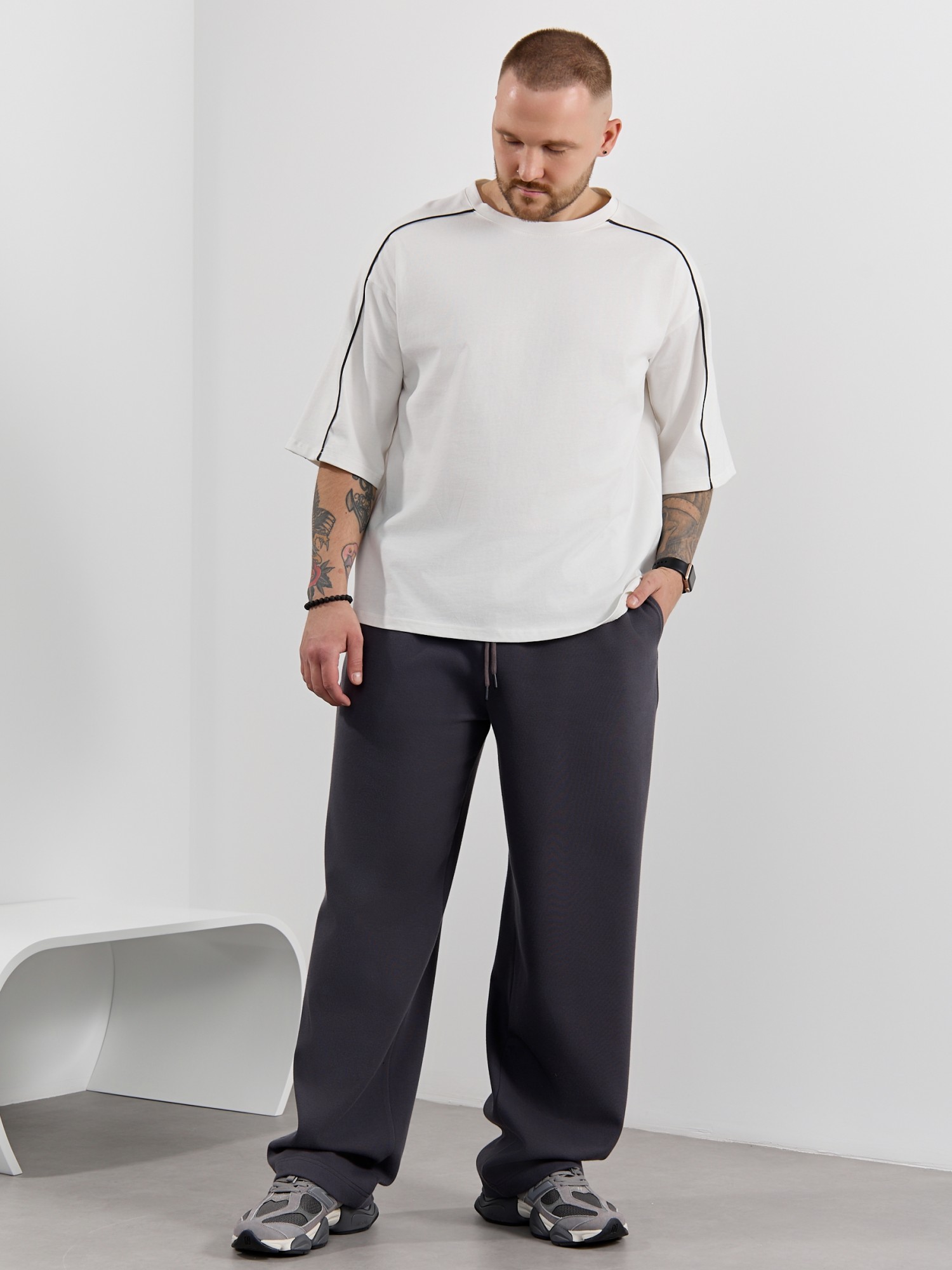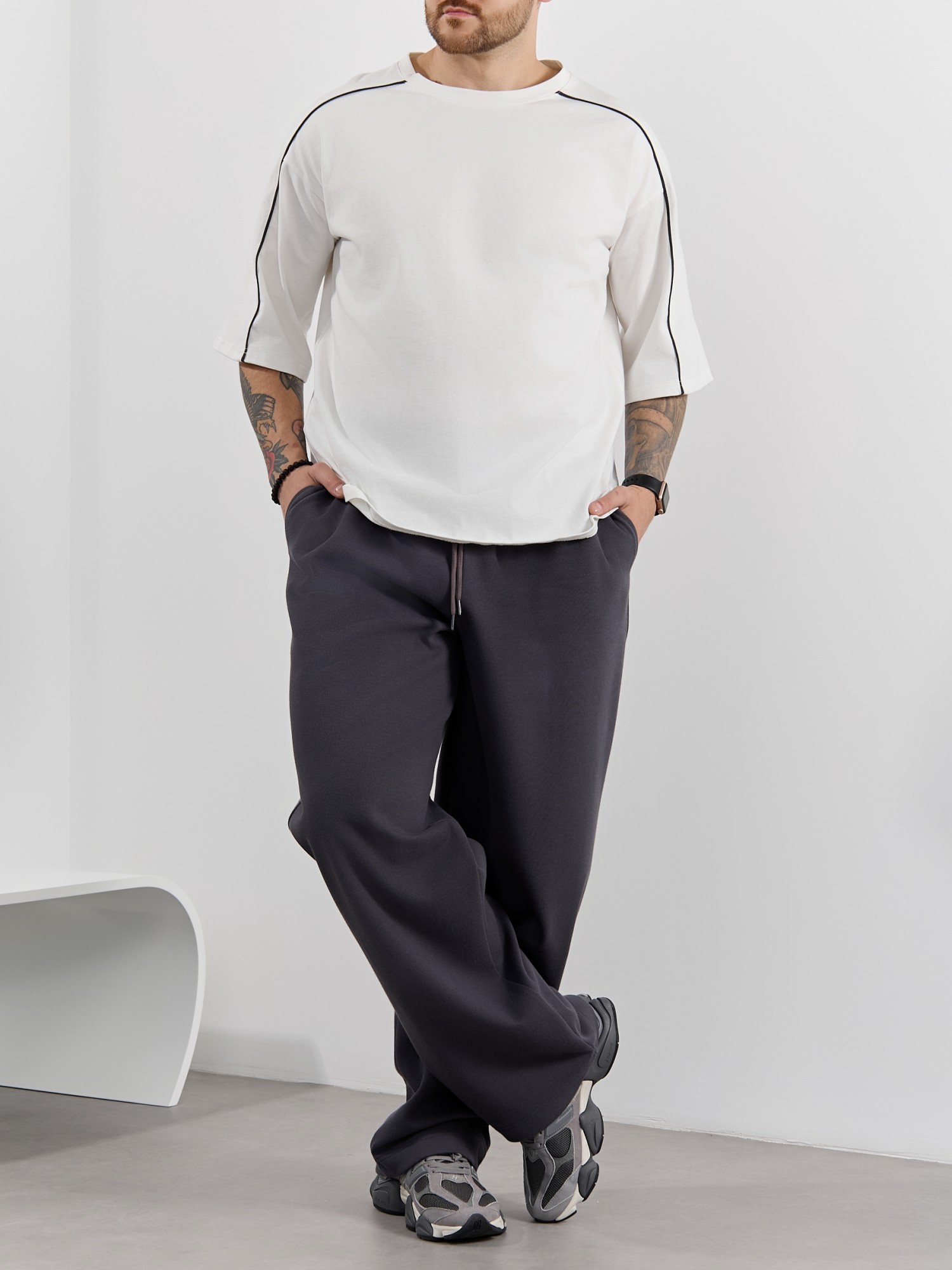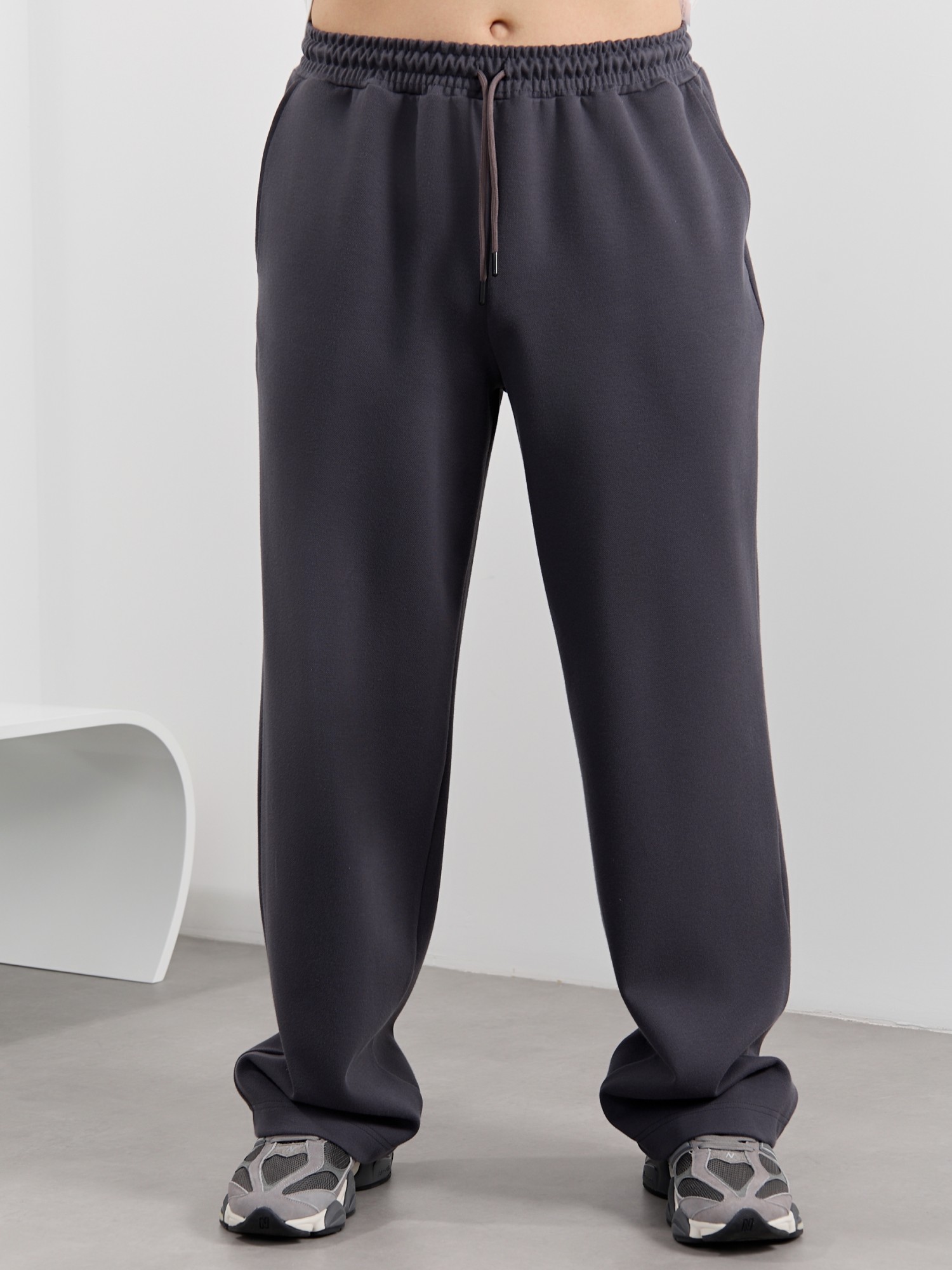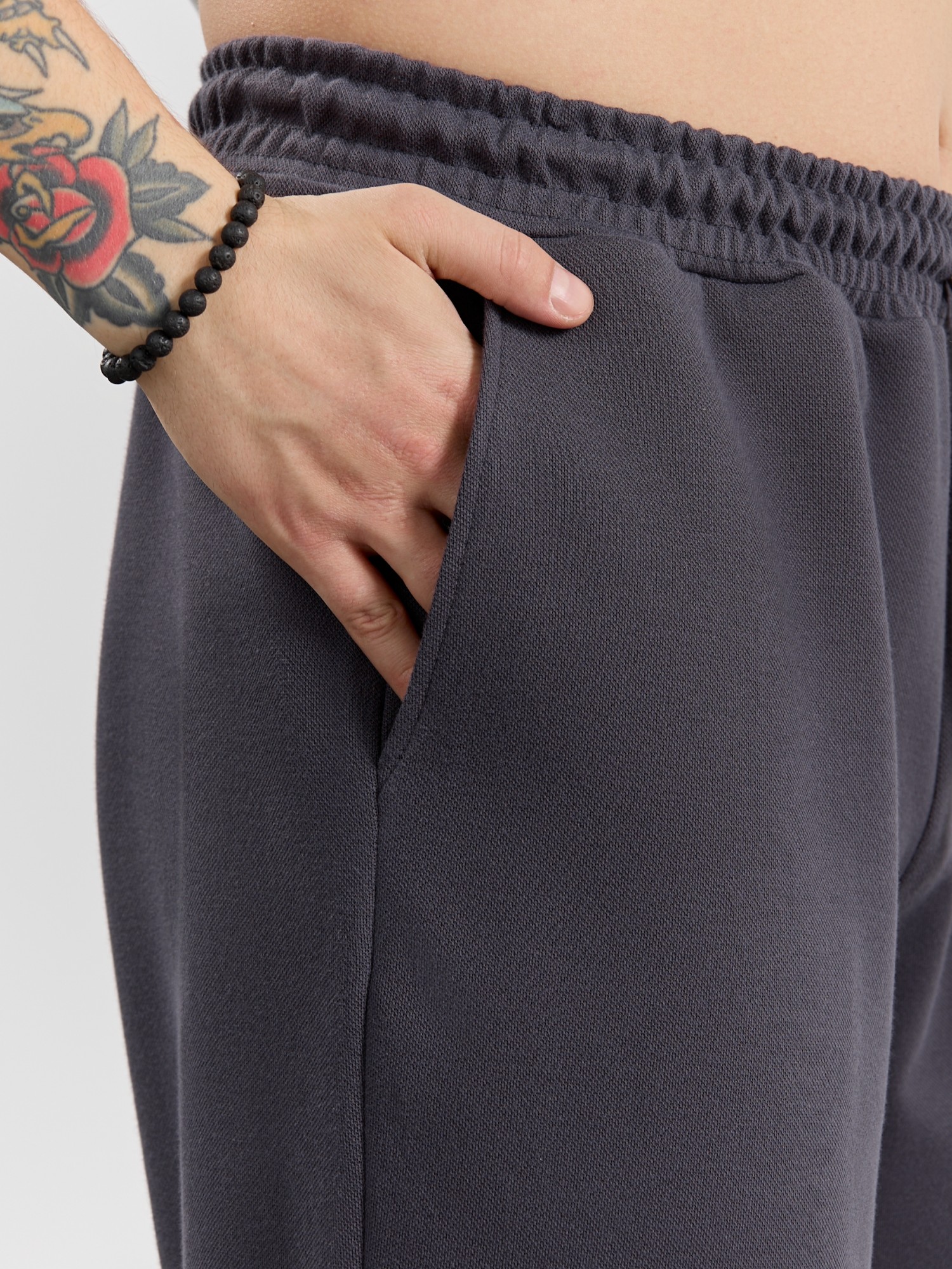 Брюки мужские из трикотажного полотна "интерлок-пике", на притачном поясе с эластичной тесьмой внутри, с карманами в боковых швах. Низ брюк прямой с подгибкой. Для регулирования степени прилегания изделия по линии талии предусмотрен декоративный шнурок, вставленный в пояс и продетый через две обметанные петли в центре.