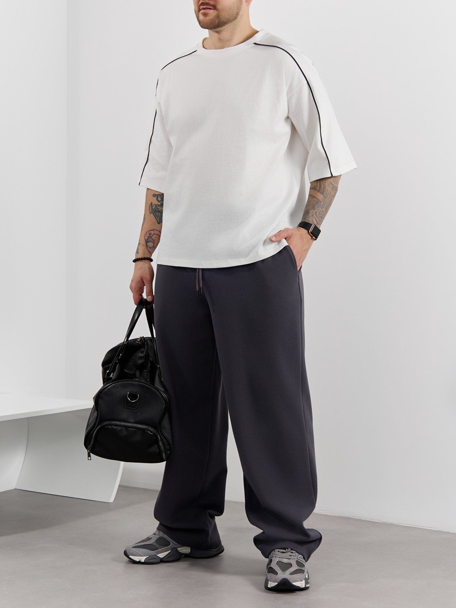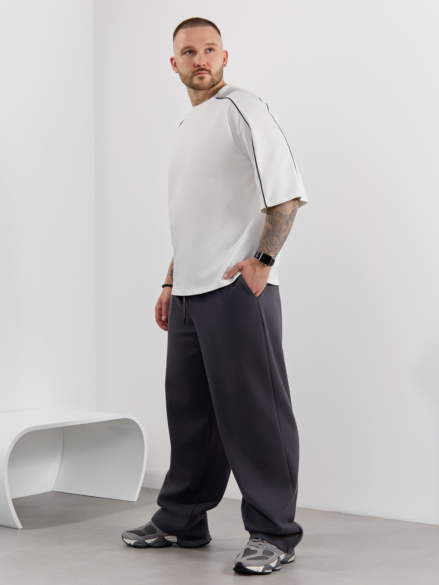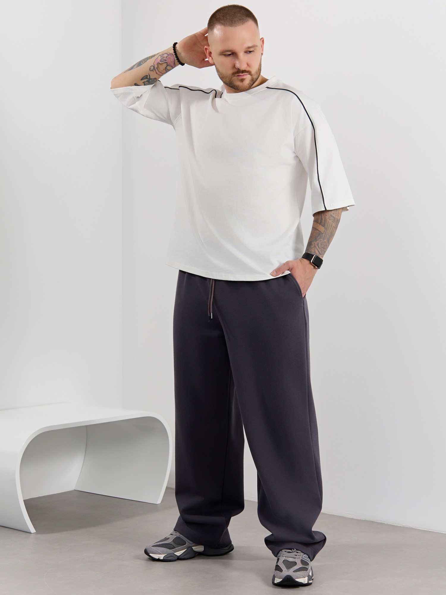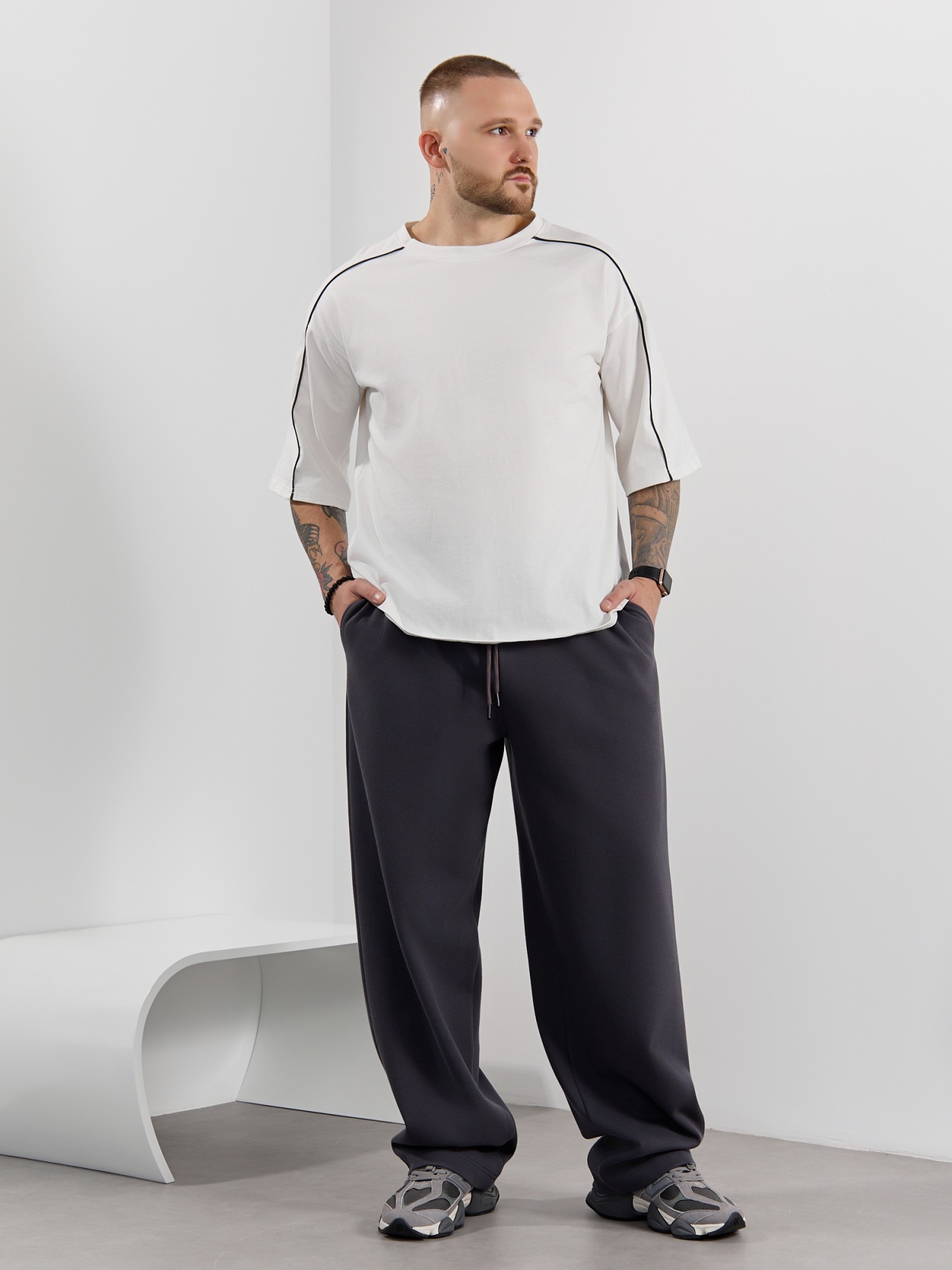Брюки мужские из трикотажного полотна "интерлок-пике", на притачном поясе с эластичной тесьмой внутри, с карманами в боковых швах. Низ брюк прямой с подгибкой. Для регулирования степени прилегания изделия по линии талии предусмотрен декоративный шнурок, вставленный в пояс и продетый через две обметанные петли в центре.