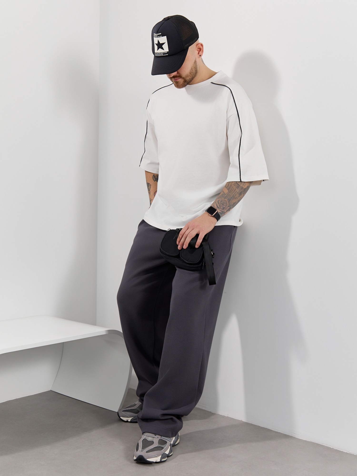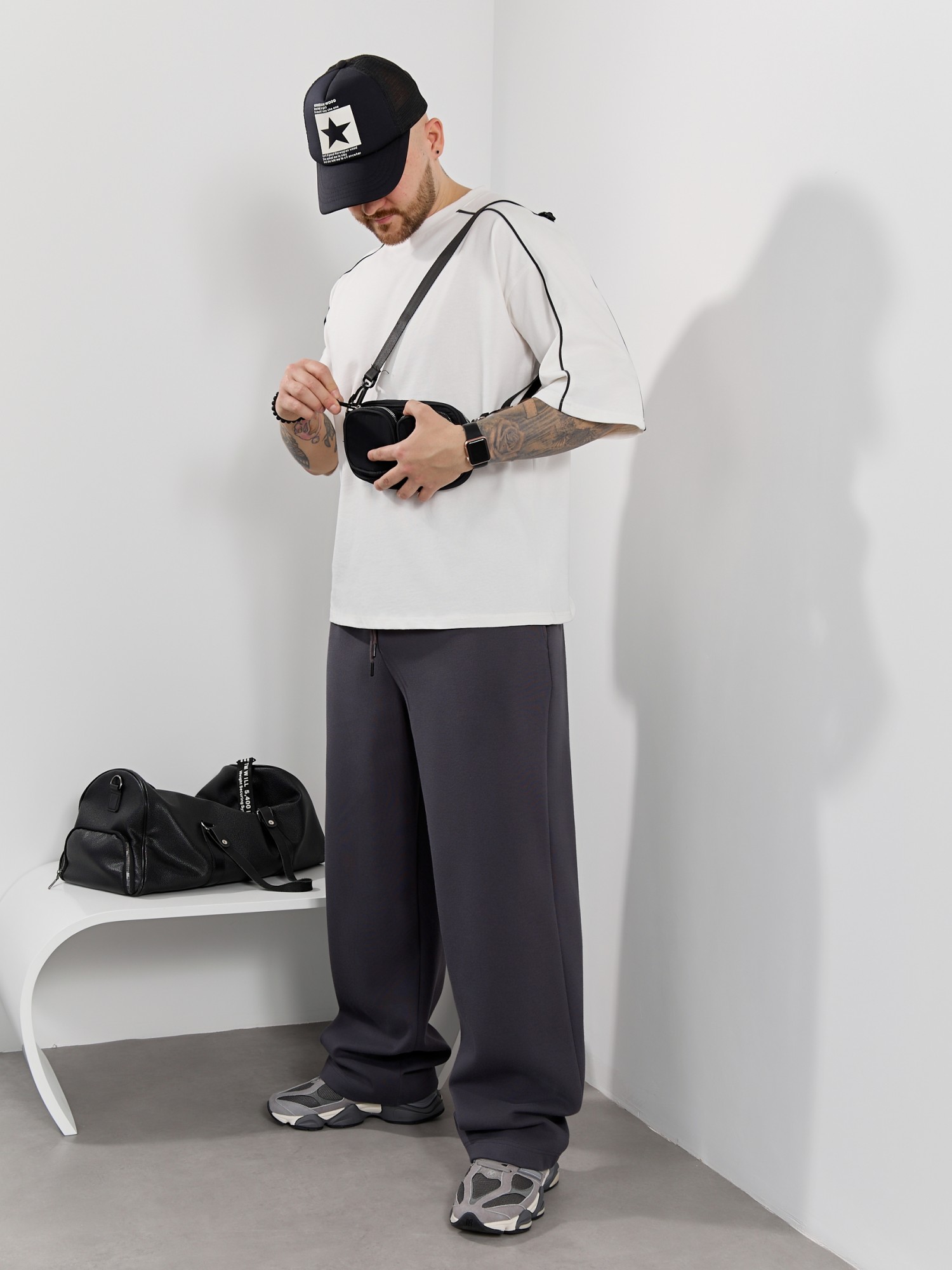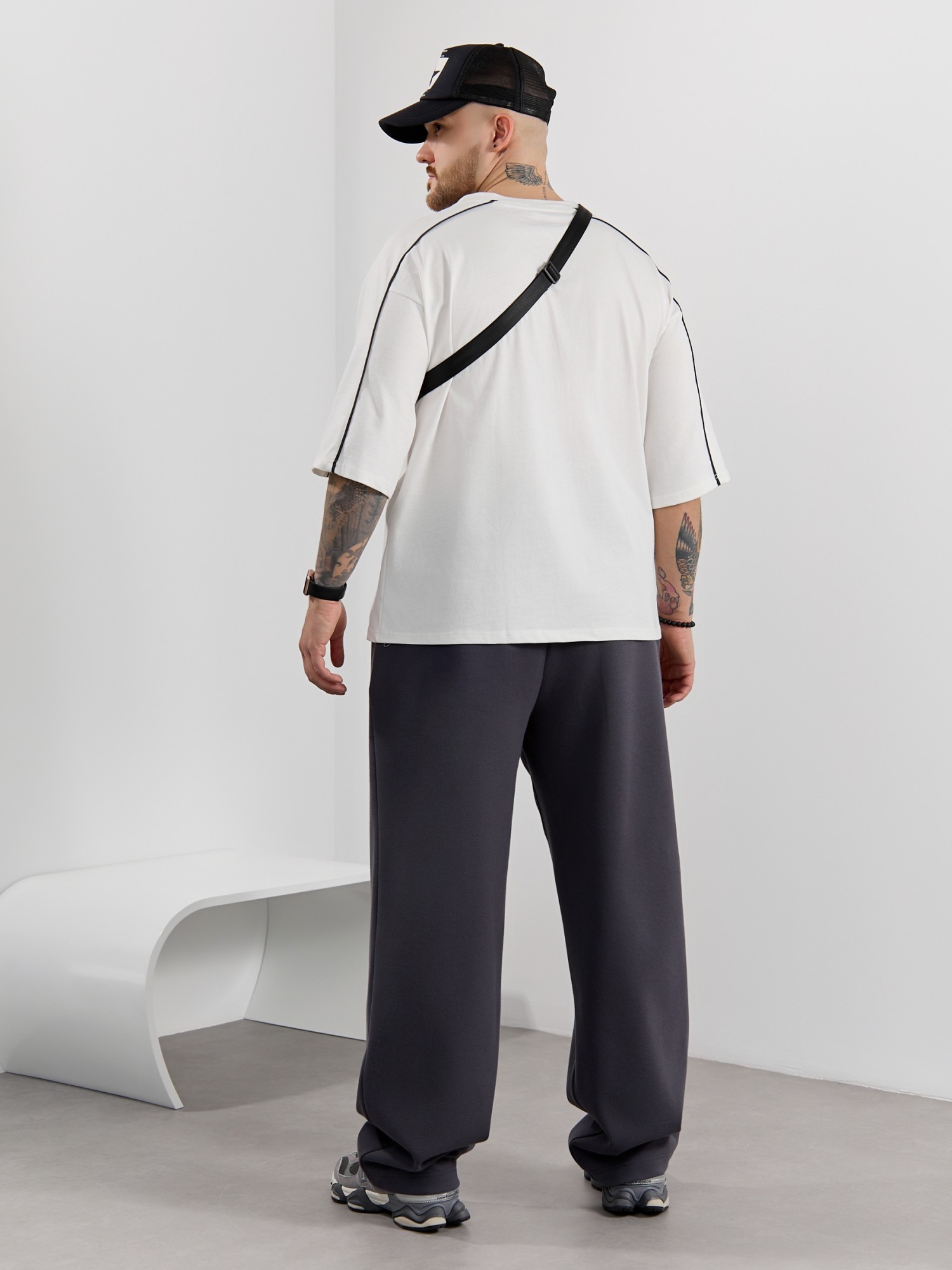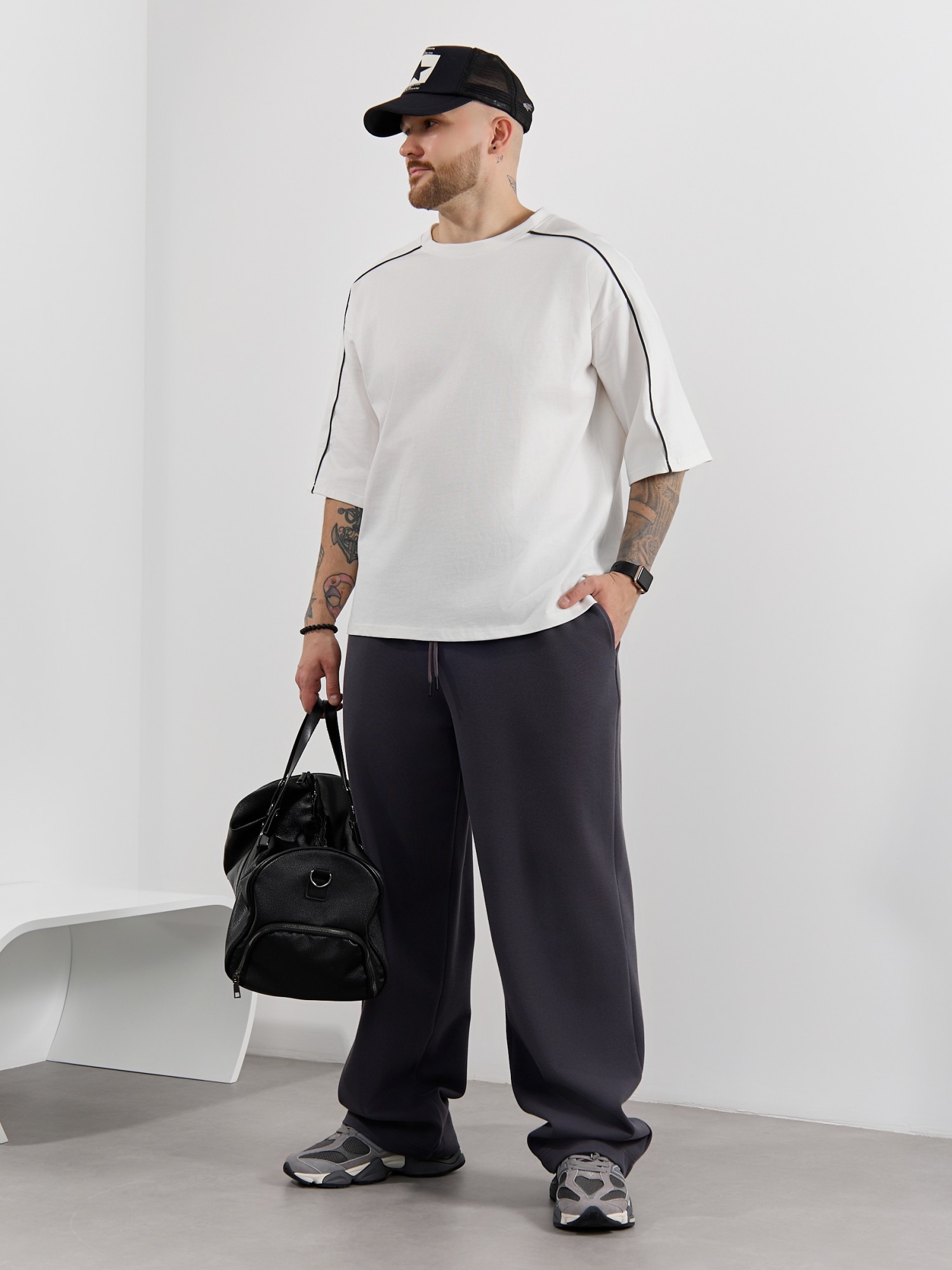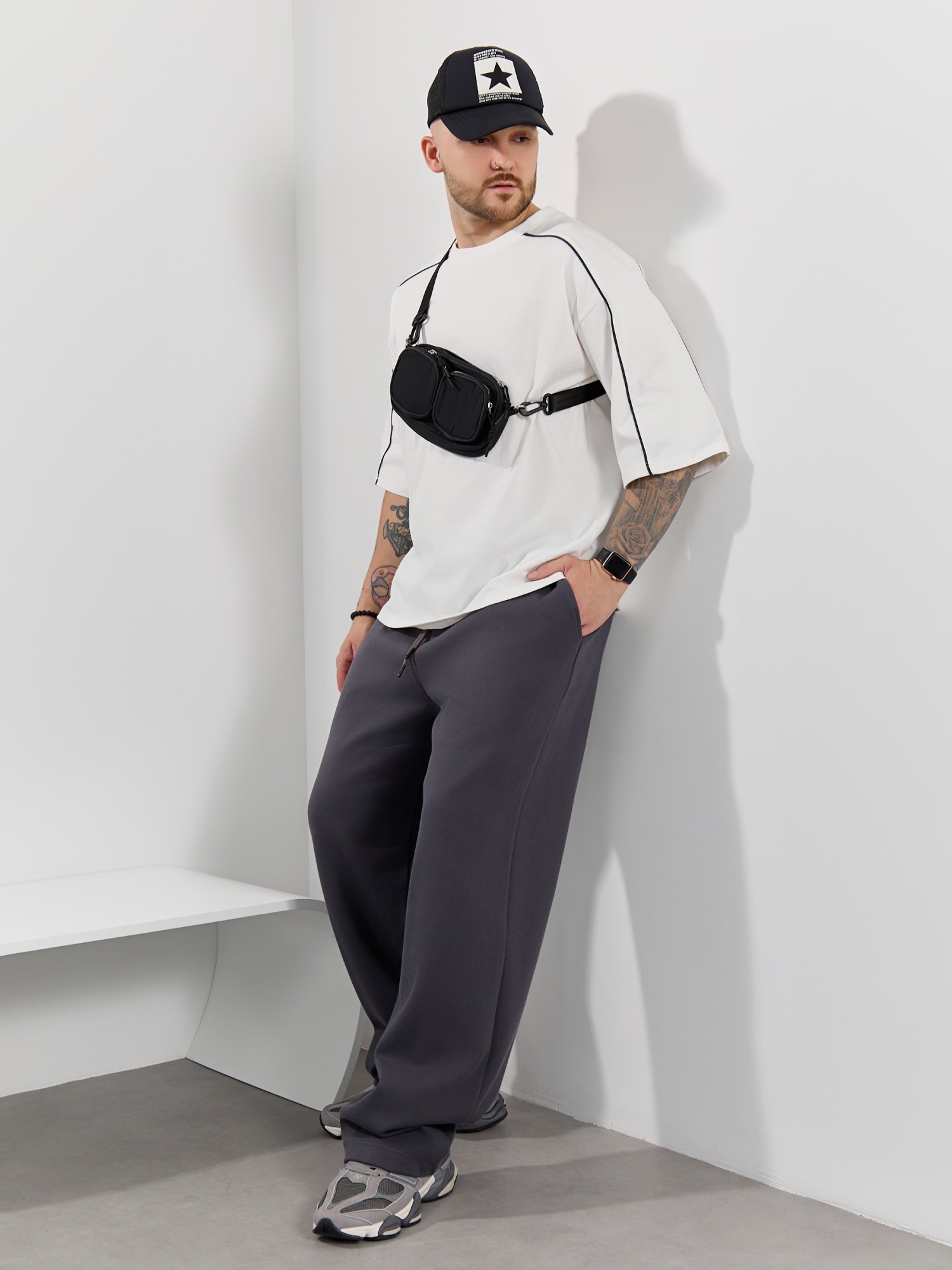 Брюки мужские из трикотажного полотна "интерлок-пике", на притачном поясе с эластичной тесьмой внутри, с карманами в боковых швах. Низ брюк прямой с подгибкой. Для регулирования степени прилегания изделия по линии талии предусмотрен декоративный шнурок, вставленный в пояс и продетый через две обметанные петли в центре.