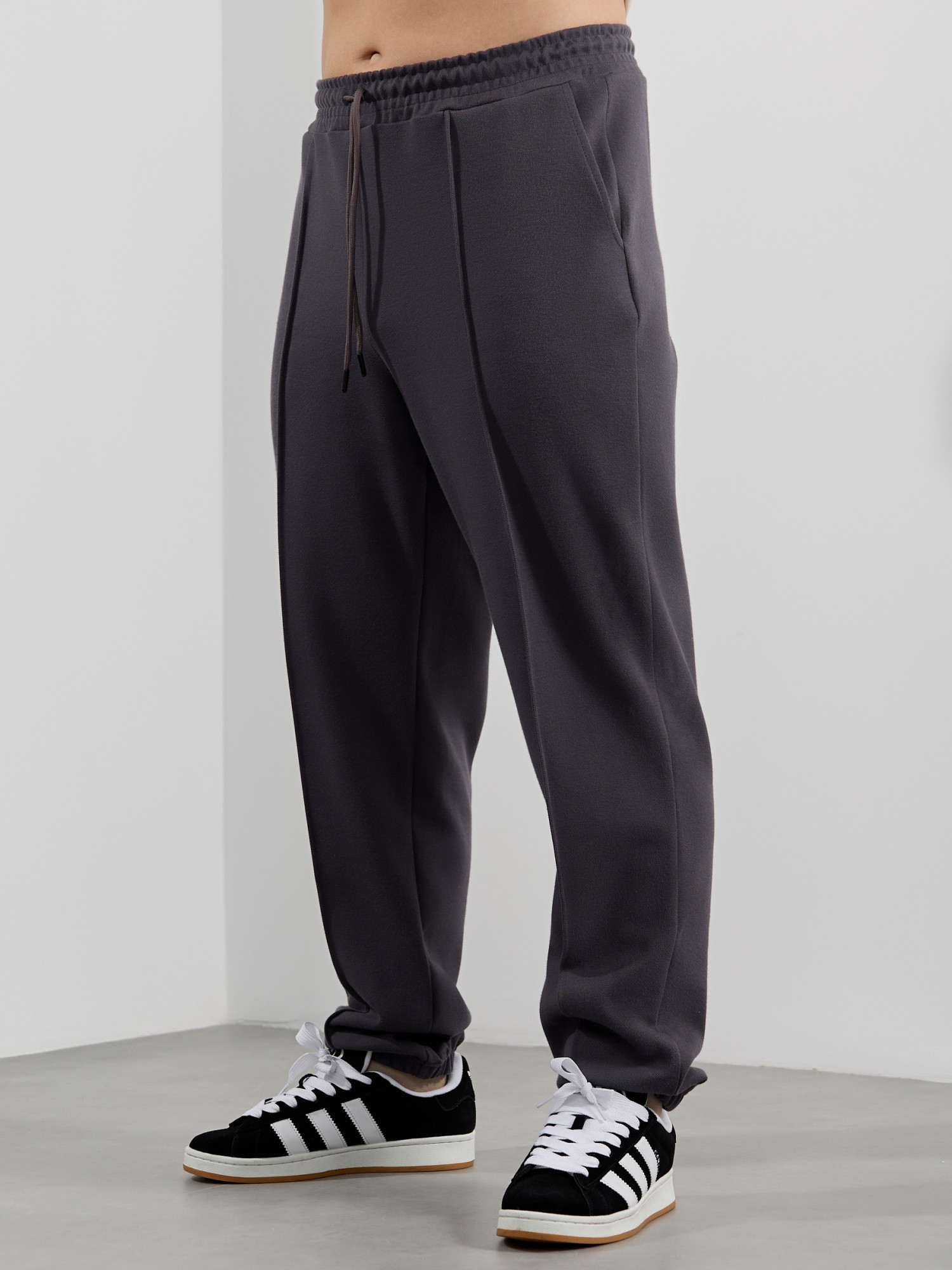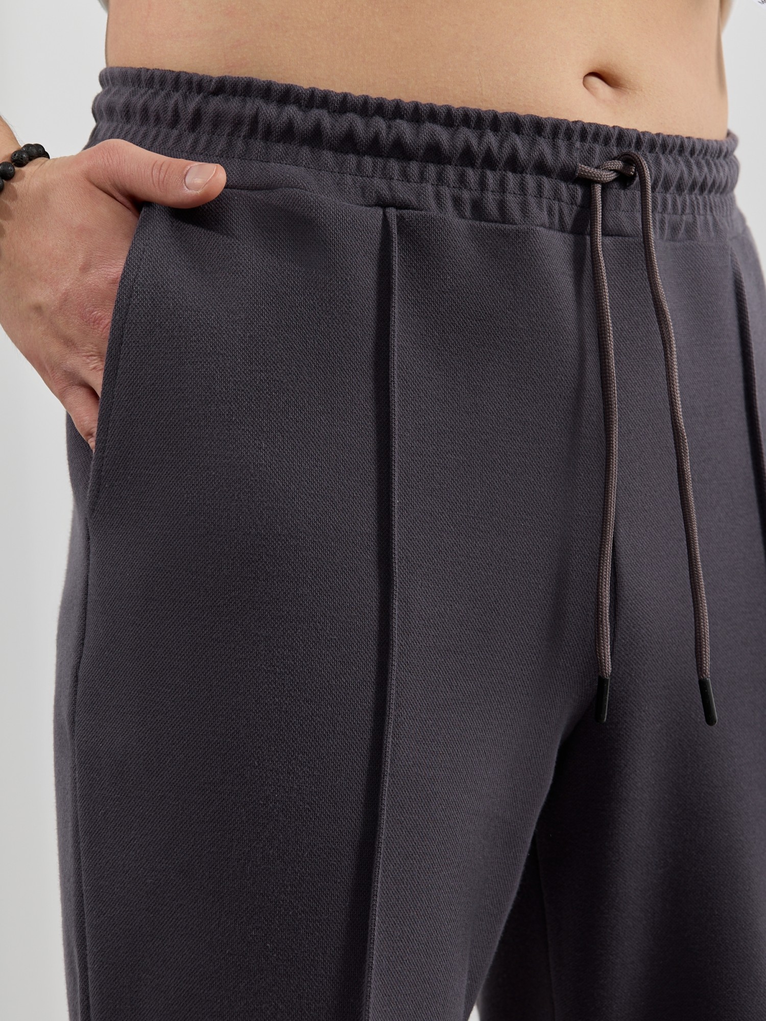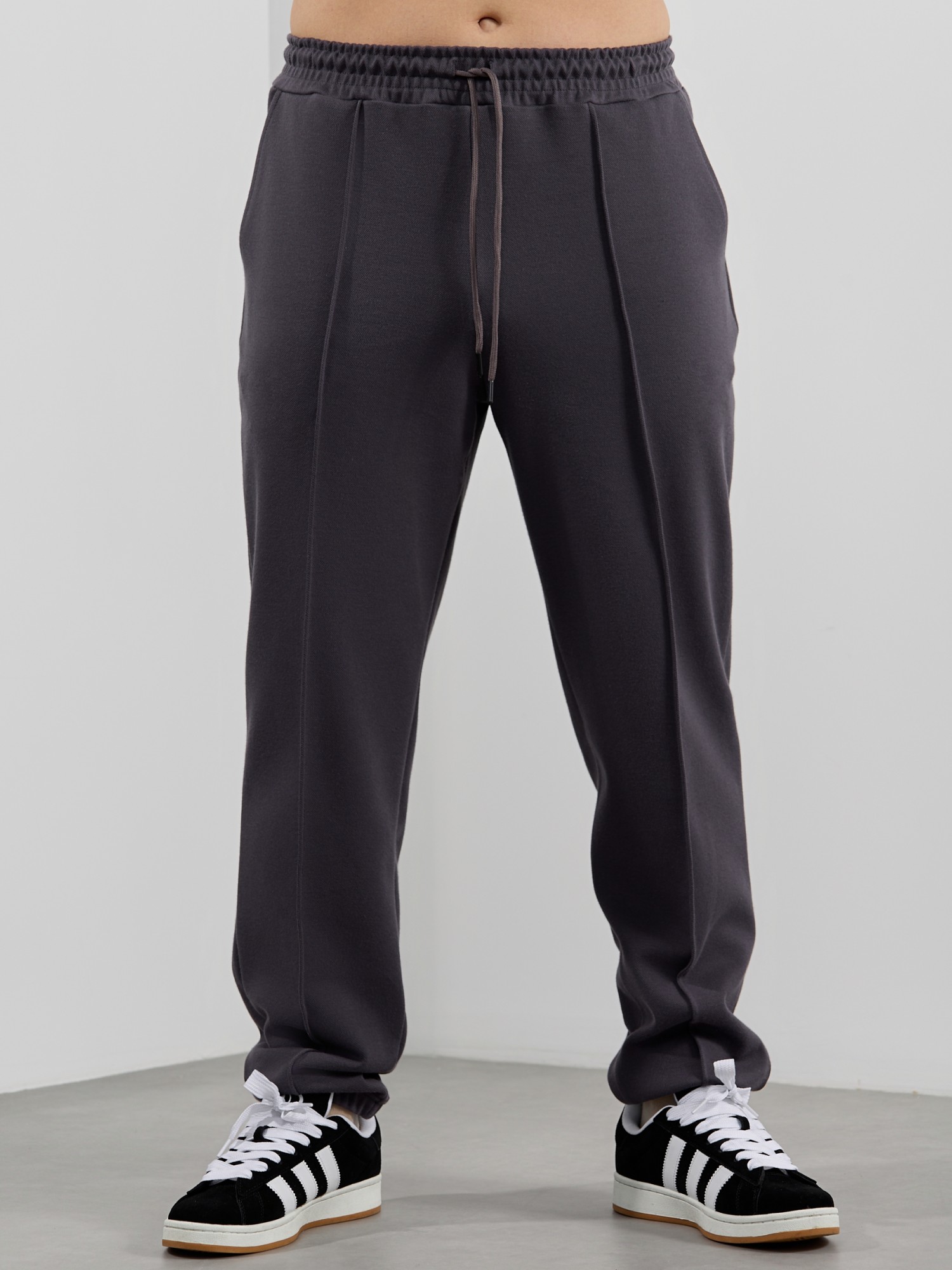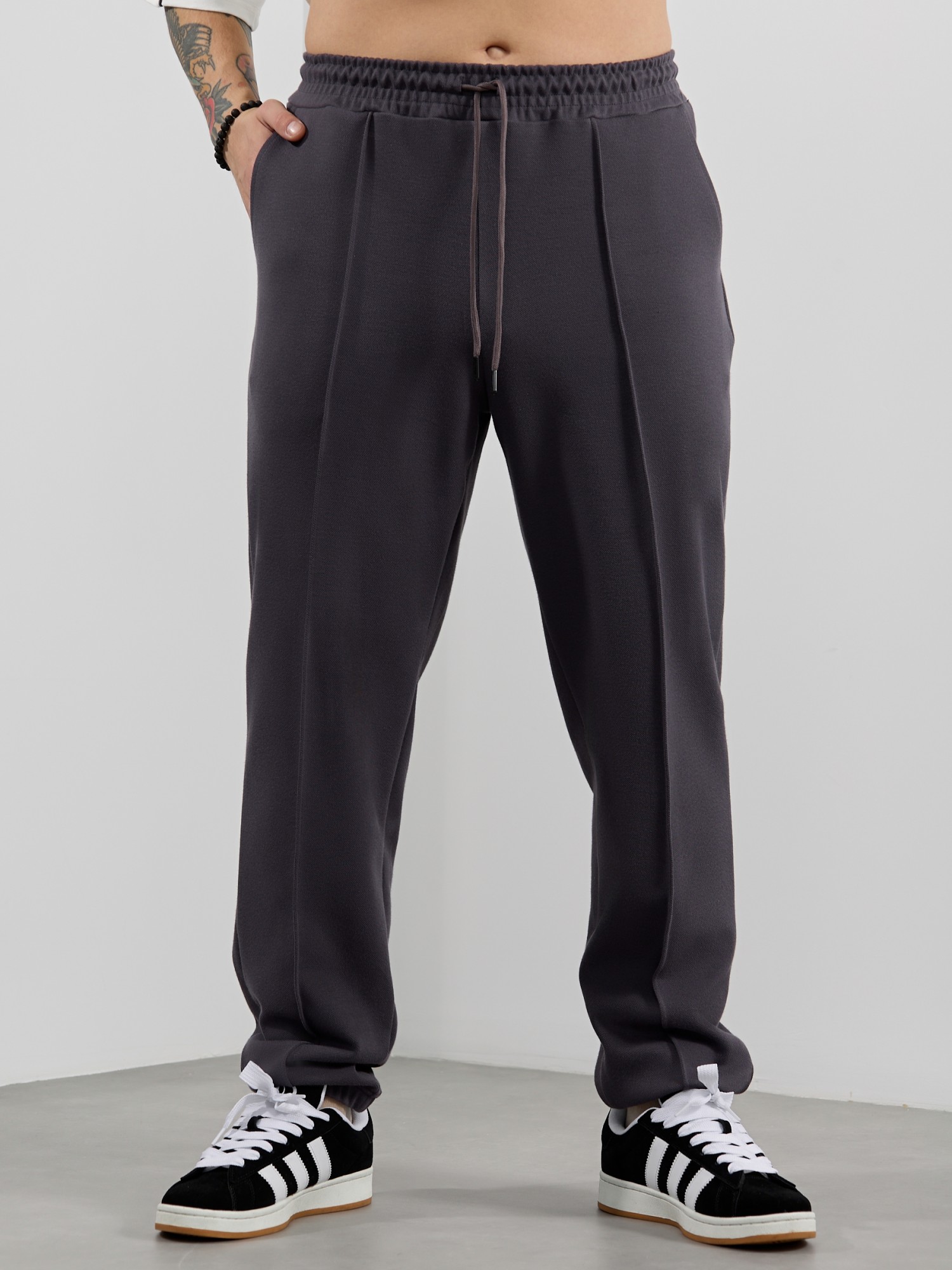Брюки мужские из трикотажного полотна "интерлок-пике", на притачном поясе с эластичной тесьмой внутри, с карманами в боковых швах. По центру передних половинок расположены стрелки, закрепленные отделочной строчкой. Нижние срезы обработаны подгибкой с эластичной тесьмой. Для регулирования степени прилегания изделия по линии талии предусмотрен декоративный шнурок, вставленный в пояс и продетый через две обметанные петли в центре.