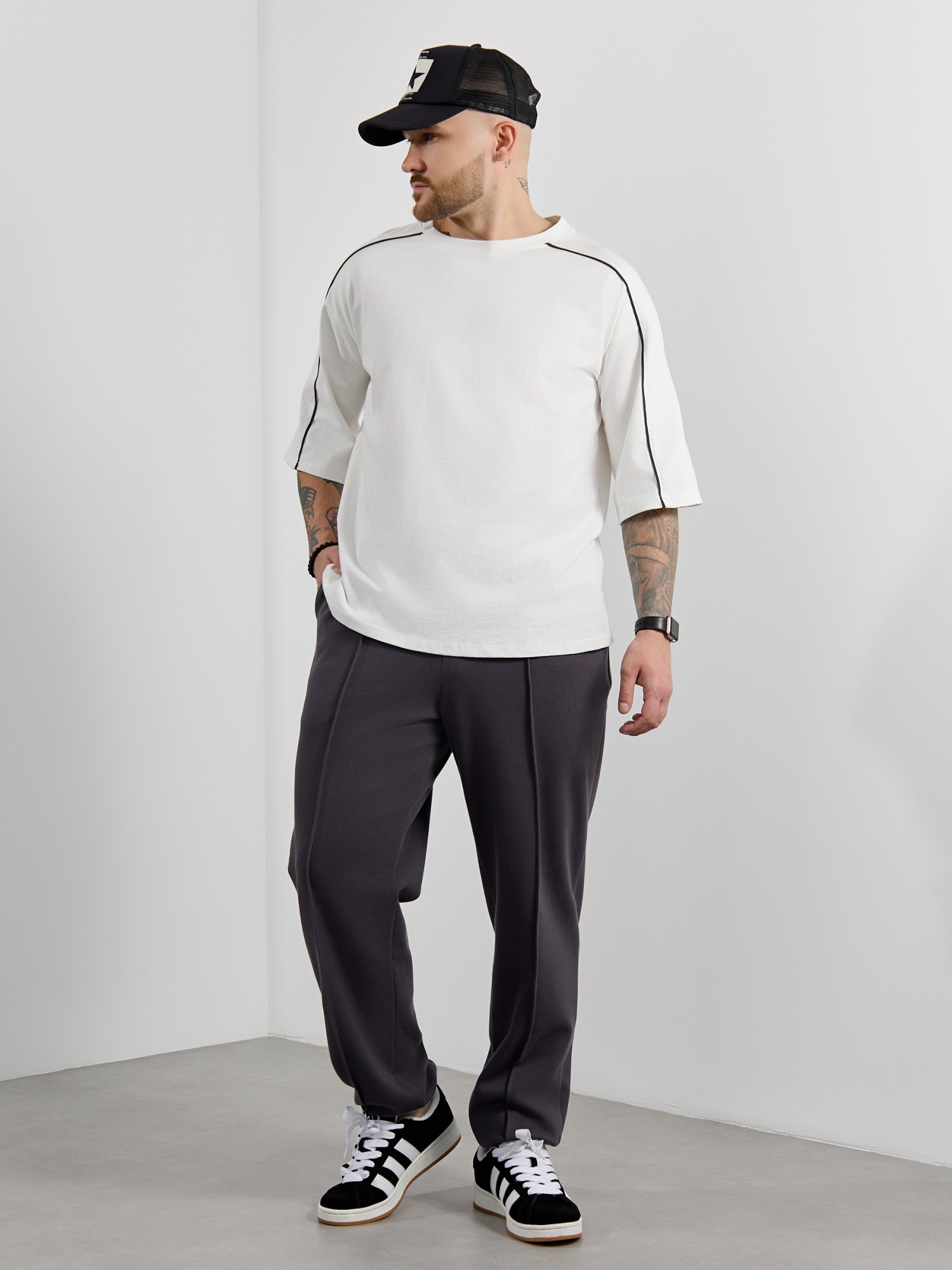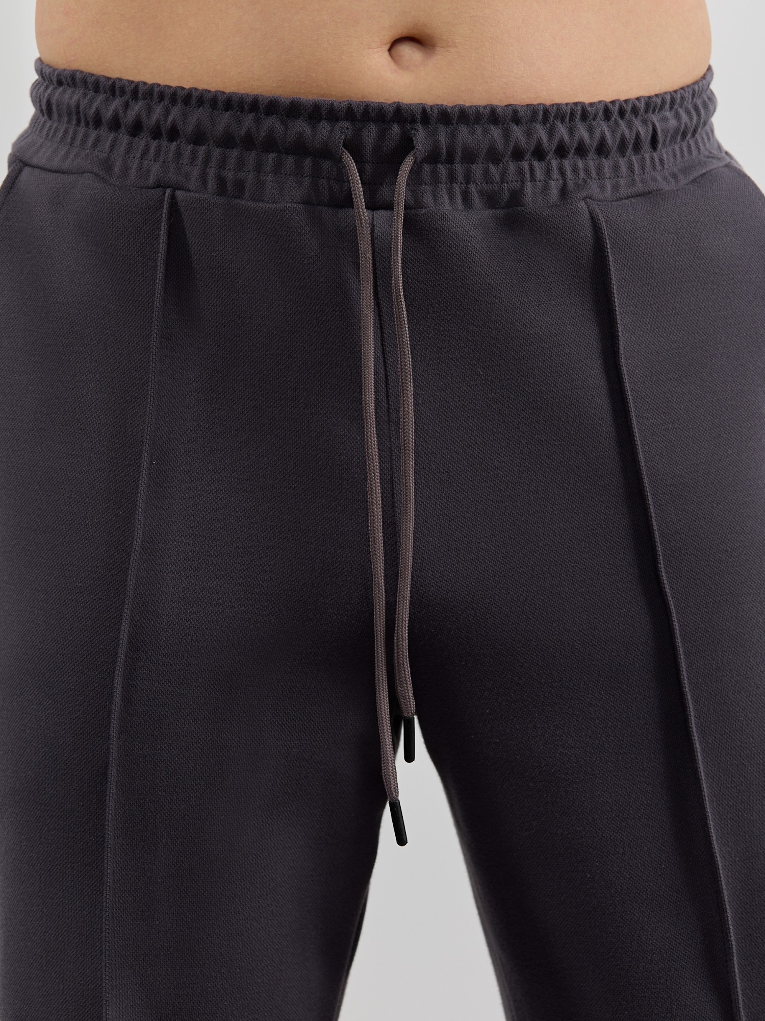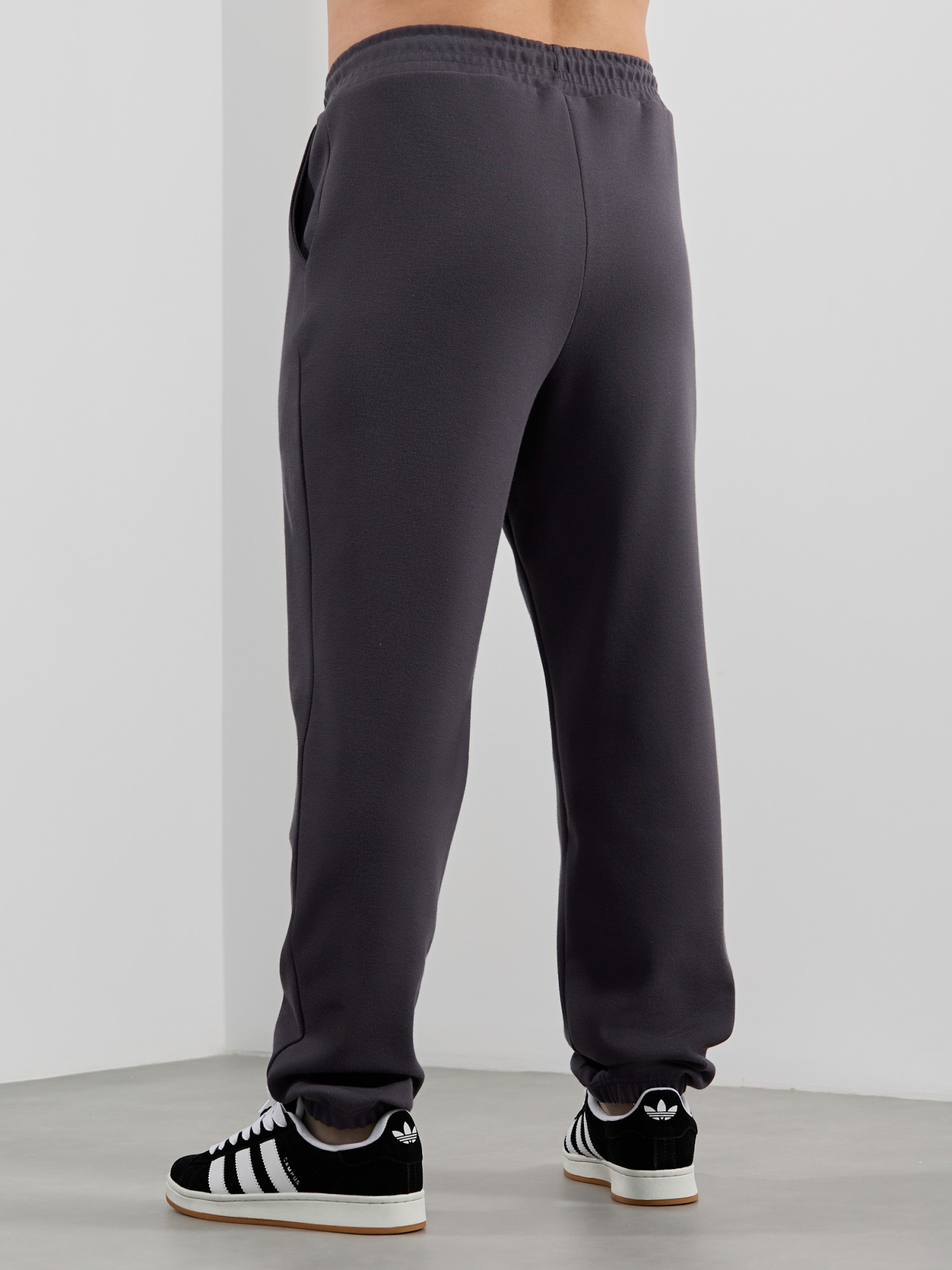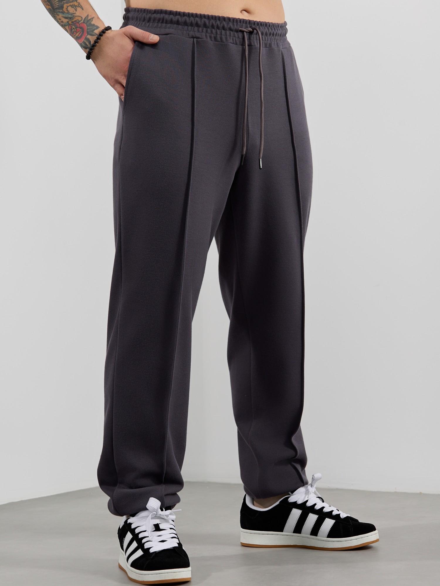 Брюки мужские из трикотажного полотна "интерлок-пике", на притачном поясе с эластичной тесьмой внутри, с карманами в боковых швах. По центру передних половинок расположены стрелки, закрепленные отделочной строчкой. Нижние срезы обработаны подгибкой с эластичной тесьмой. Для регулирования степени прилегания изделия по линии талии предусмотрен декоративный шнурок, вставленный в пояс и продетый через две обметанные петли в центре.