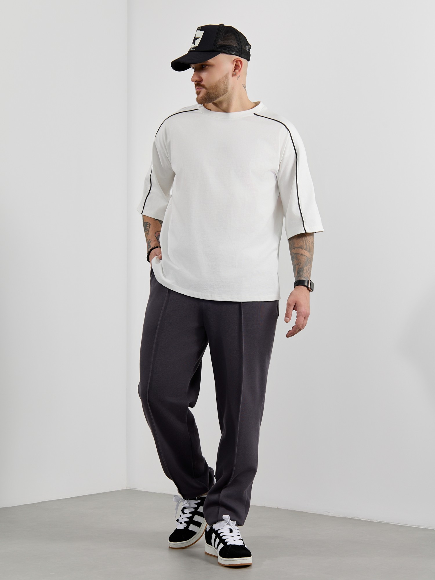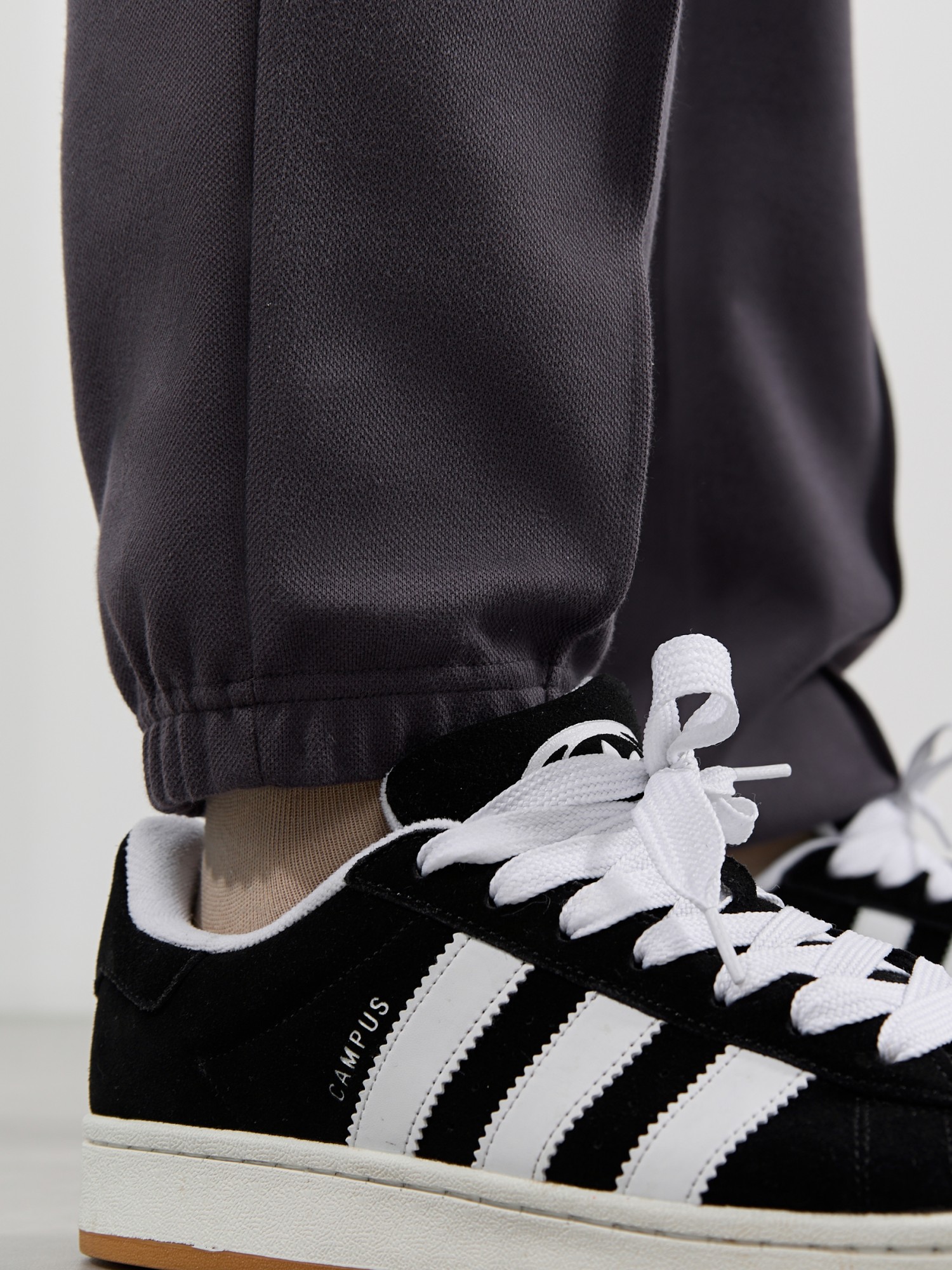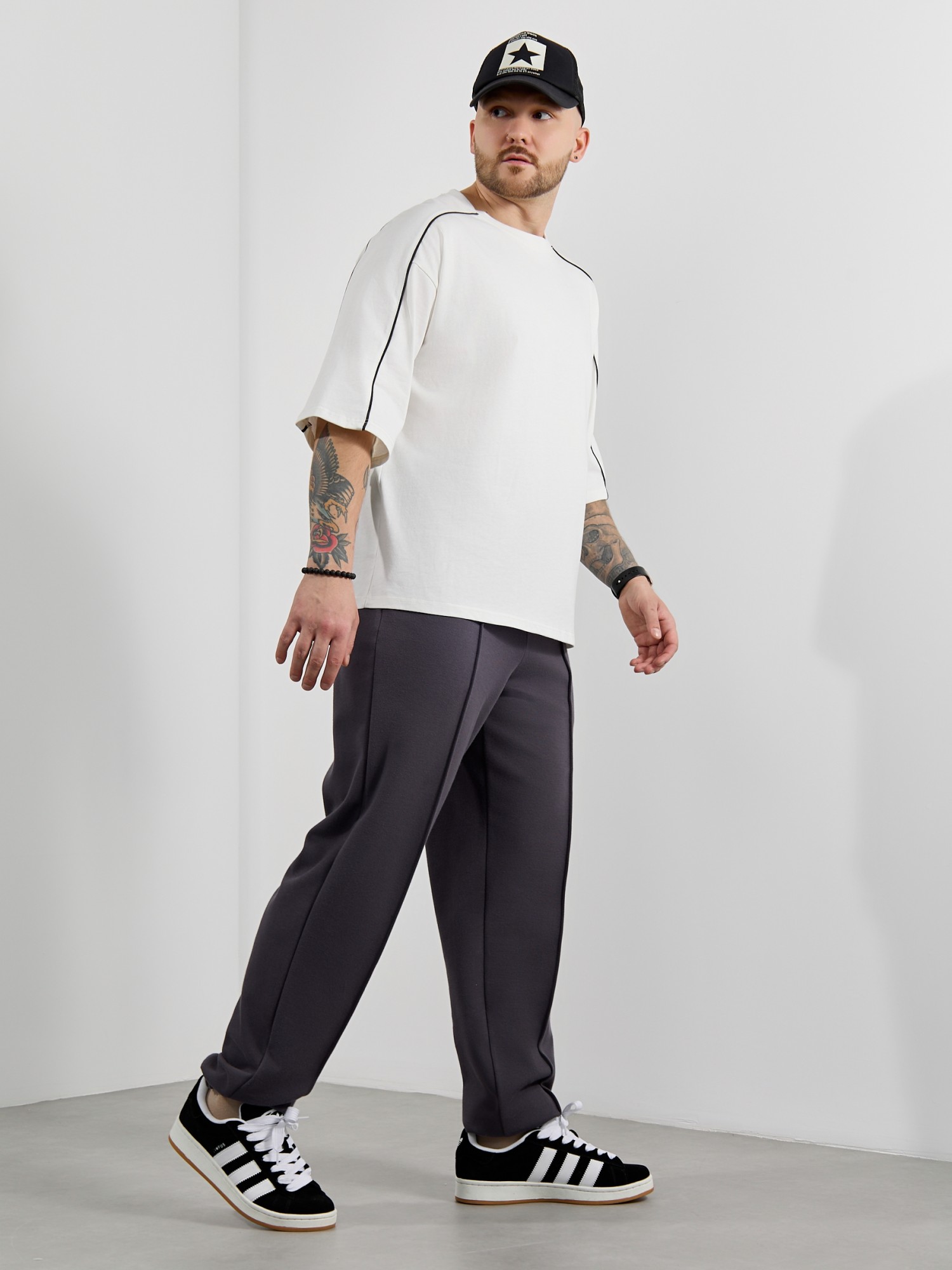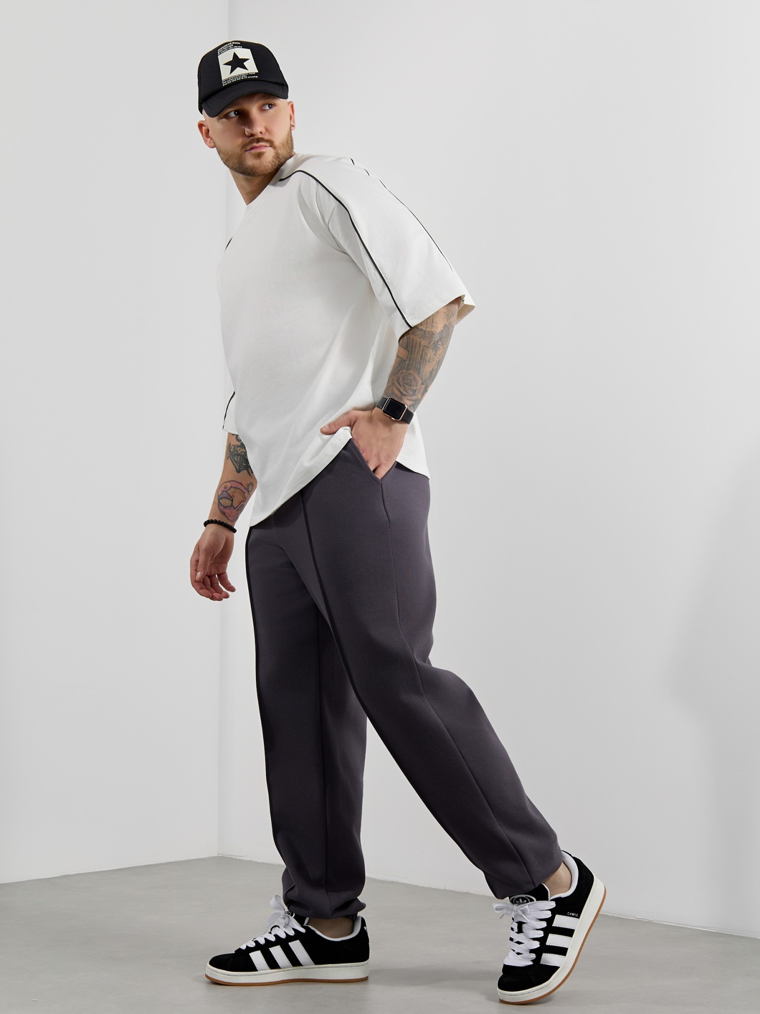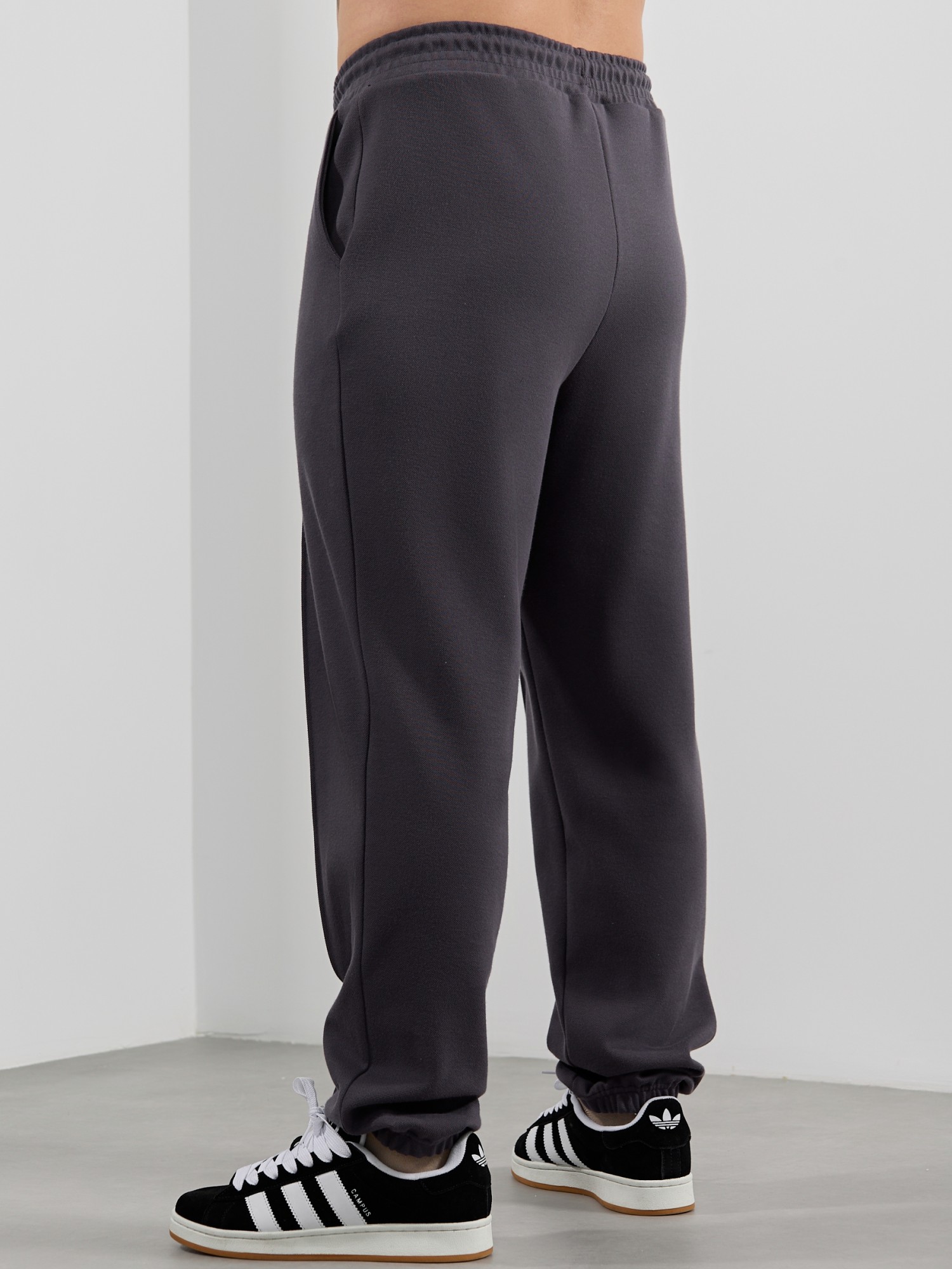 Брюки мужские из трикотажного полотна "интерлок-пике", на притачном поясе с эластичной тесьмой внутри, с карманами в боковых швах. По центру передних половинок расположены стрелки, закрепленные отделочной строчкой. Нижние срезы обработаны подгибкой с эластичной тесьмой. Для регулирования степени прилегания изделия по линии талии предусмотрен декоративный шнурок, вставленный в пояс и продетый через две обметанные петли в центре.