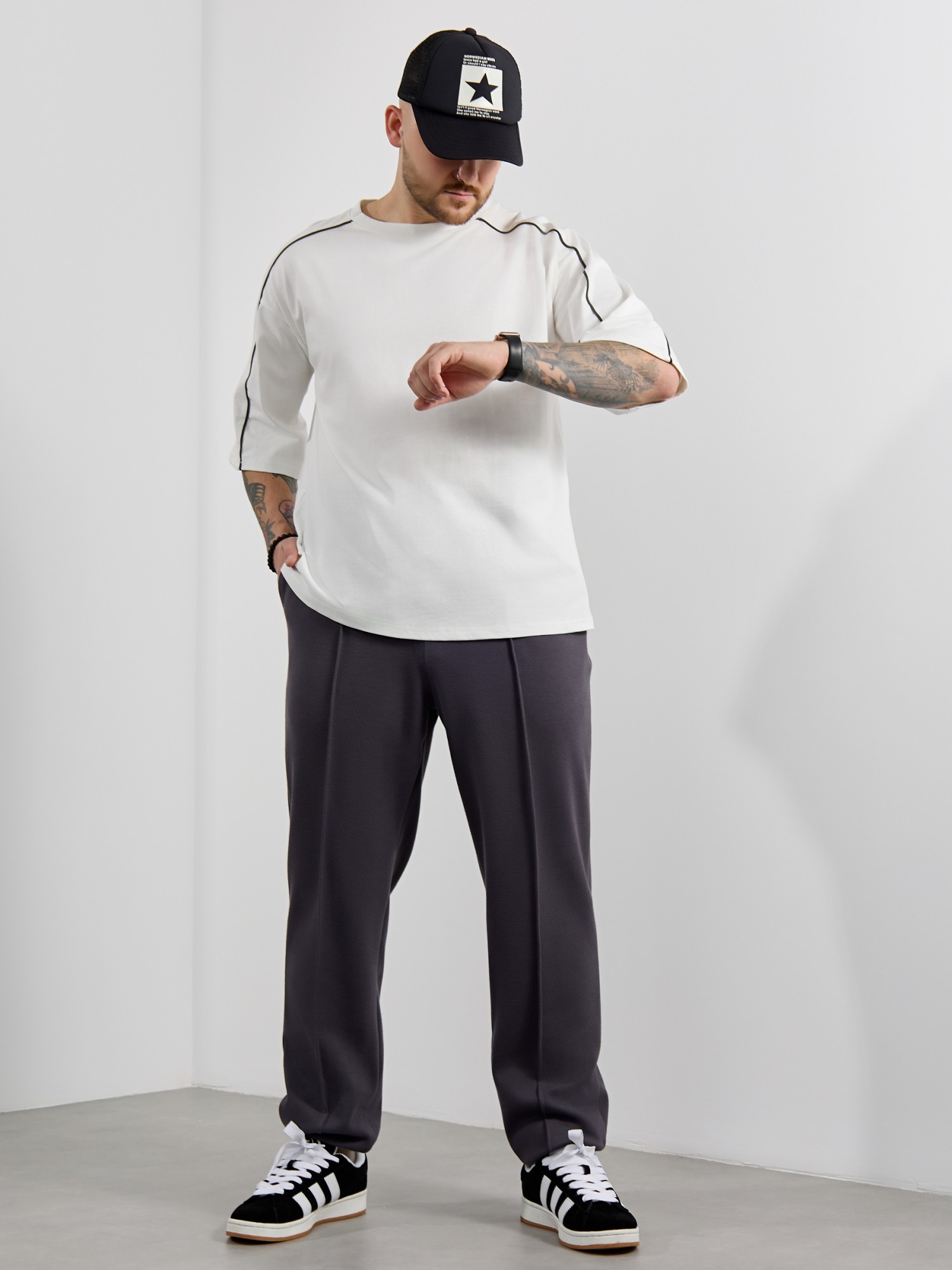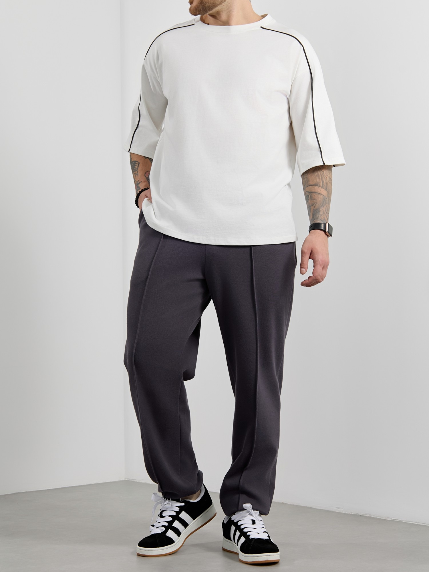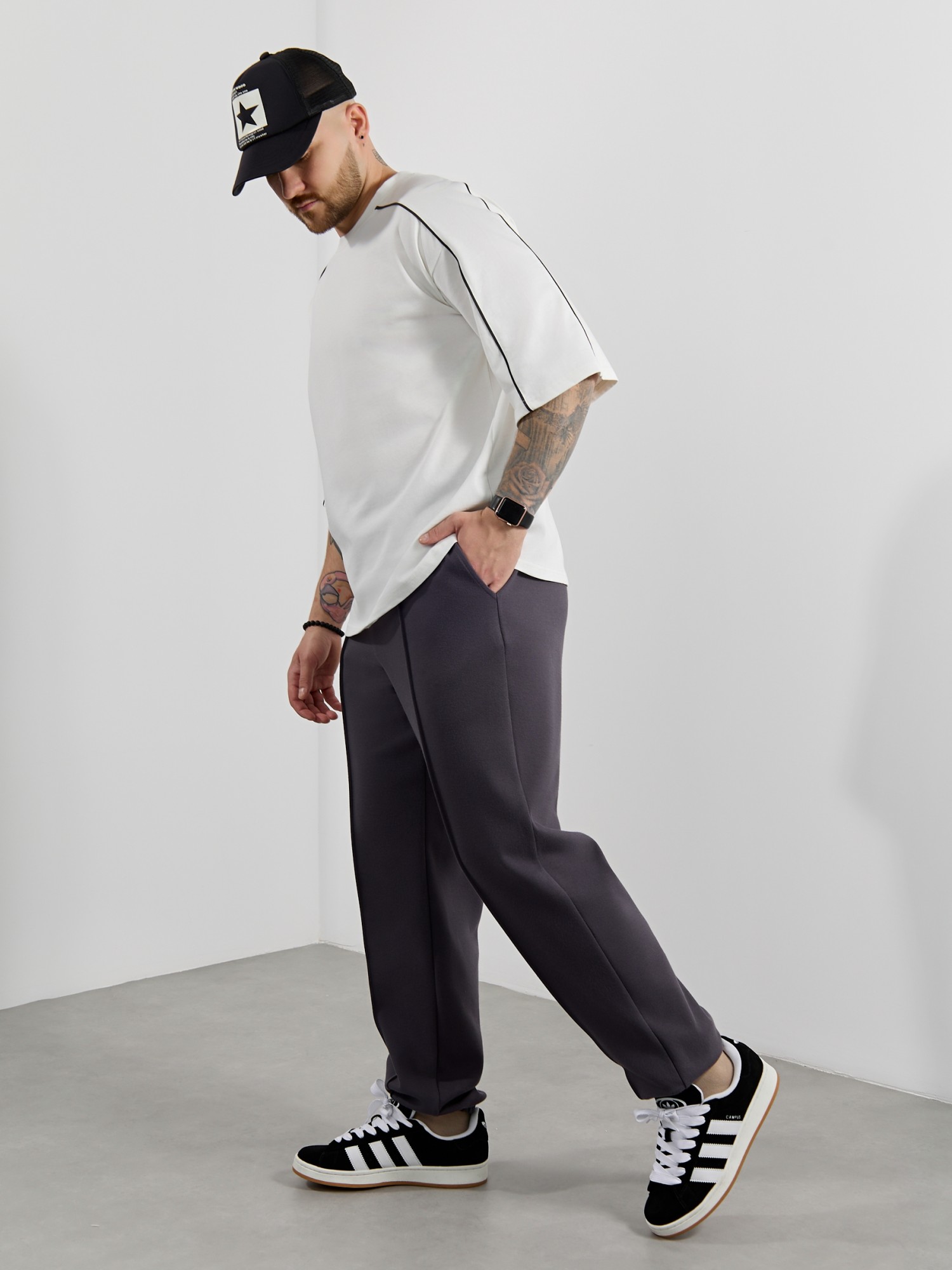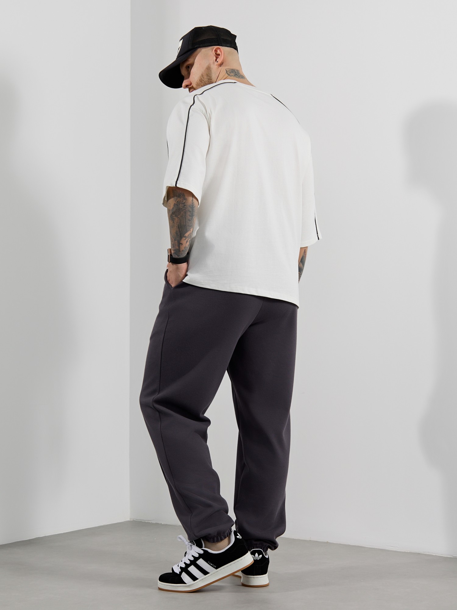 Брюки мужские из трикотажного полотна "интерлок-пике", на притачном поясе с эластичной тесьмой внутри, с карманами в боковых швах. По центру передних половинок расположены стрелки, закрепленные отделочной строчкой. Нижние срезы обработаны подгибкой с эластичной тесьмой. Для регулирования степени прилегания изделия по линии талии предусмотрен декоративный шнурок, вставленный в пояс и продетый через две обметанные петли в центре.