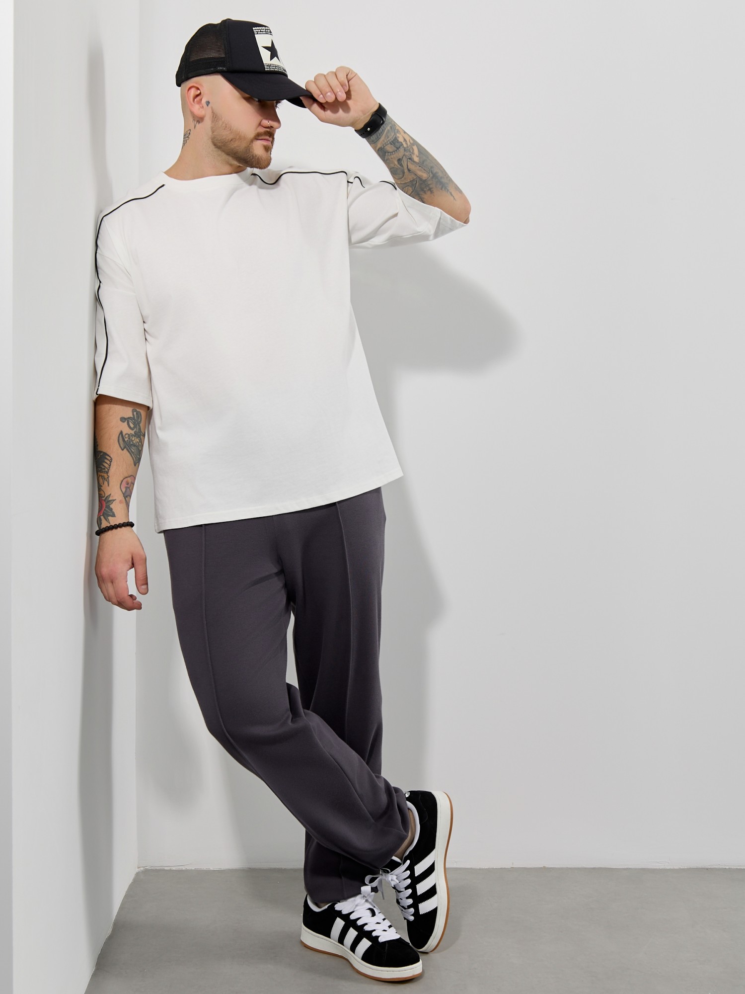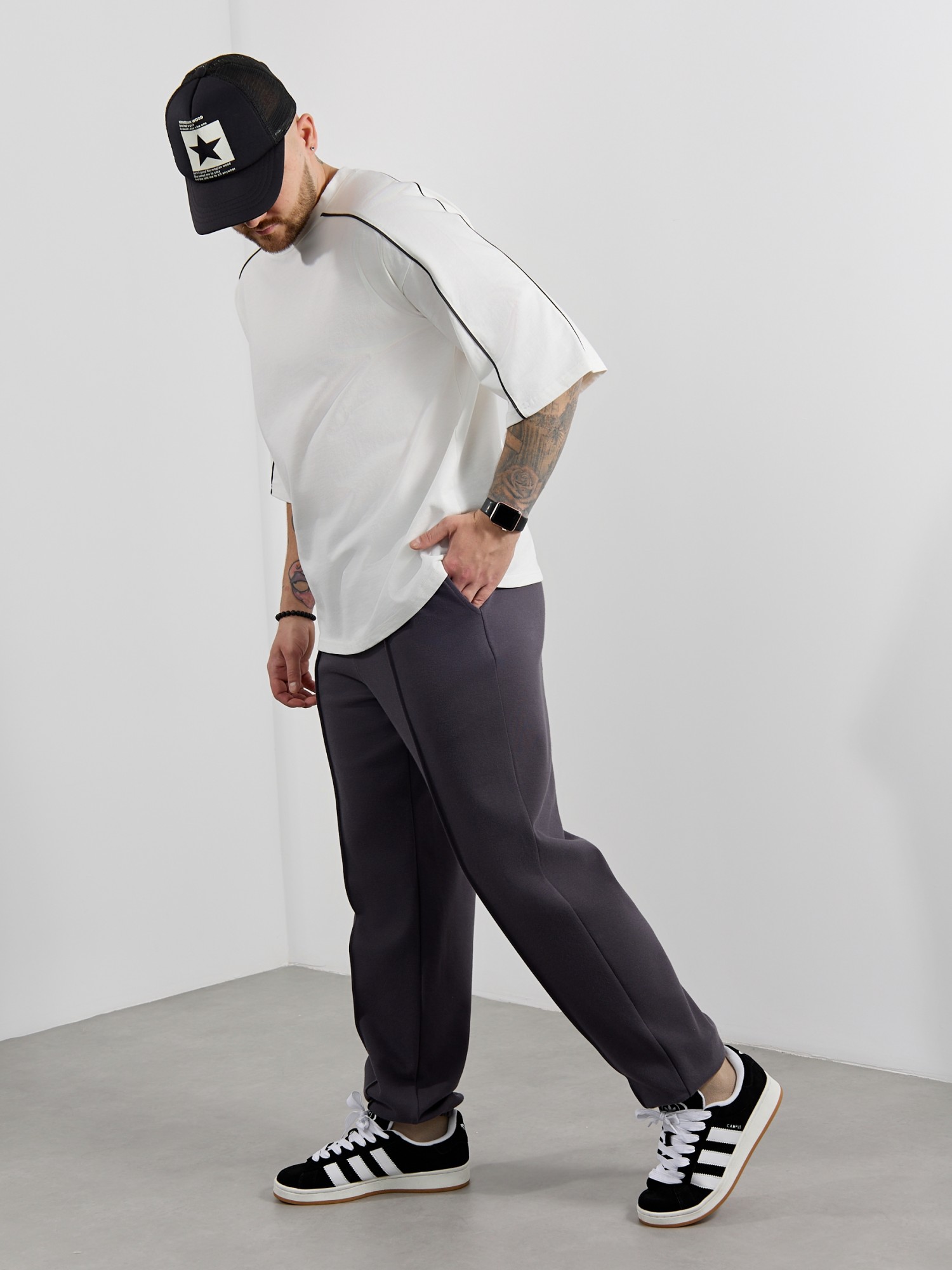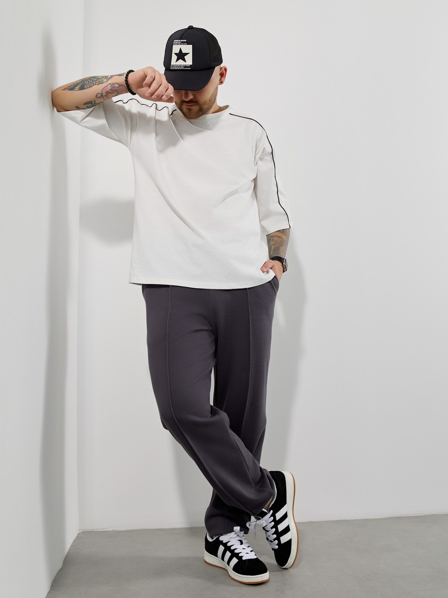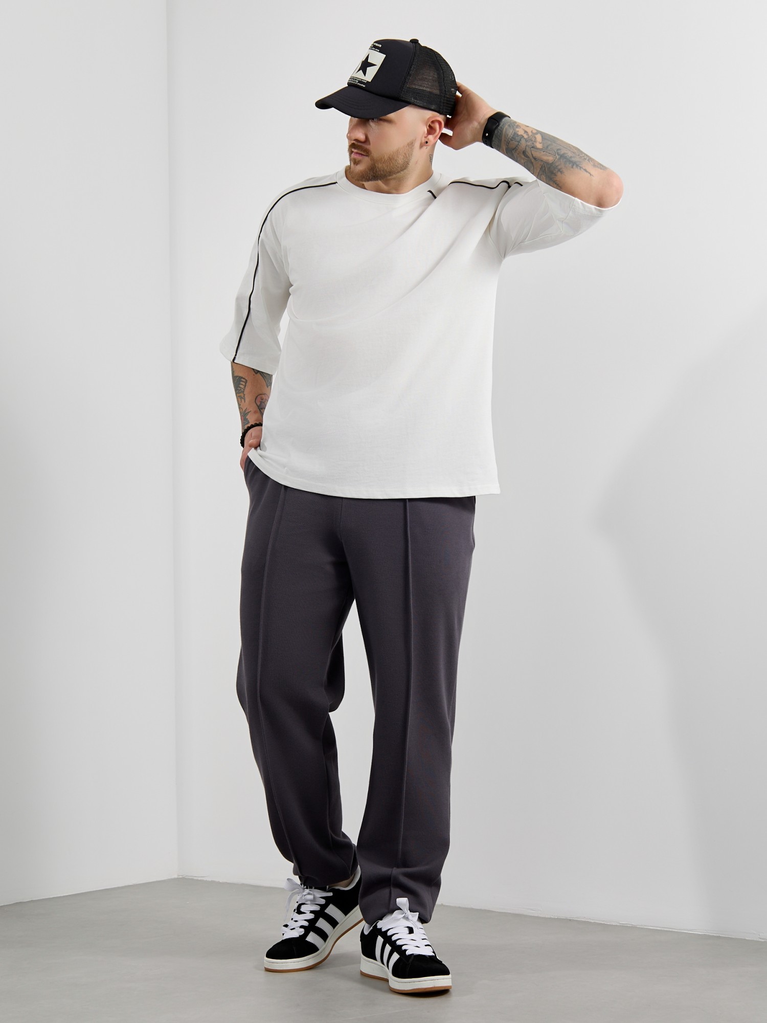 Брюки мужские из трикотажного полотна "интерлок-пике", на притачном поясе с эластичной тесьмой внутри, с карманами в боковых швах. По центру передних половинок расположены стрелки, закрепленные отделочной строчкой. Нижние срезы обработаны подгибкой с эластичной тесьмой. Для регулирования степени прилегания изделия по линии талии предусмотрен декоративный шнурок, вставленный в пояс и продетый через две обметанные петли в центре.