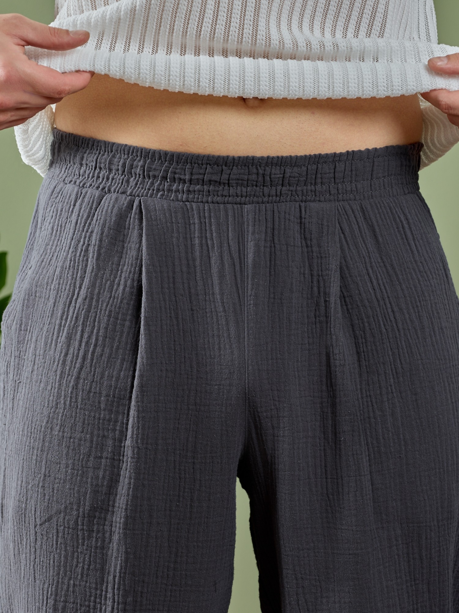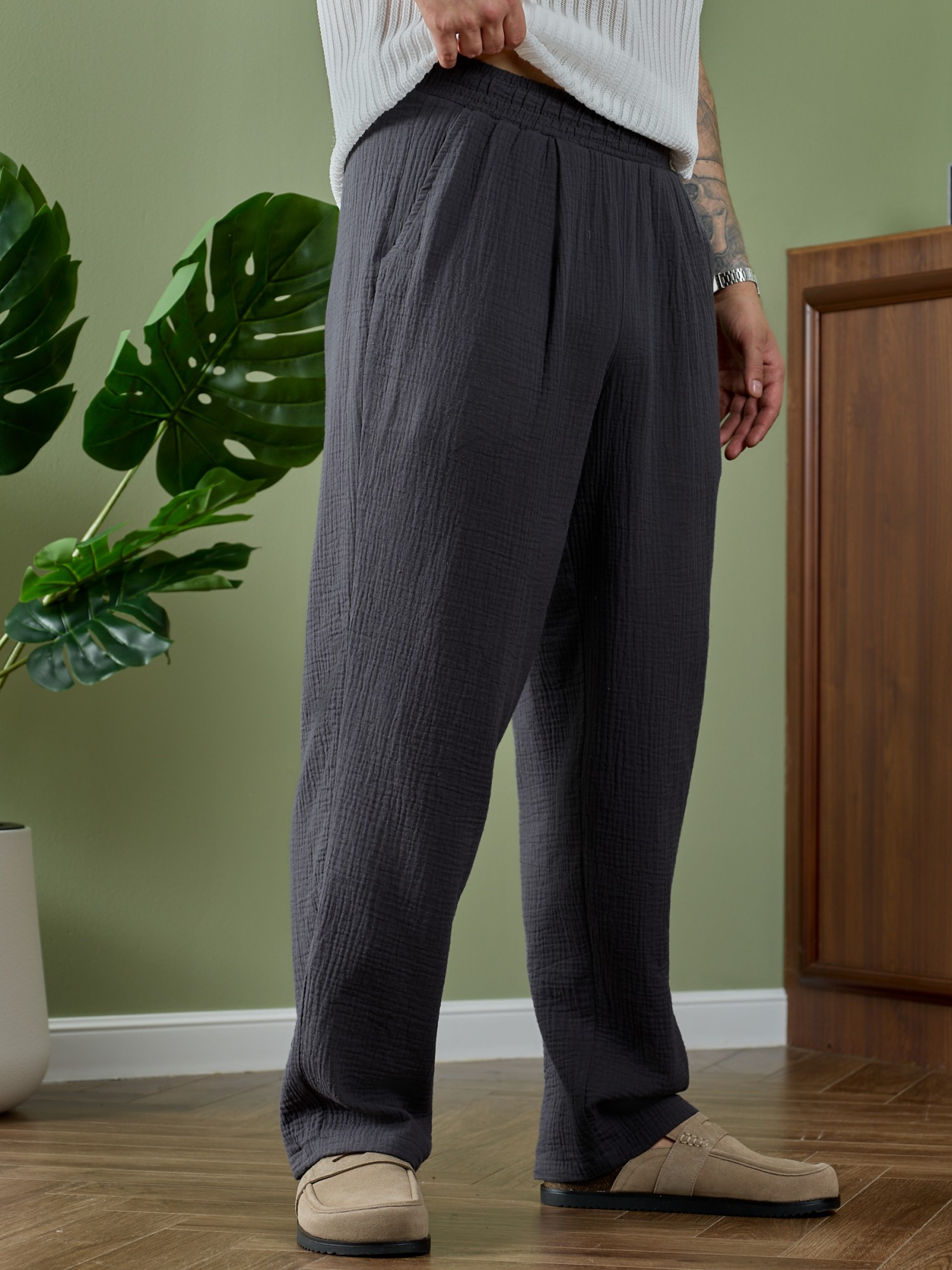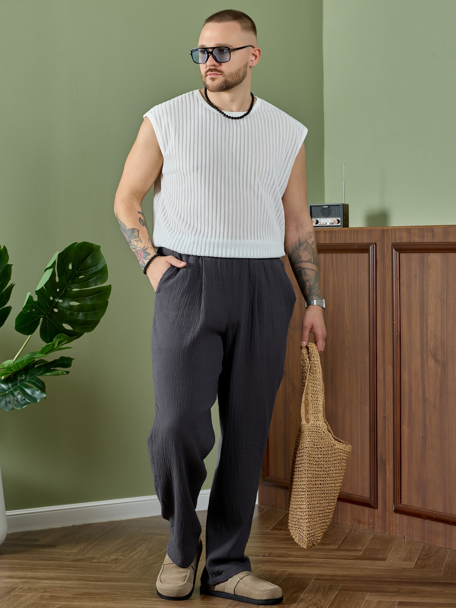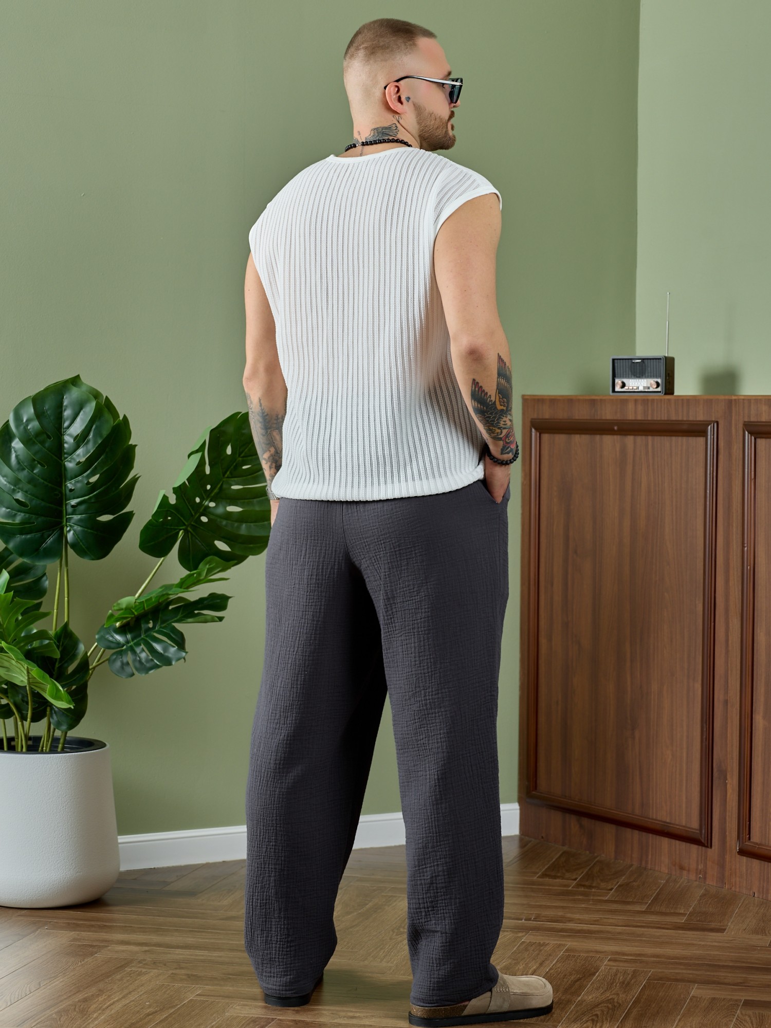 Брюки мужские из фактурного гладкокрашеного полотна на притачном поясе с эластичной тесьмой внутри , с карманами в боковых швах. На передних половинах брюк в шве притачивания пояса обработаны складки-защипы по две с каждой стороны. Нижние срезы брюк обработаны подгибкой.