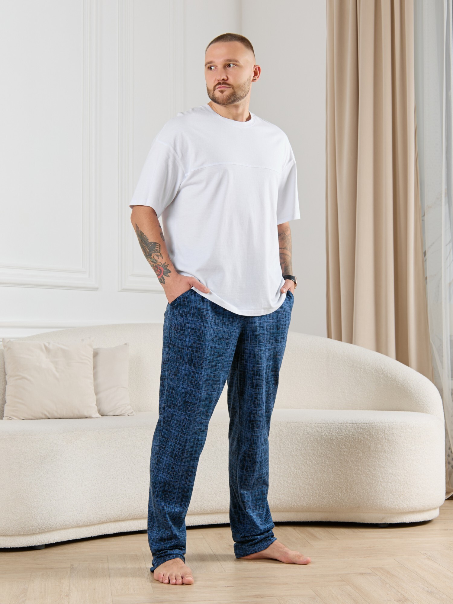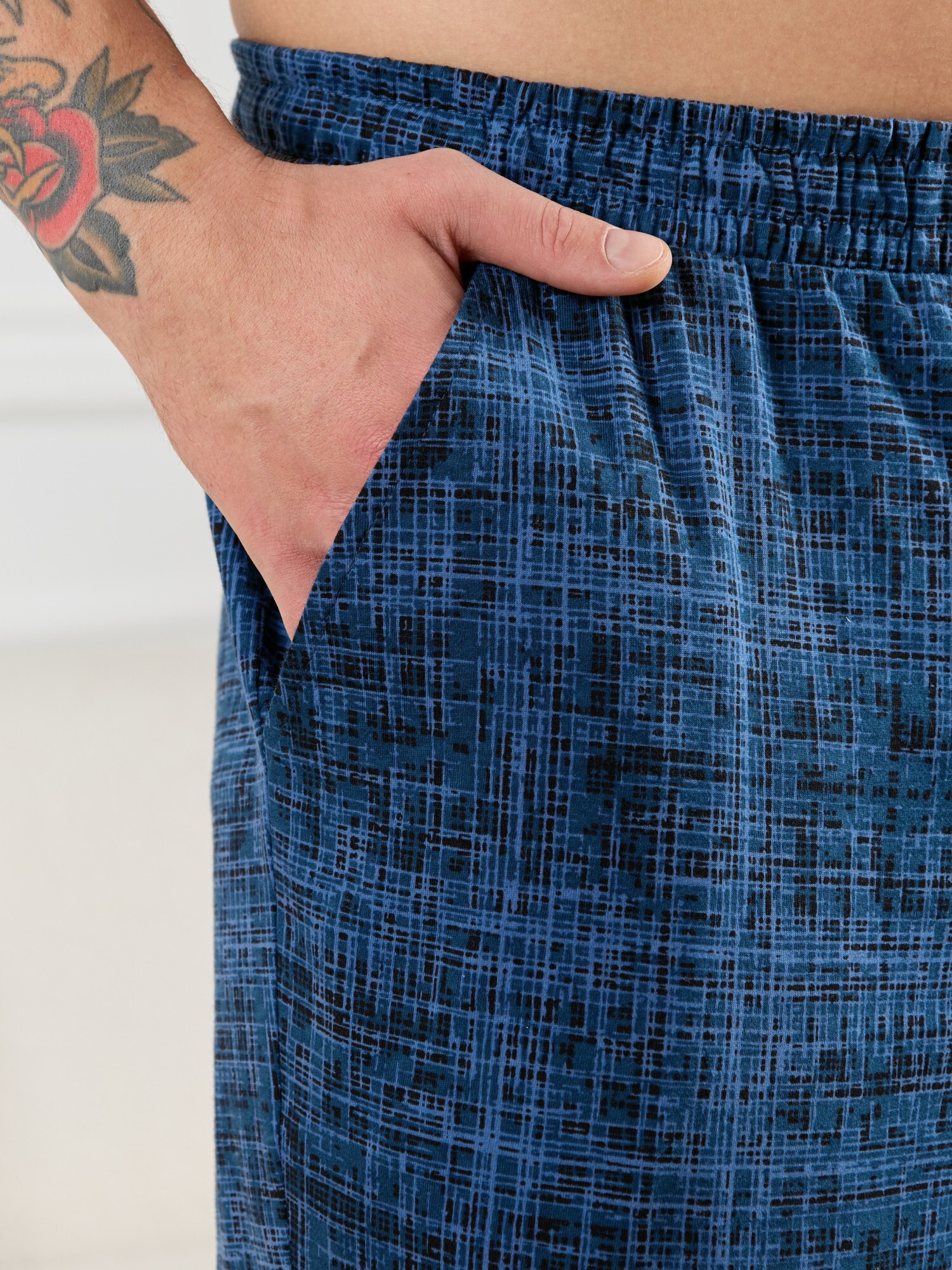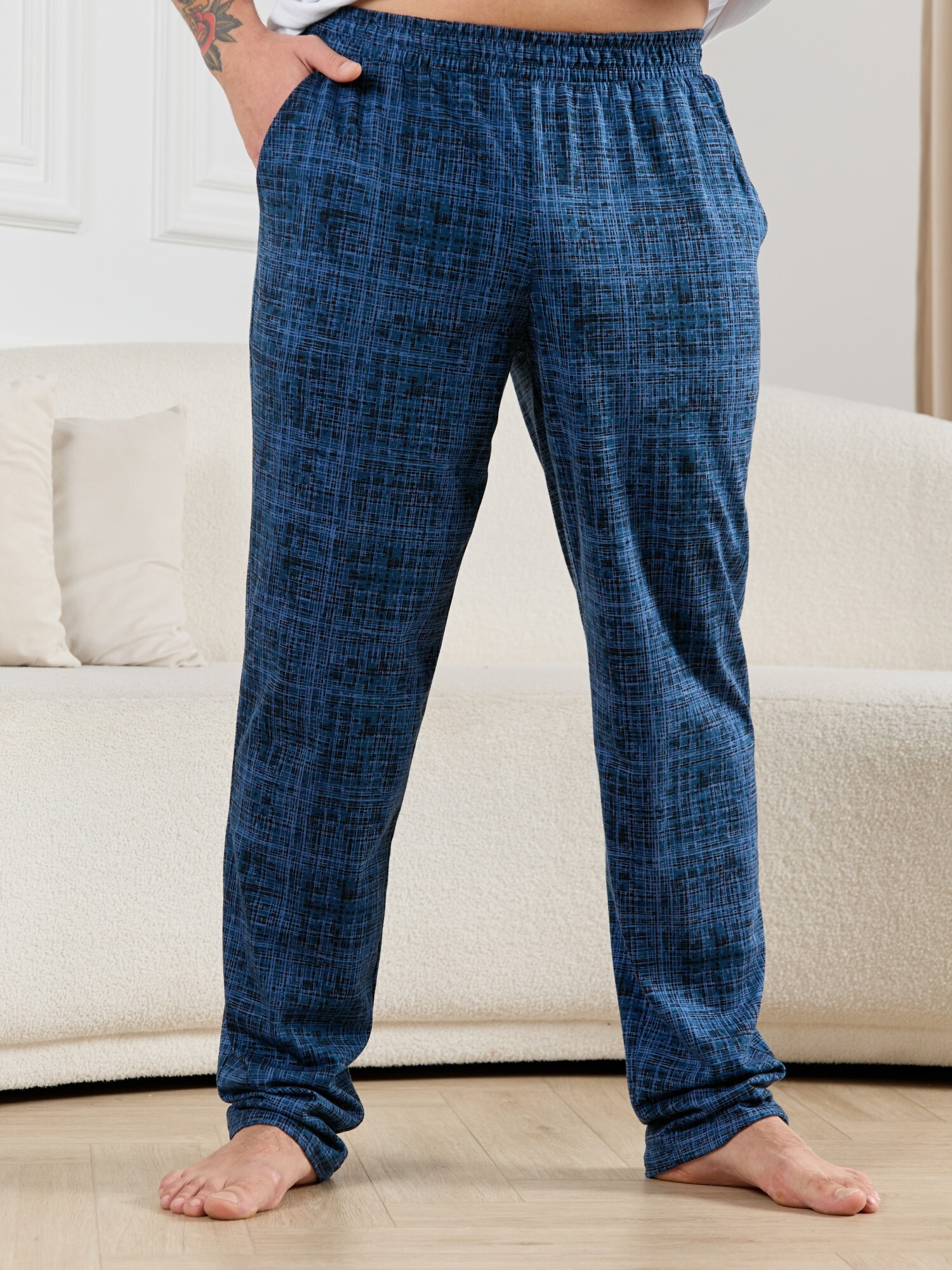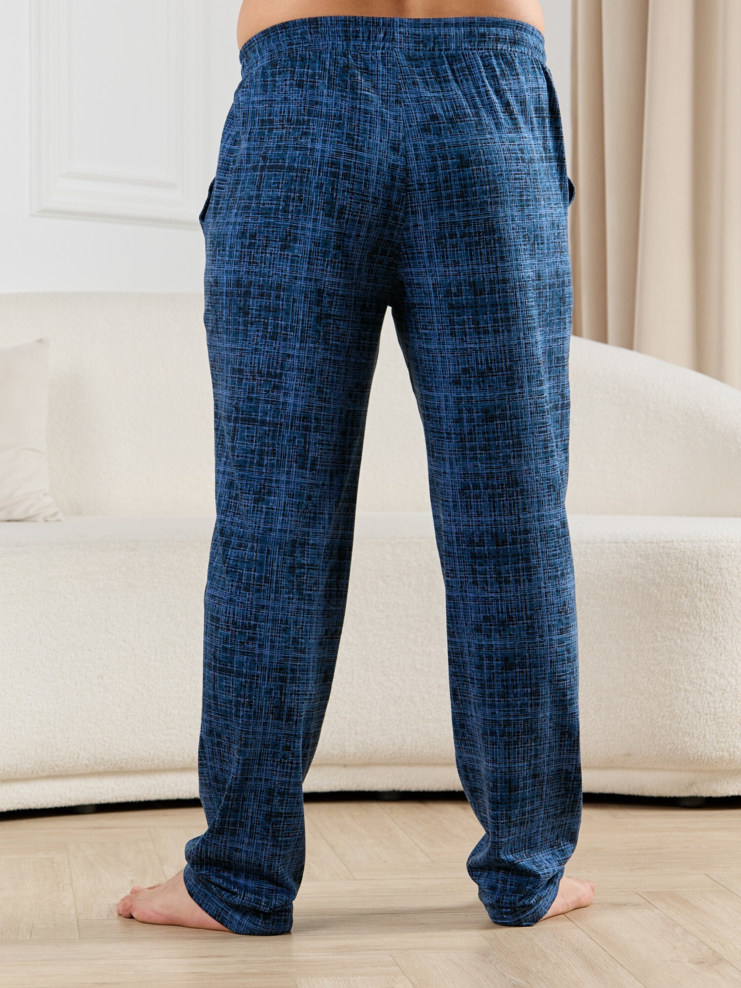 Брюки мужские из трикотажного полотна "кулирка" в клетку, свободного покроя, на притачном поясе с эластичной тесьмой внутри, с карманами в боковых швах. Нижние срезы обработаны подгибкой.