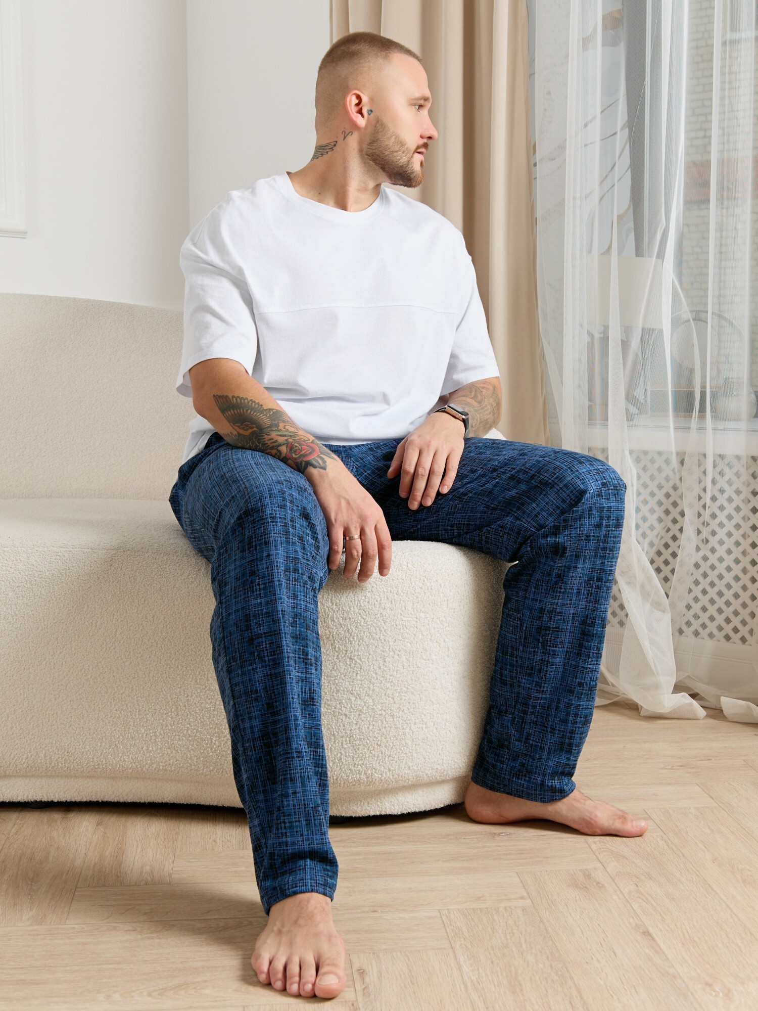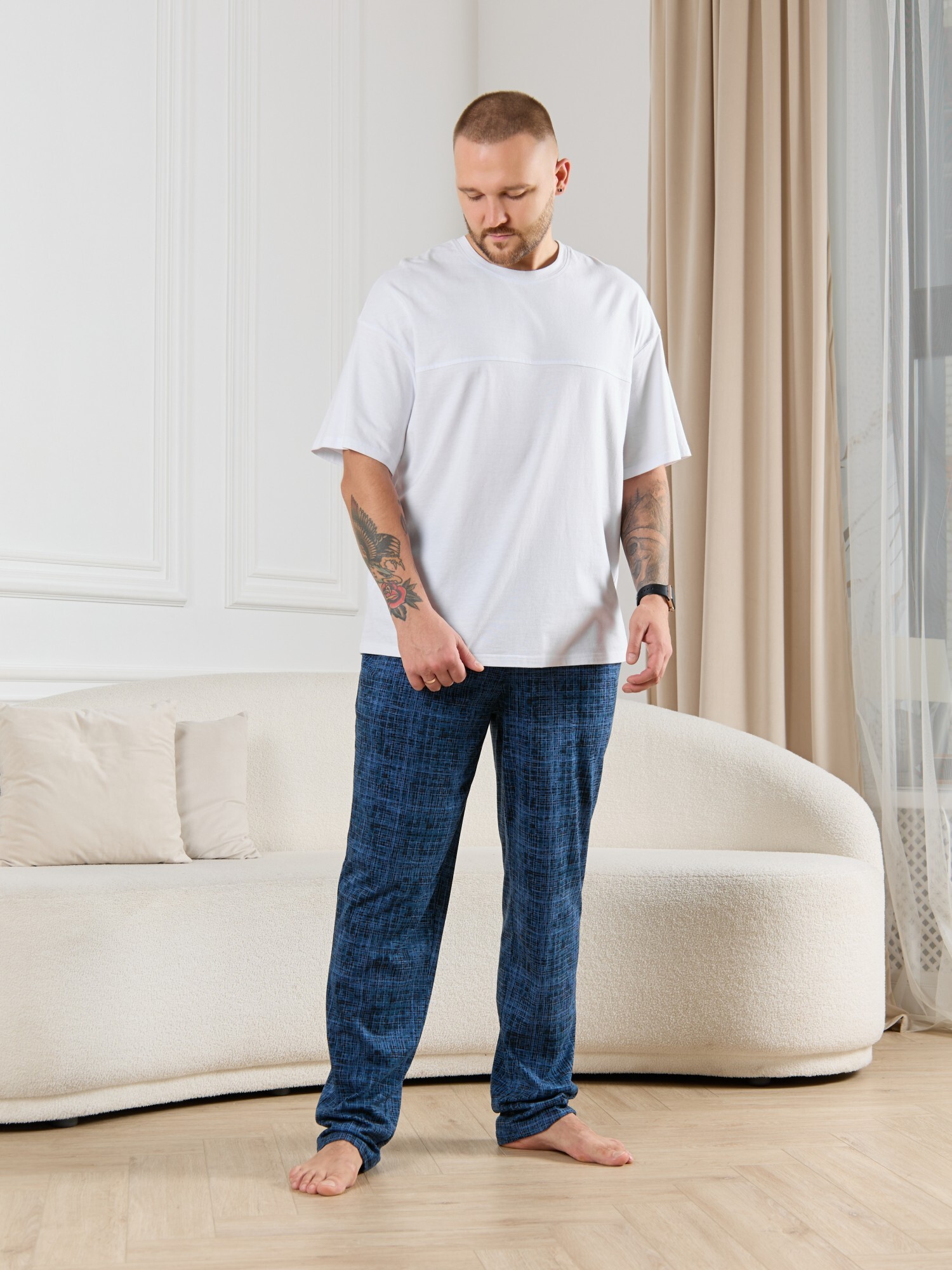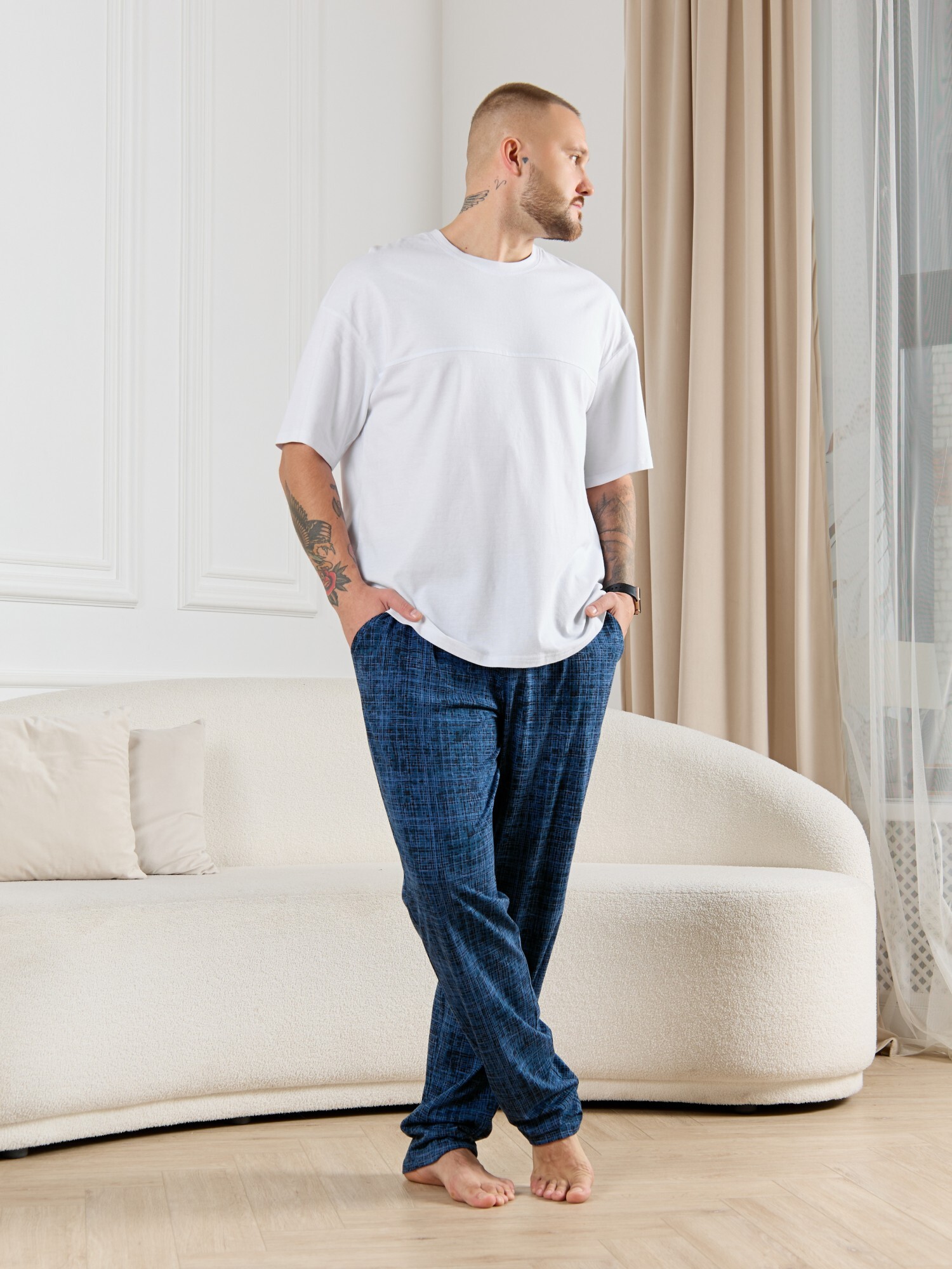 Брюки мужские из трикотажного полотна "кулирка" в клетку, свободного покроя, на притачном поясе с эластичной тесьмой внутри, с карманами в боковых швах. Нижние срезы обработаны подгибкой.
