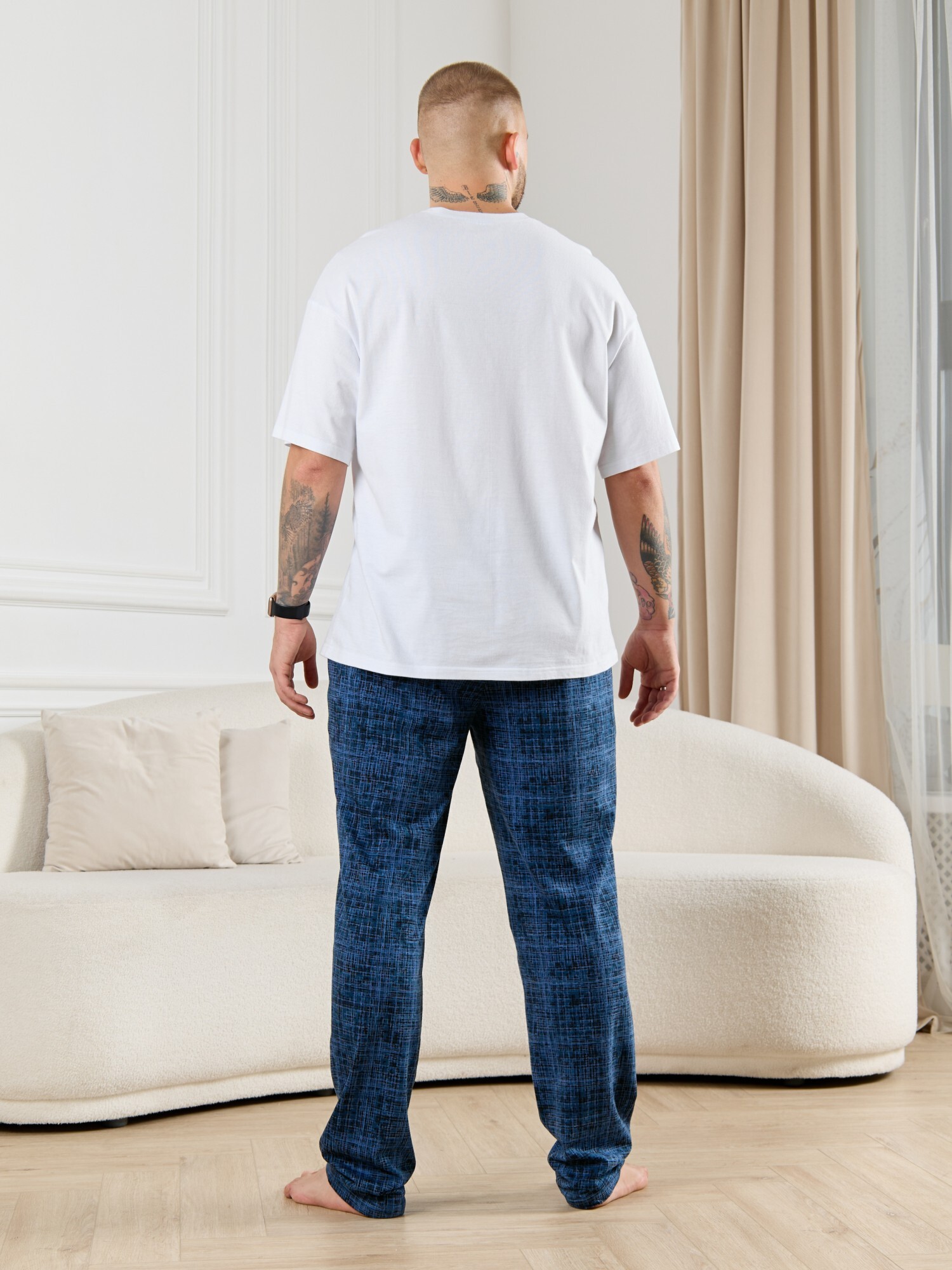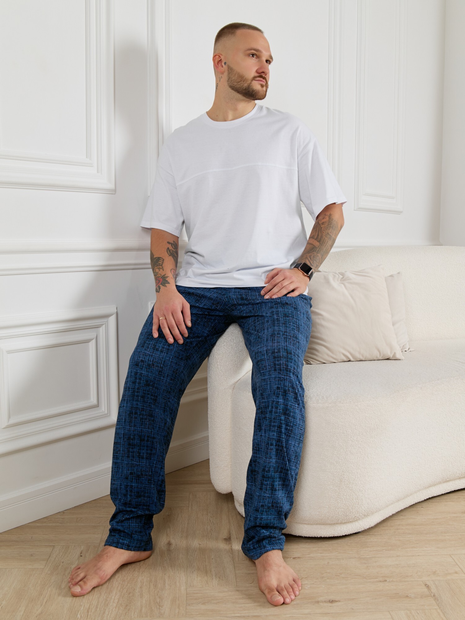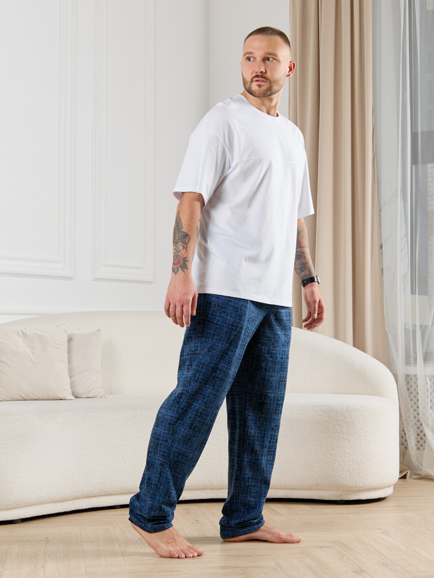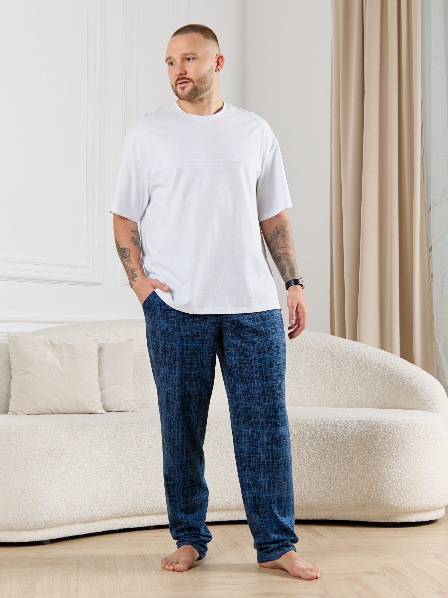Брюки мужские из трикотажного полотна "кулирка" в клетку, свободного покроя, на притачном поясе с эластичной тесьмой внутри, с карманами в боковых швах. Нижние срезы обработаны подгибкой.