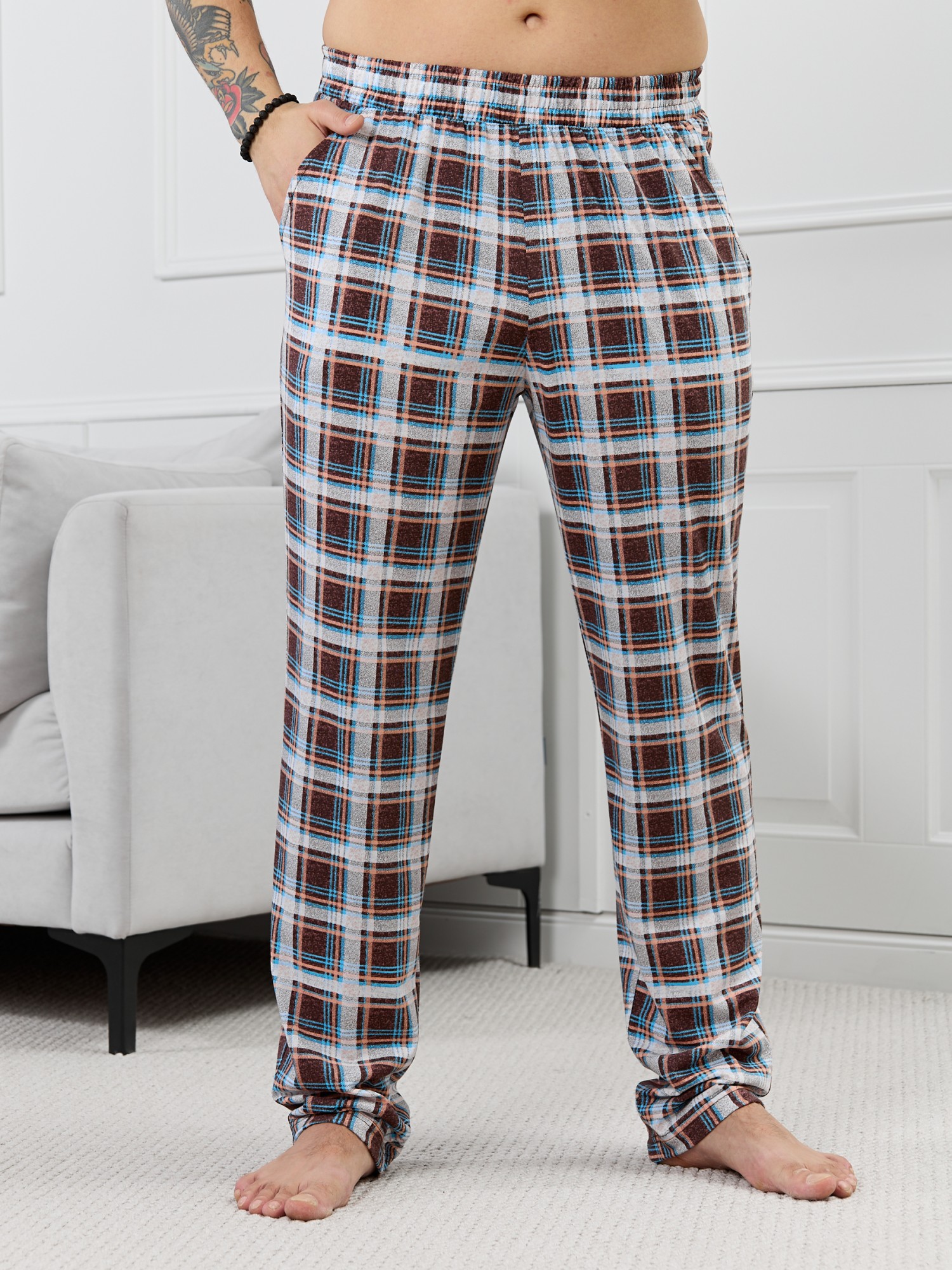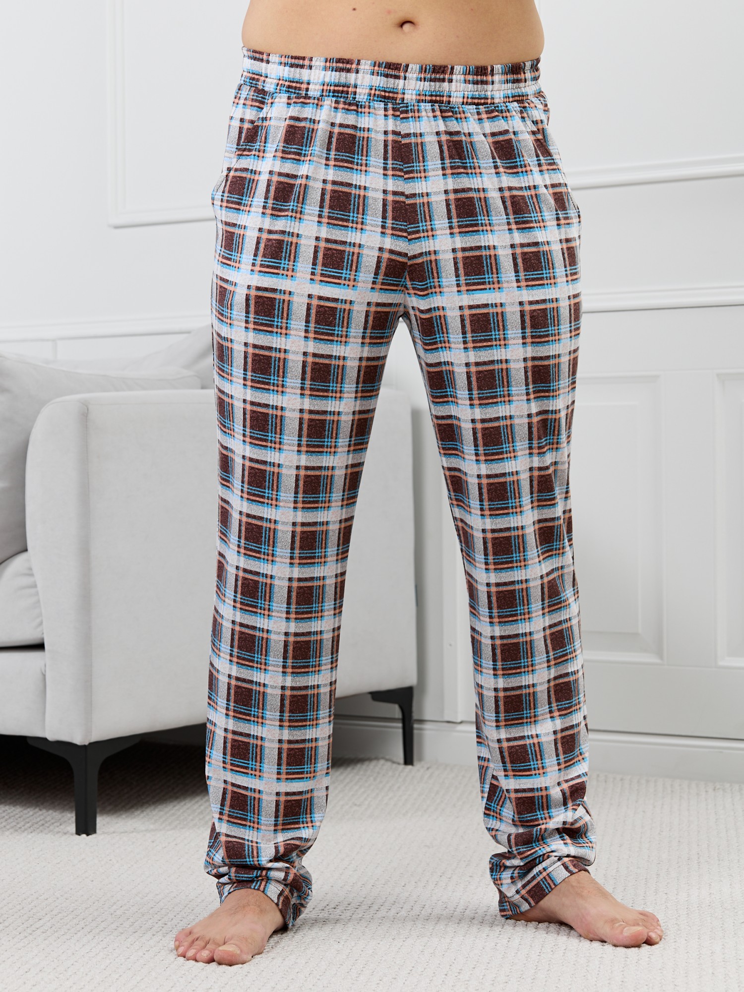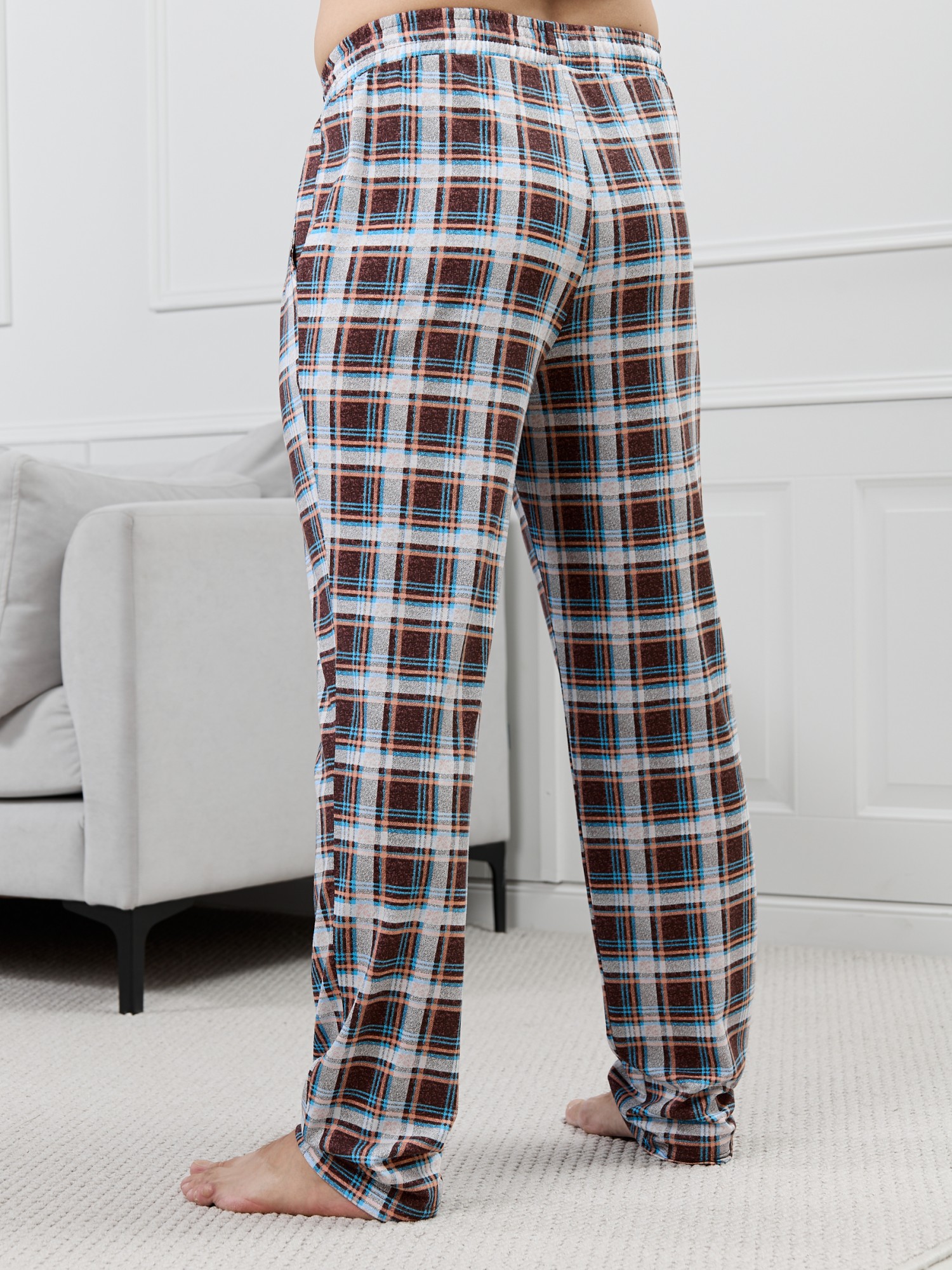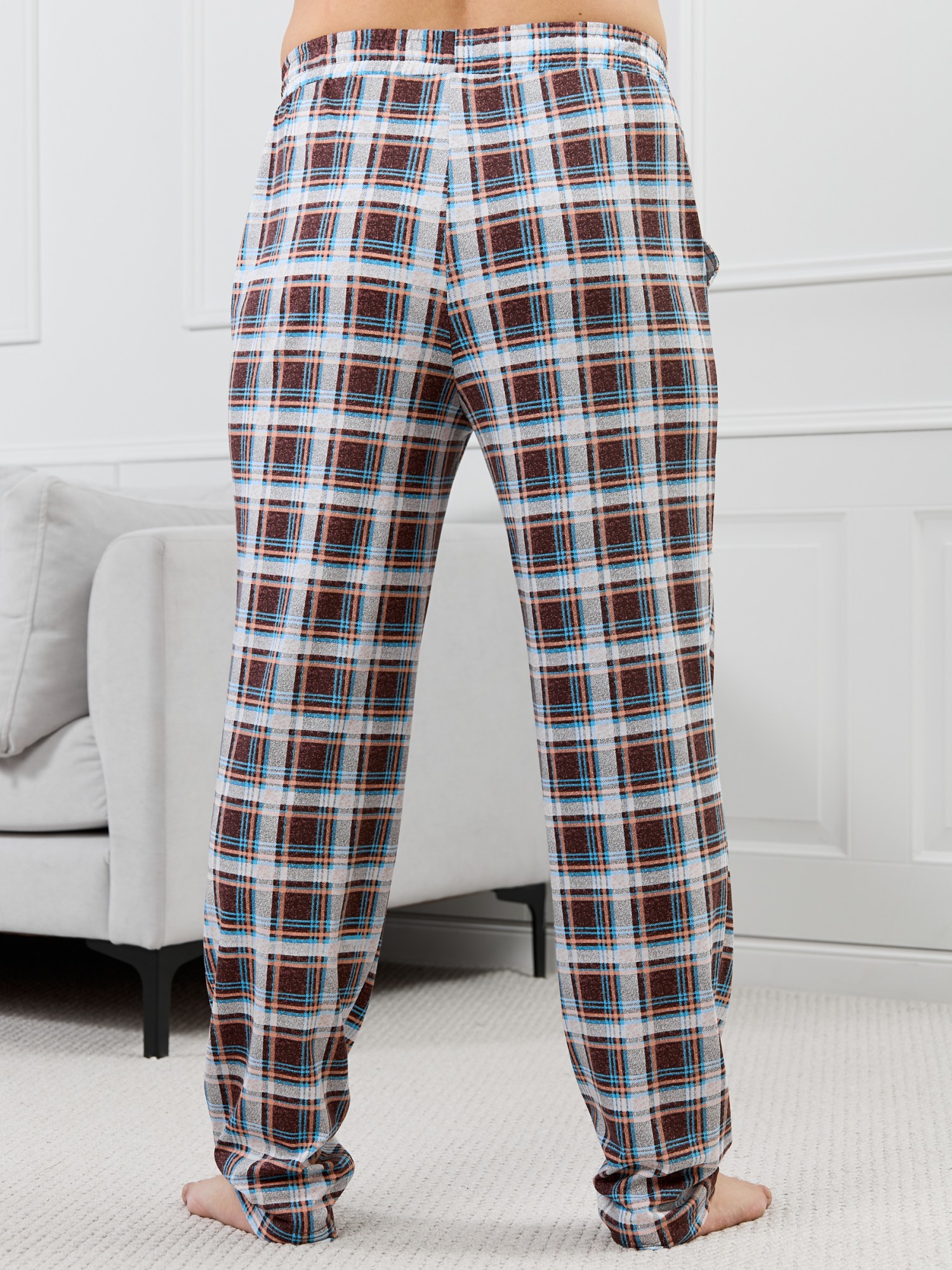 Брюки мужские из трикотажного полотна "кулирка" в клетку, свободного покроя, на притачном поясе с эластичной тесьмой внутри, с карманами в боковых швах. Нижние срезы обработаны подгибкой.