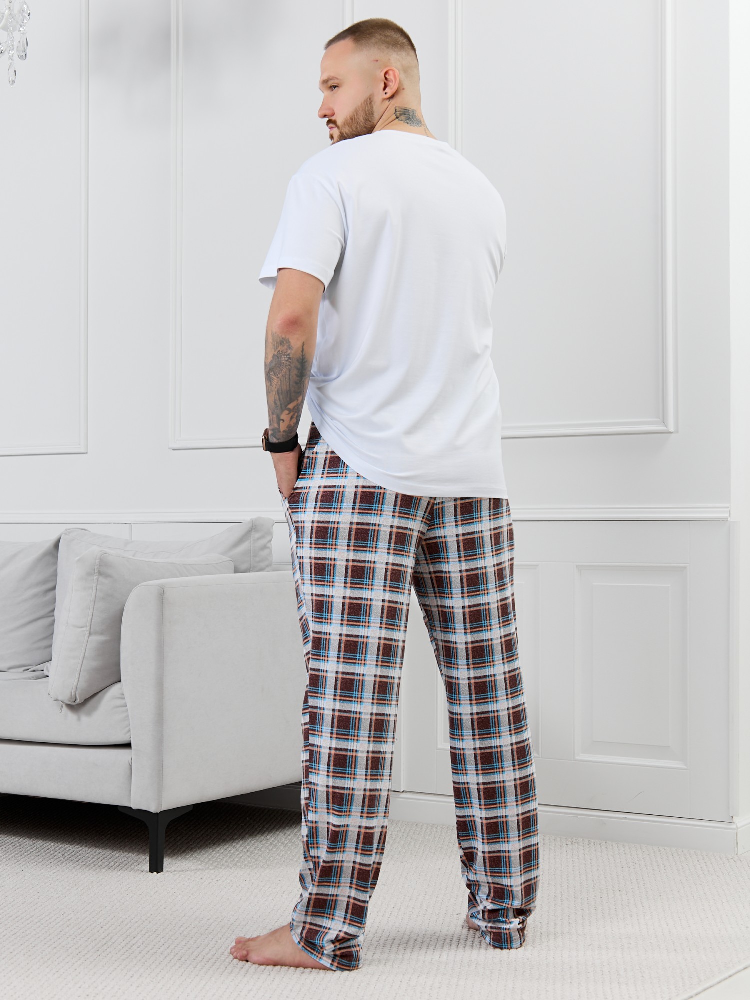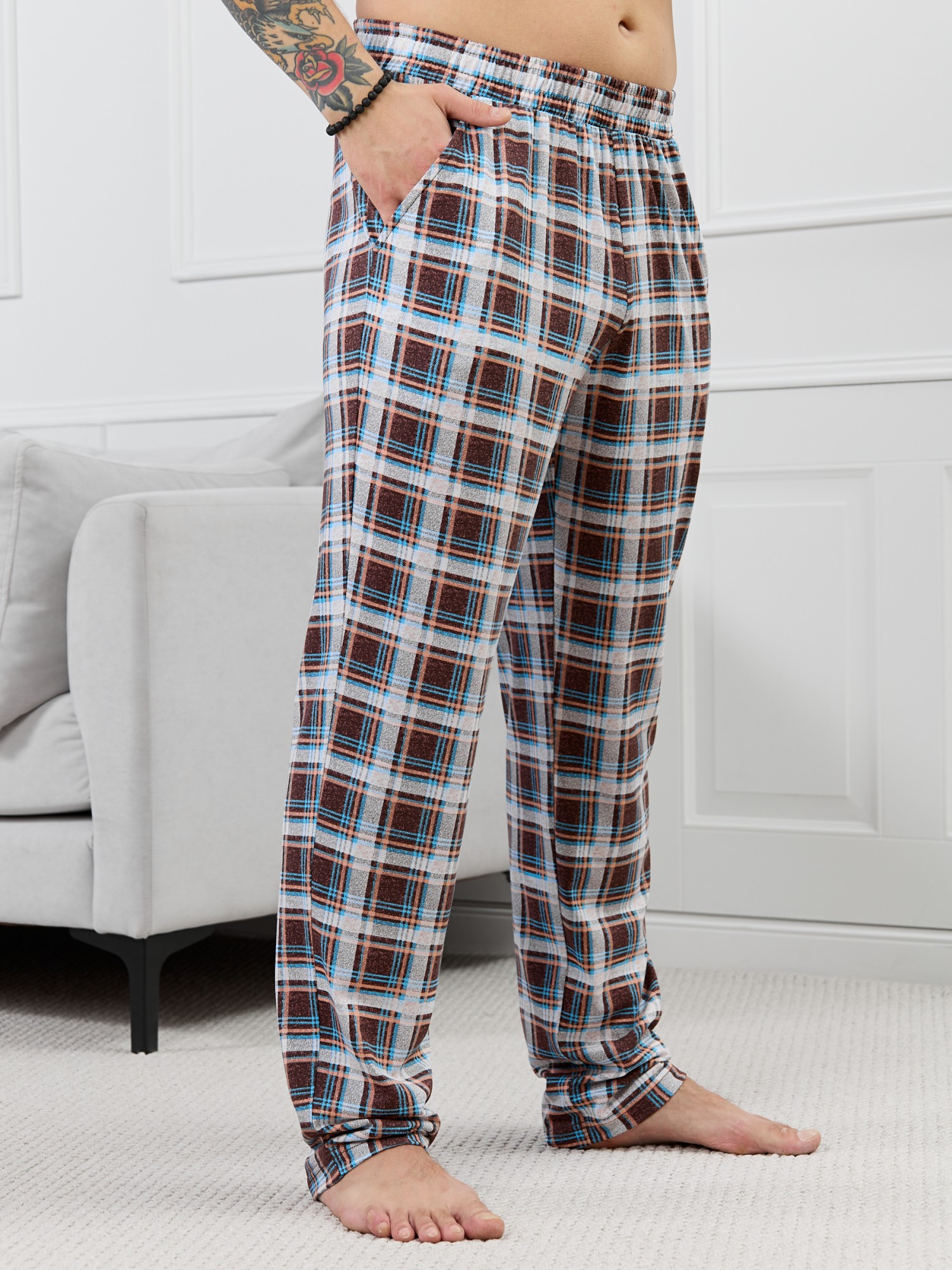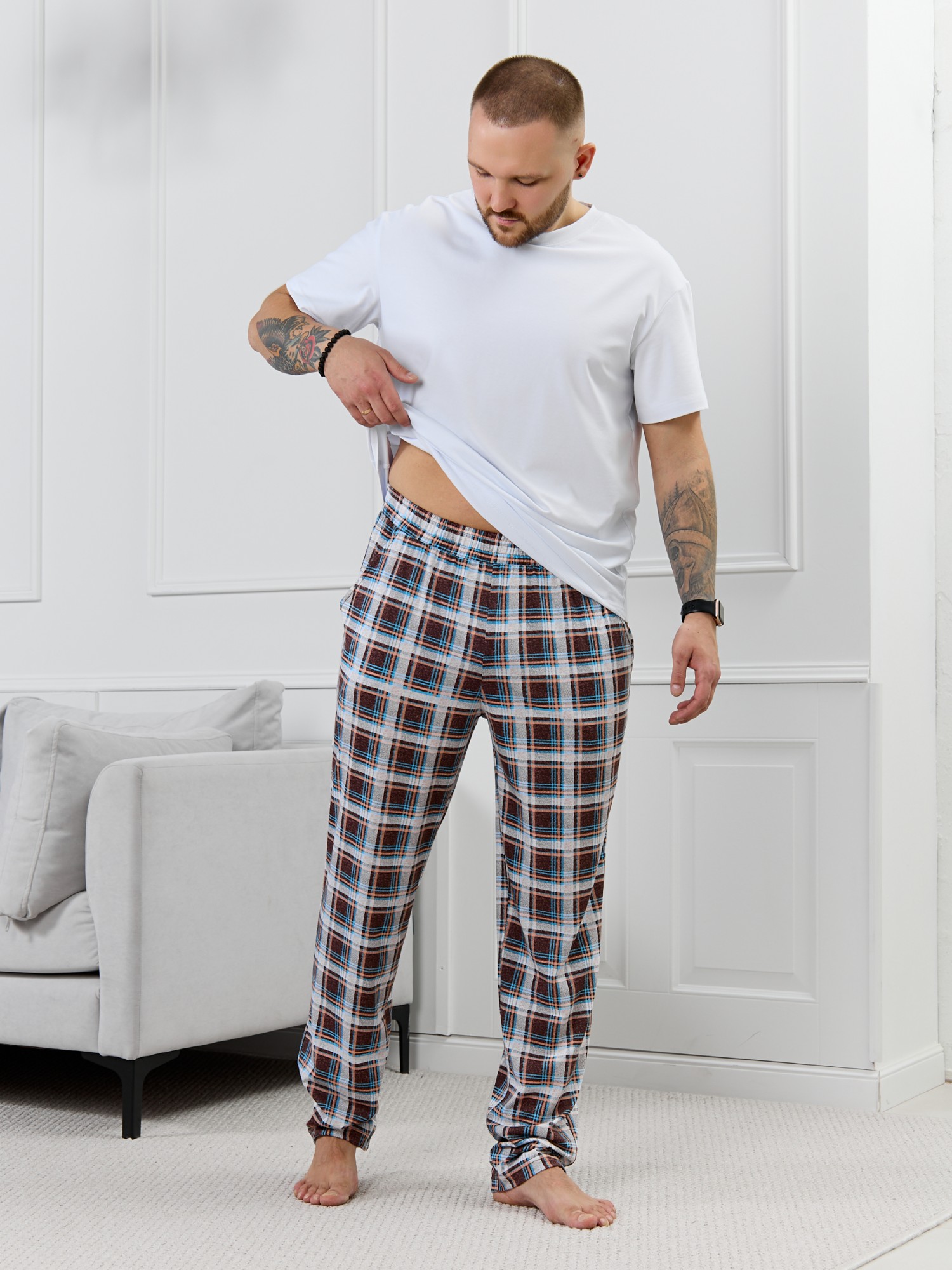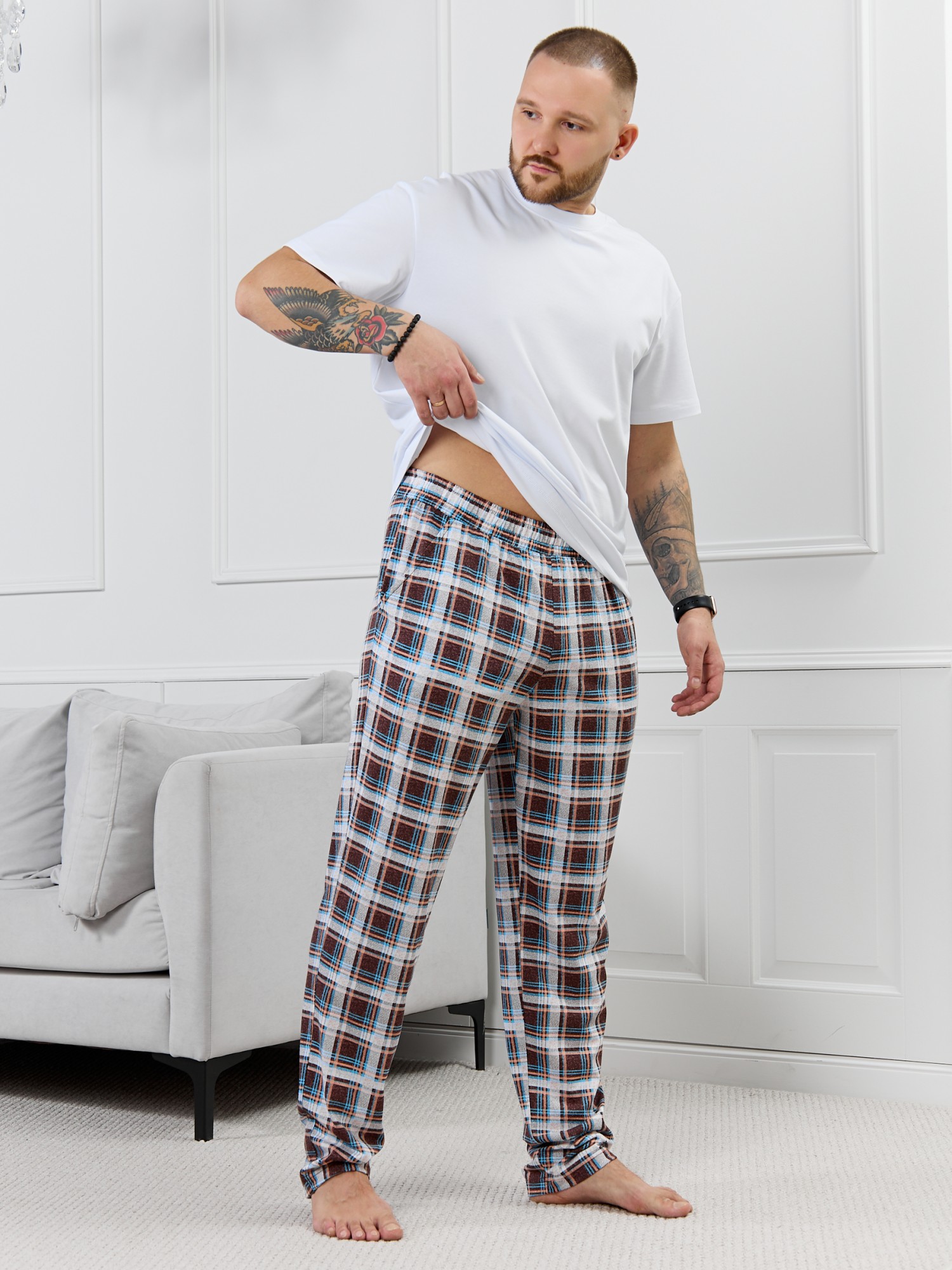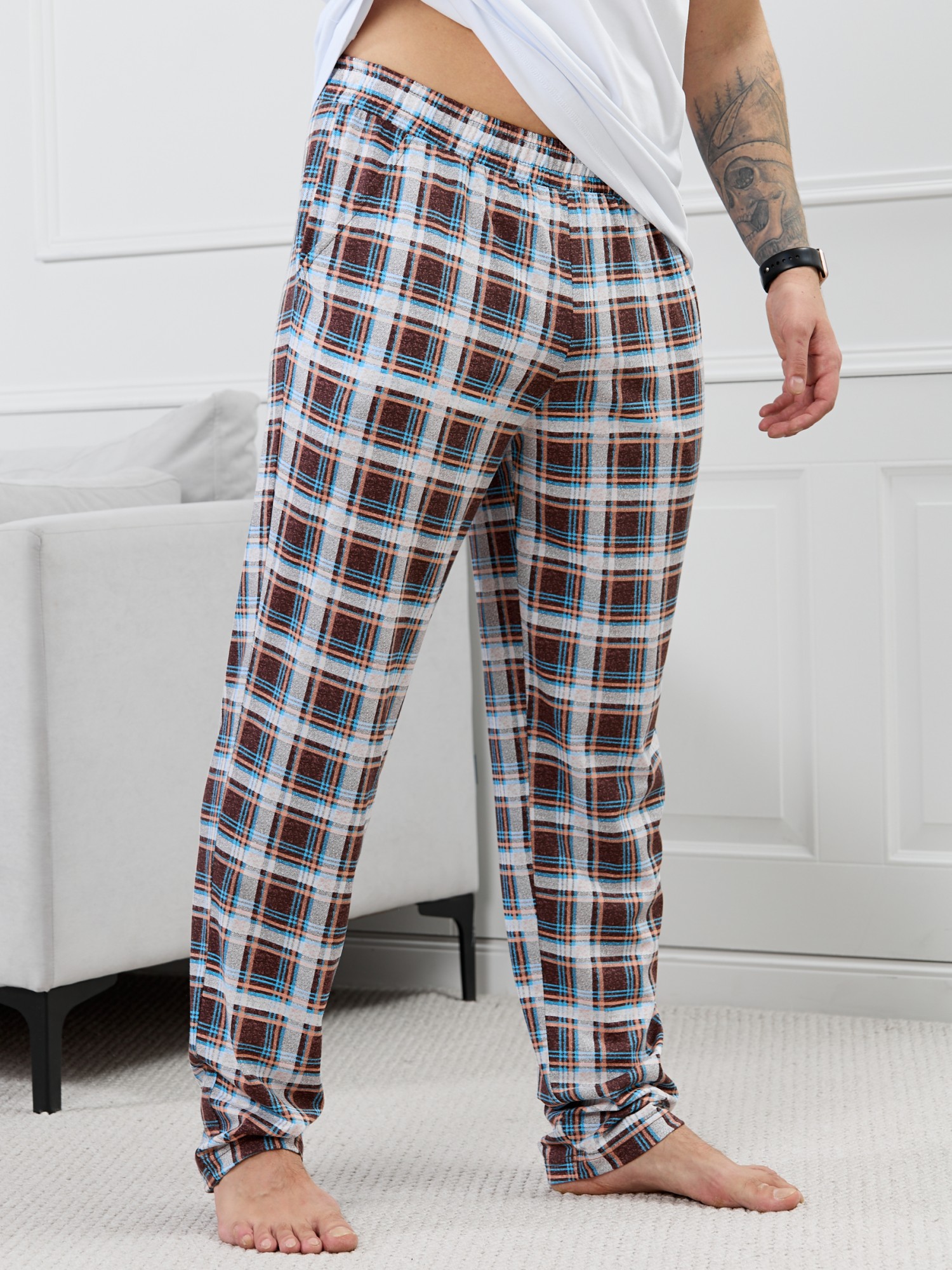 Брюки мужские из трикотажного полотна "кулирка" в клетку, свободного покроя, на притачном поясе с эластичной тесьмой внутри, с карманами в боковых швах. Нижние срезы обработаны подгибкой.