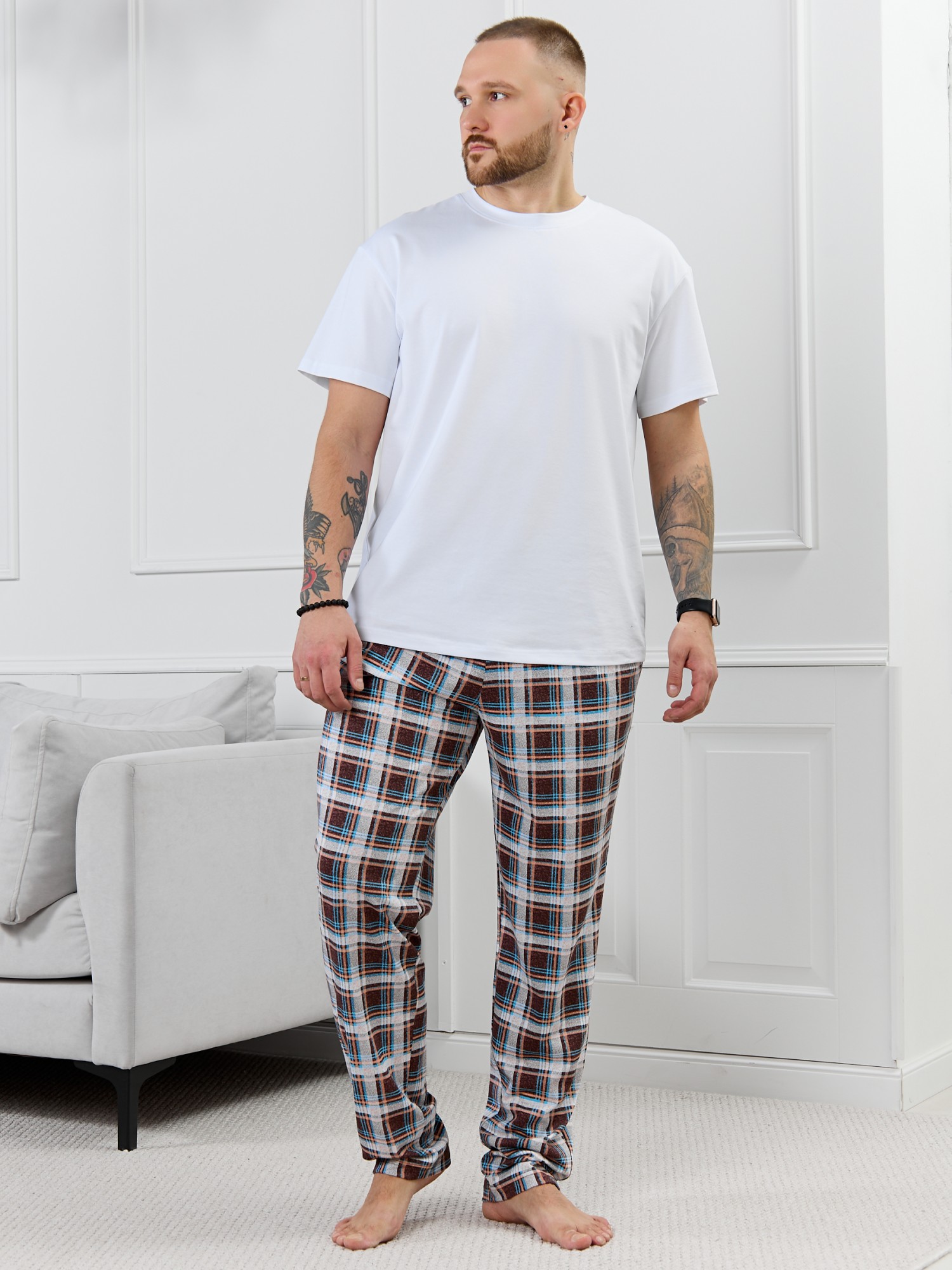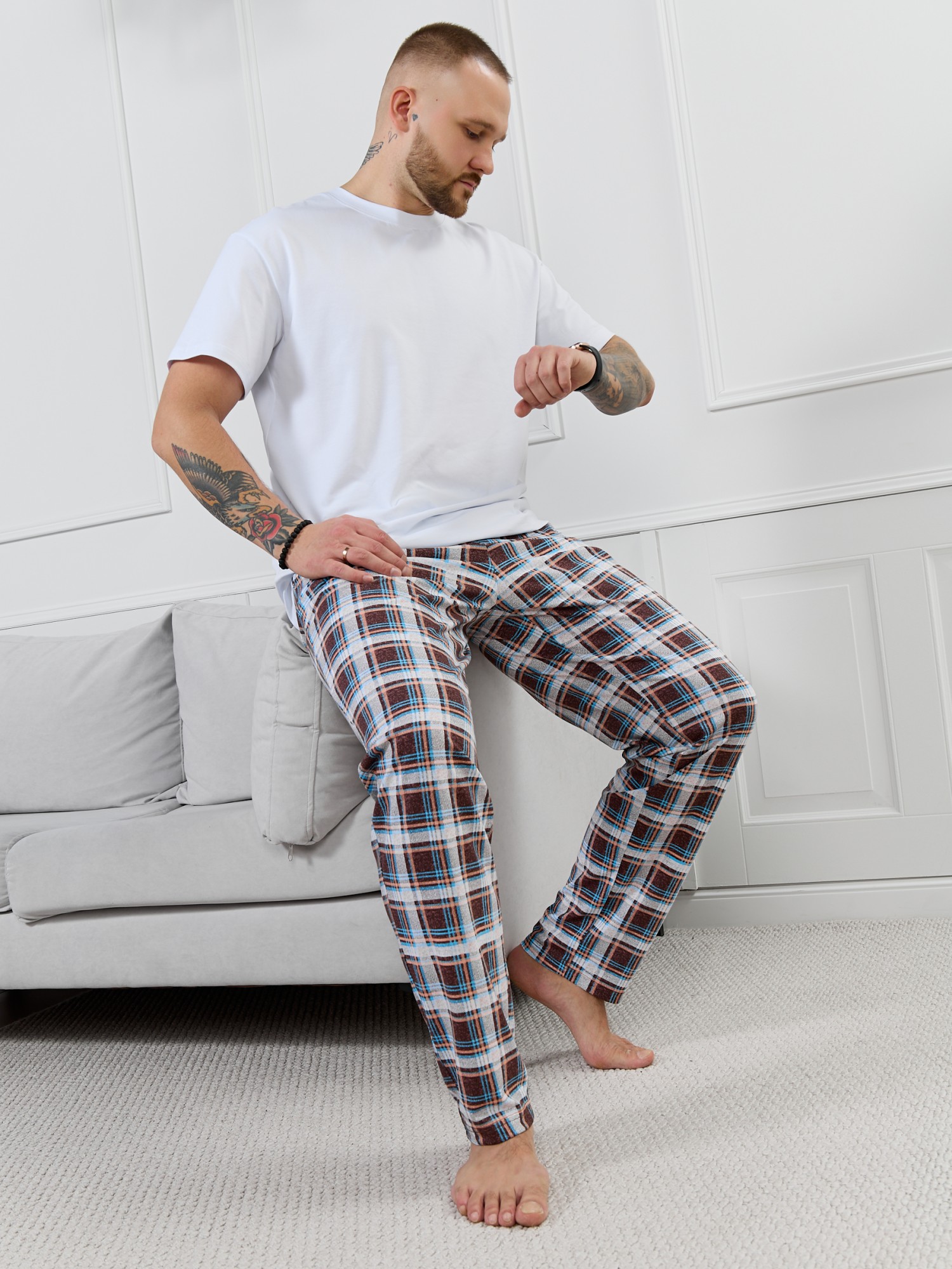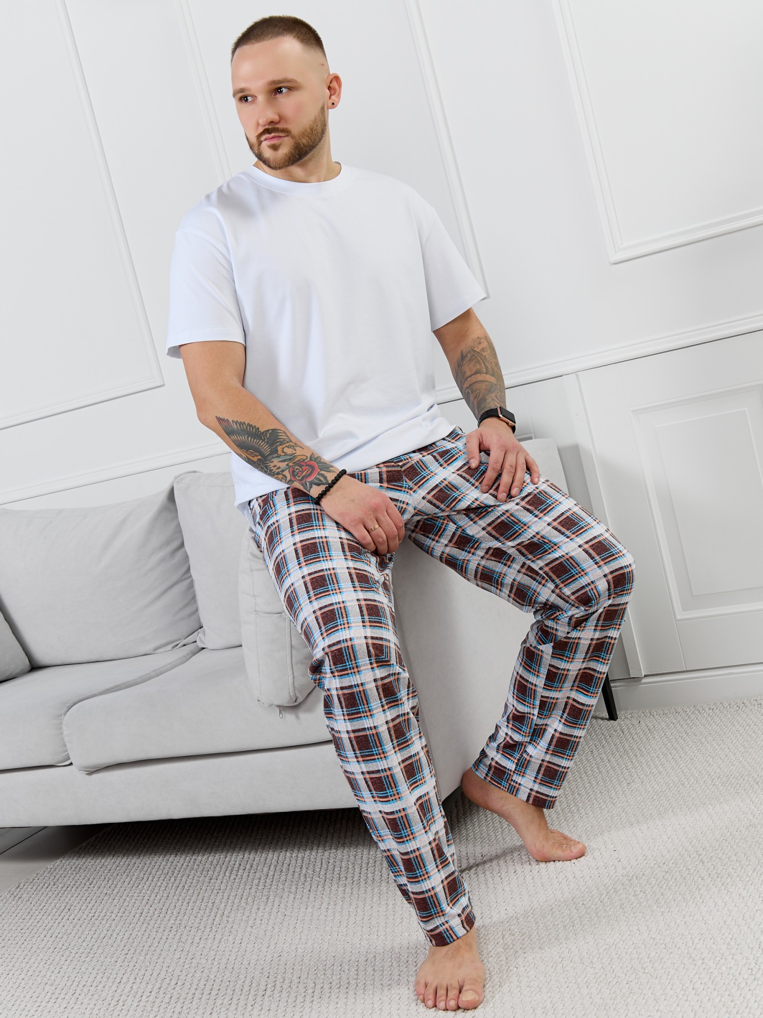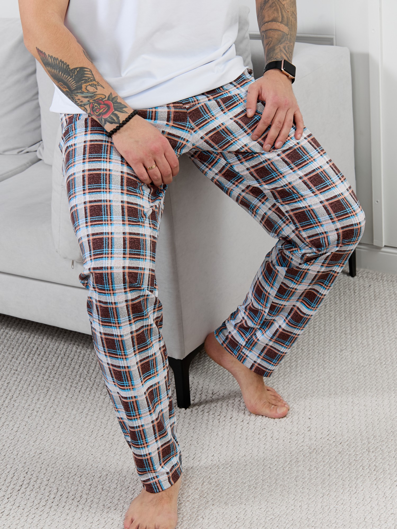 Брюки мужские из трикотажного полотна "кулирка" в клетку, свободного покроя, на притачном поясе с эластичной тесьмой внутри, с карманами в боковых швах. Нижние срезы обработаны подгибкой.
