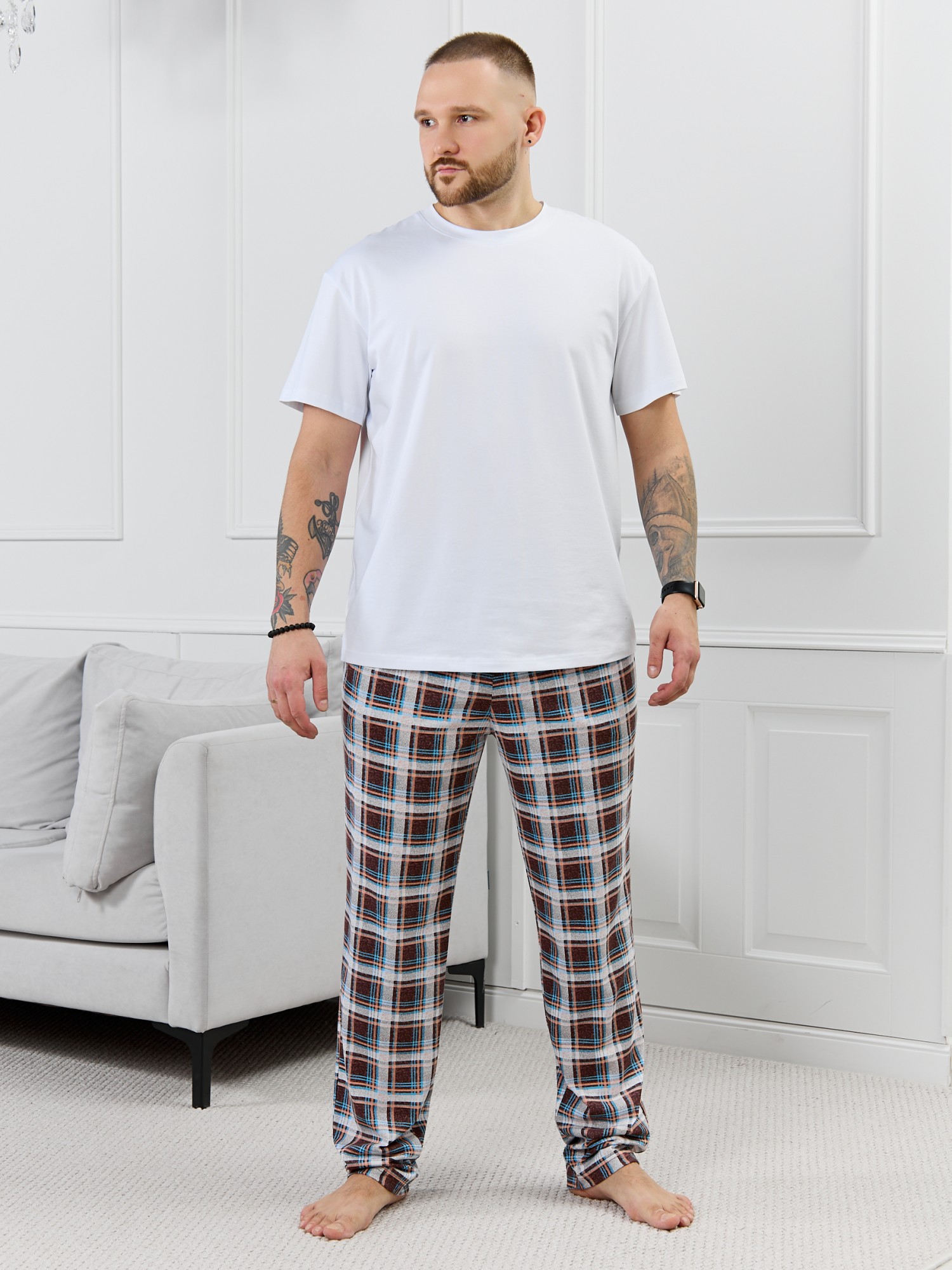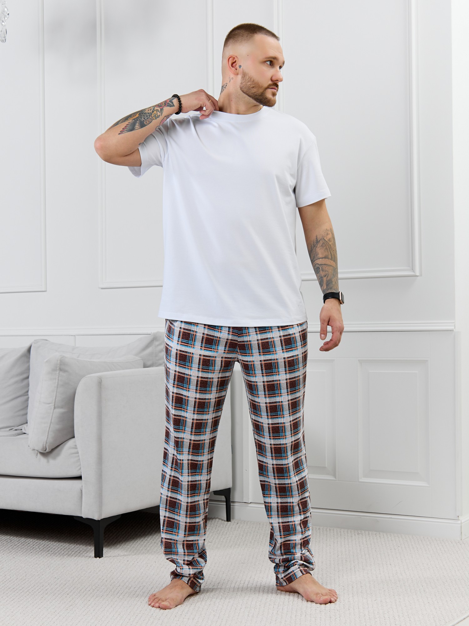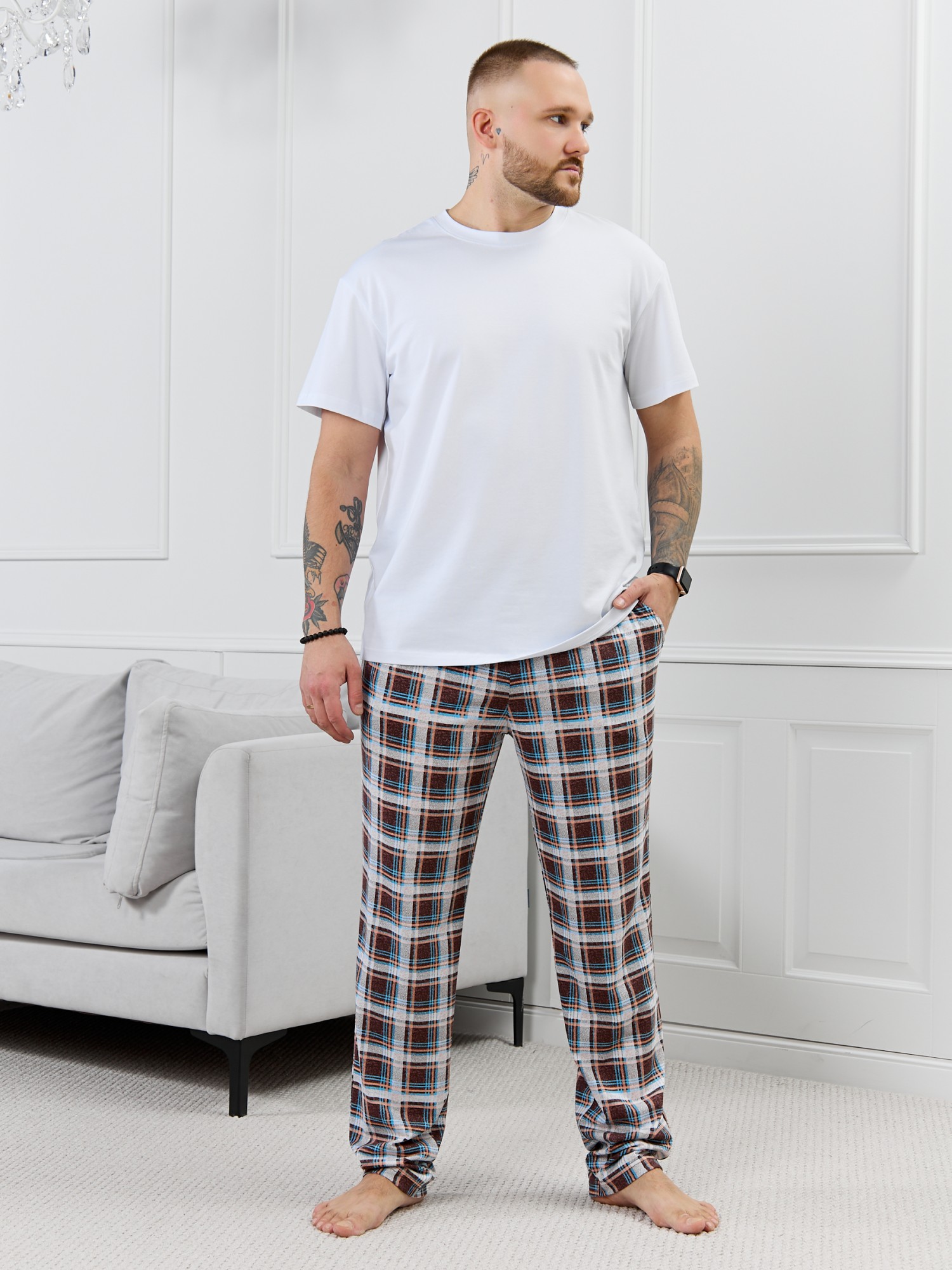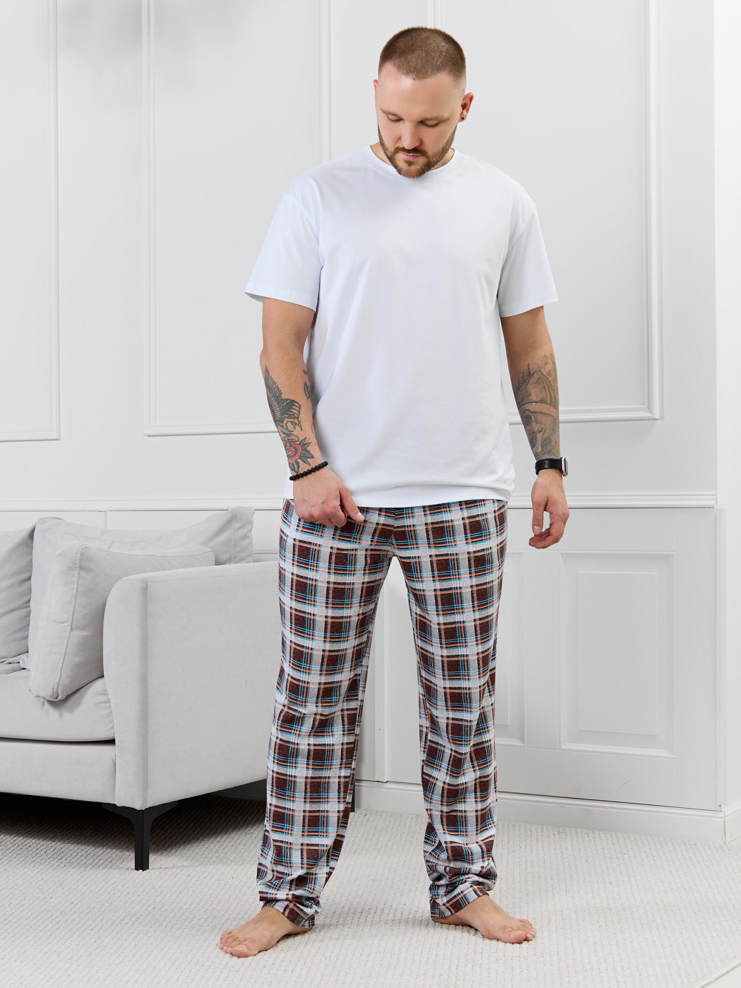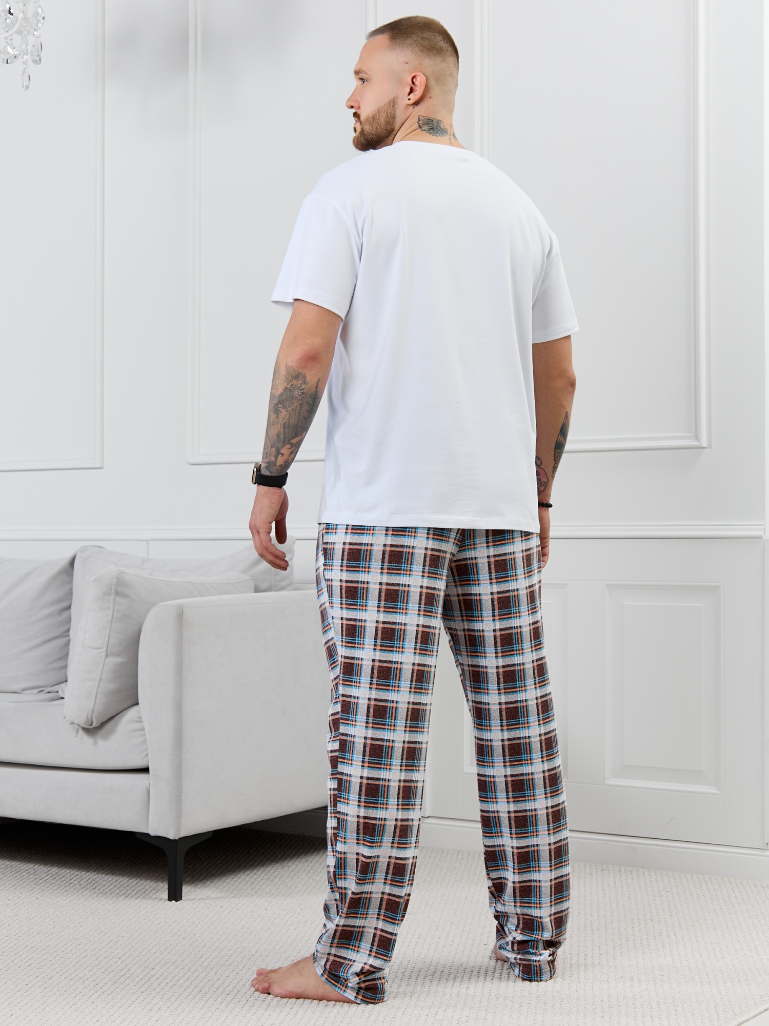 Брюки мужские из трикотажного полотна "кулирка" в клетку, свободного покроя, на притачном поясе с эластичной тесьмой внутри, с карманами в боковых швах. Нижние срезы обработаны подгибкой.