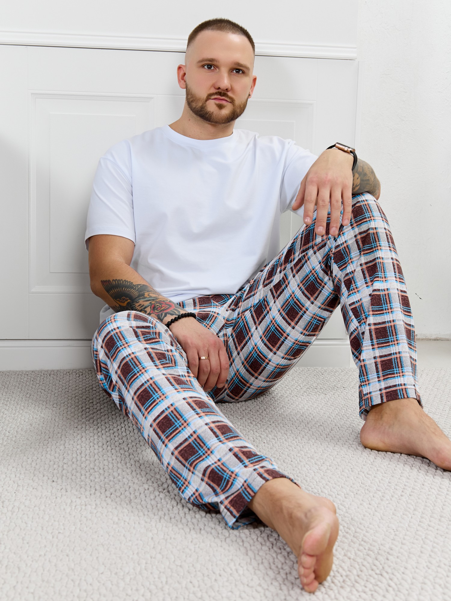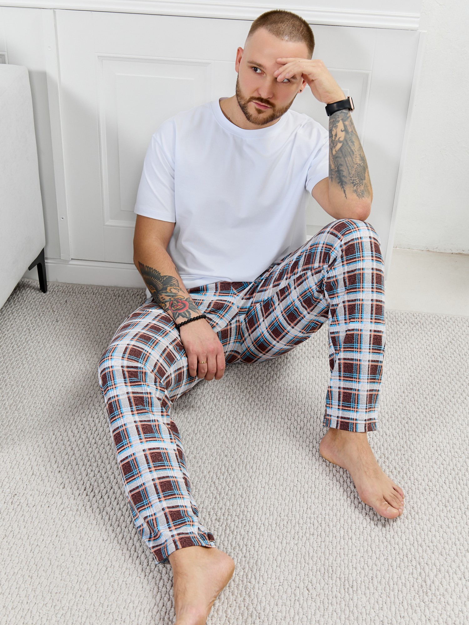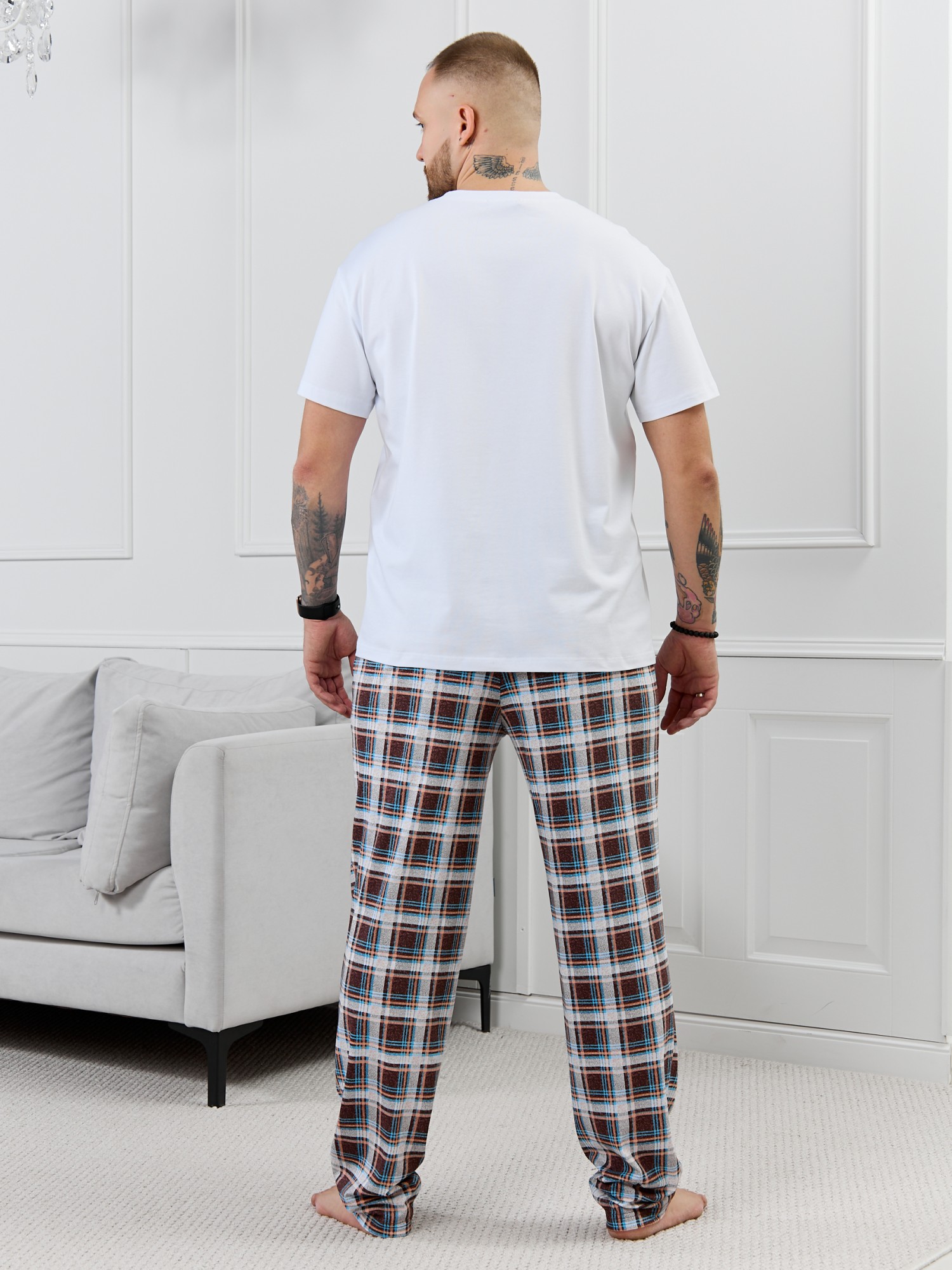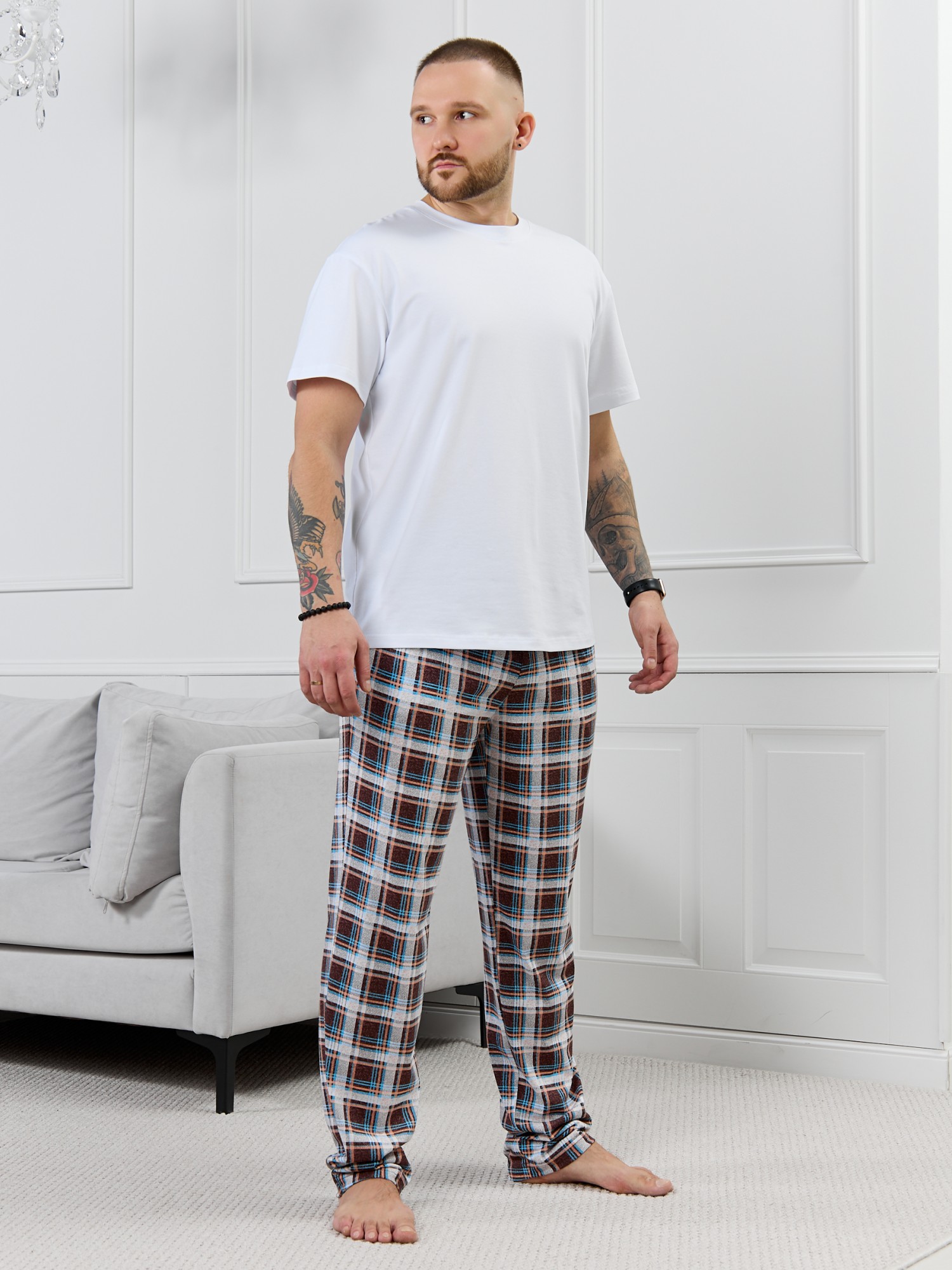 Брюки мужские из трикотажного полотна "кулирка" в клетку, свободного покроя, на притачном поясе с эластичной тесьмой внутри, с карманами в боковых швах. Нижние срезы обработаны подгибкой.