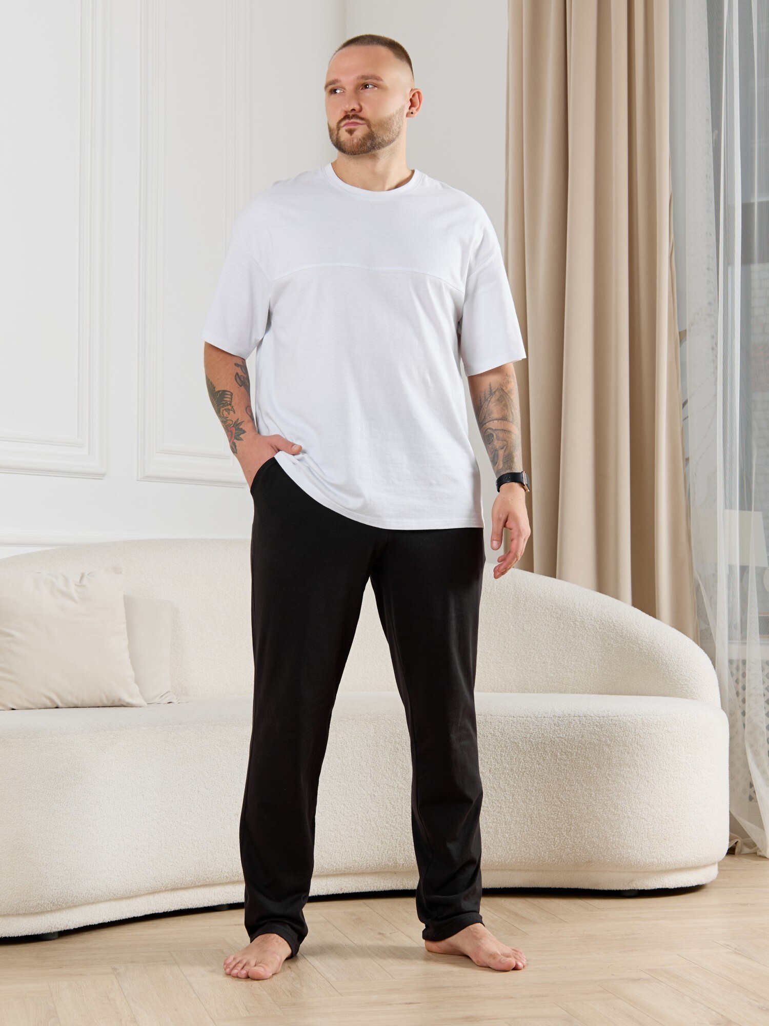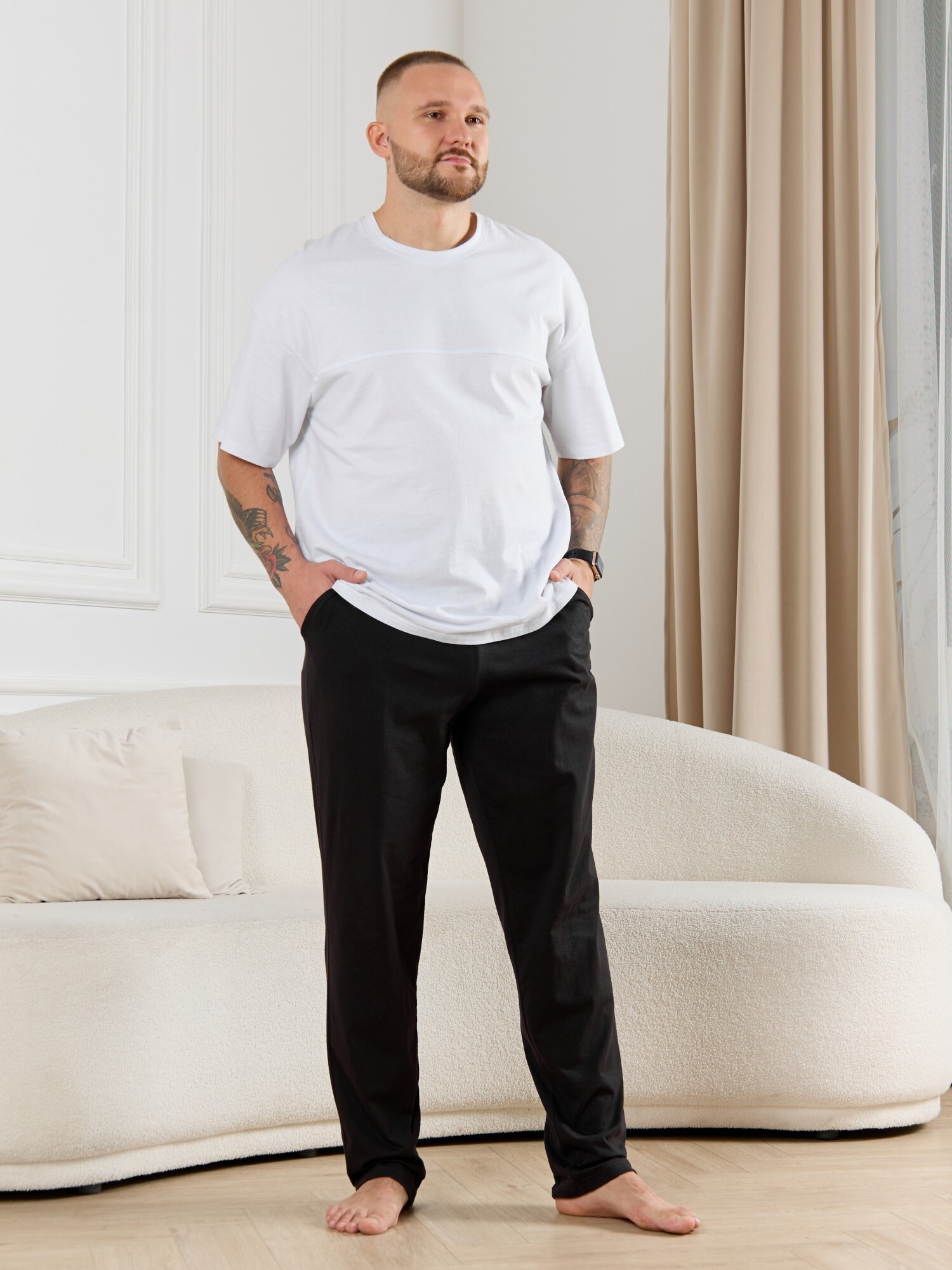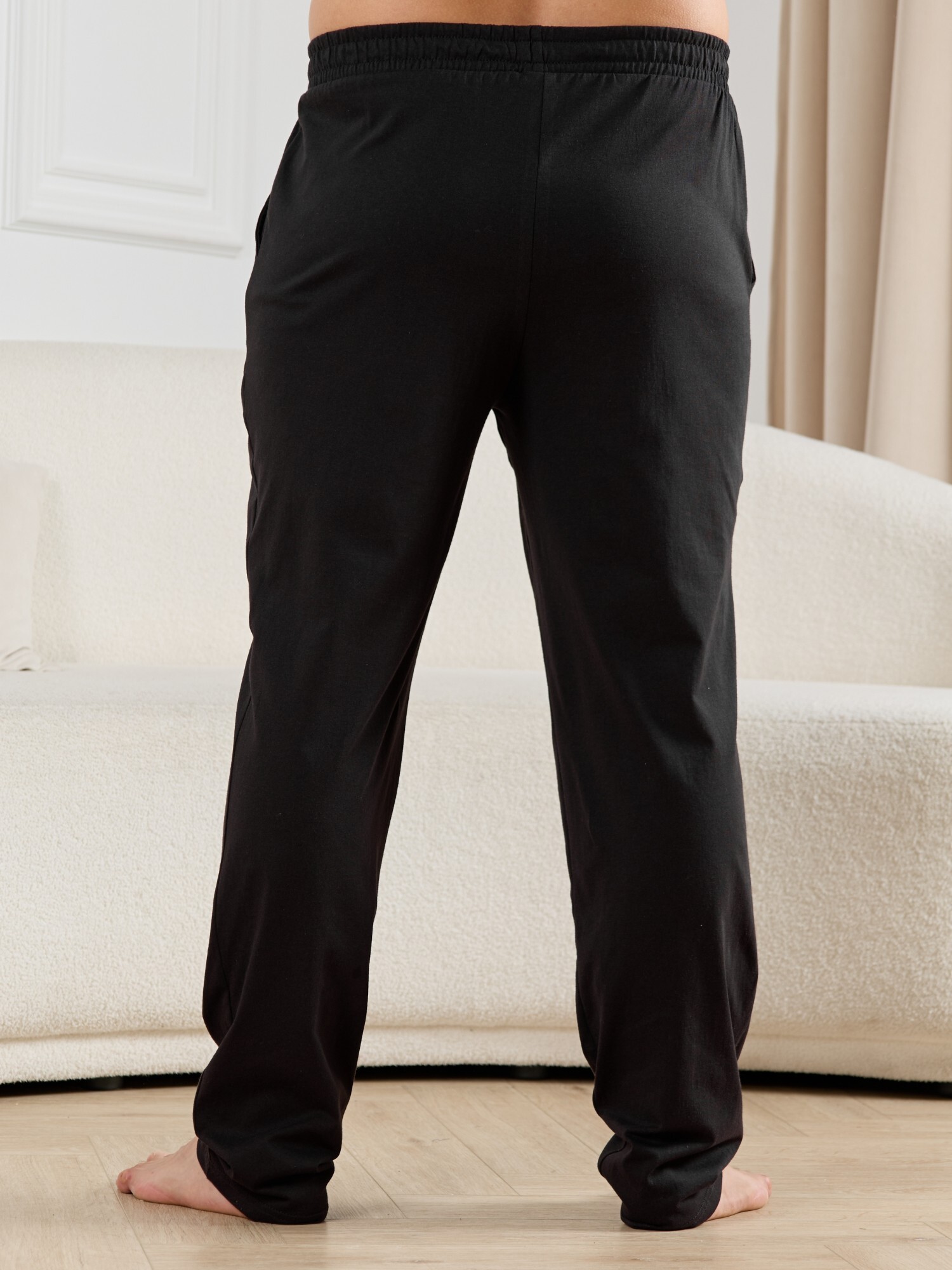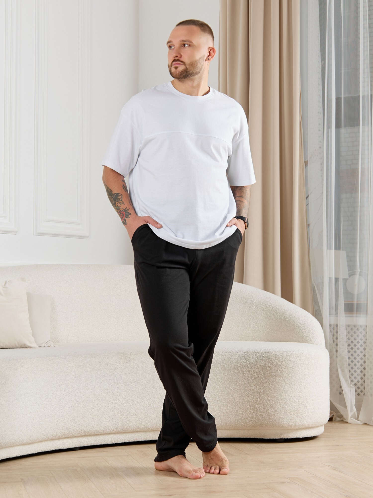 Брюки мужские из гладкокрашенго трикотажного полотна "кулирная гладь", свободного покроя, на притачном поясе с эластичной тесьмой внутри, с карманами в боковых швах. Нижние срезы обработаны подгибкой.