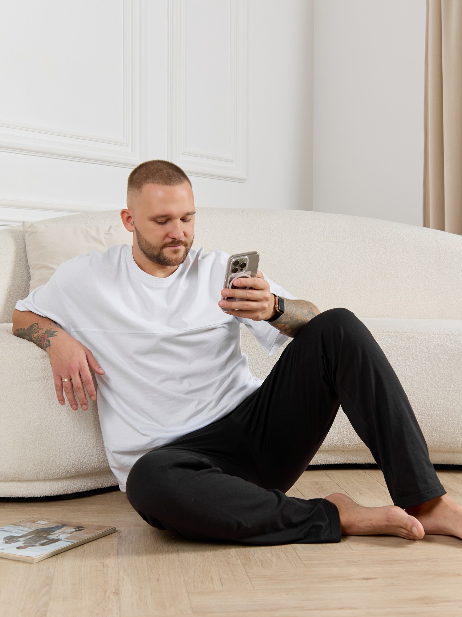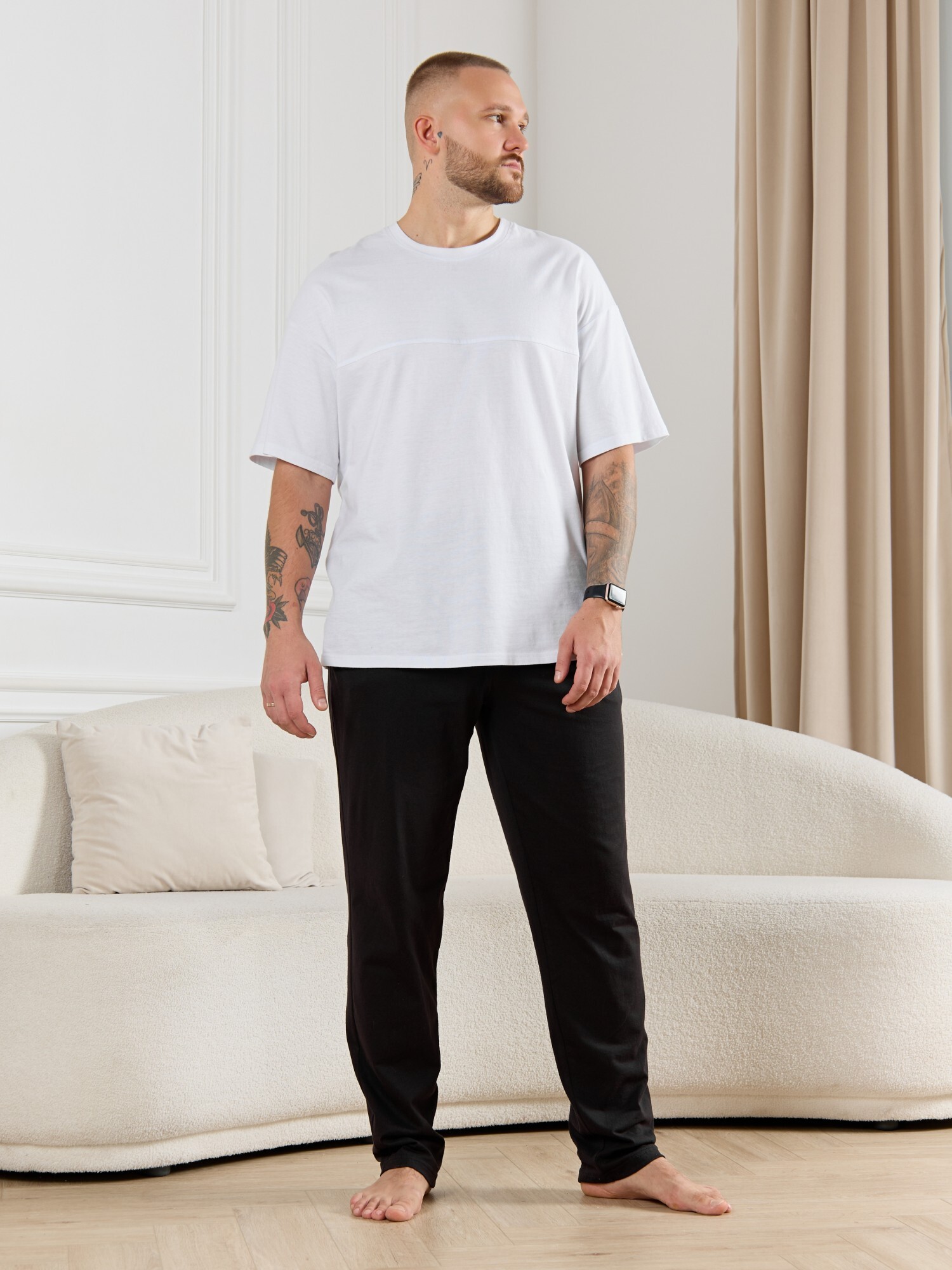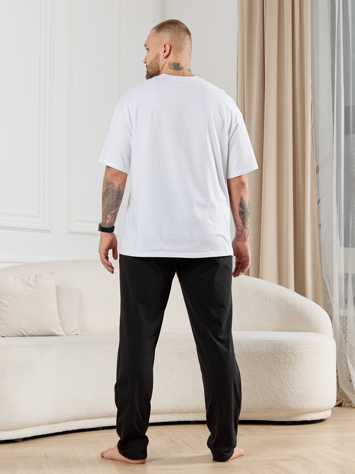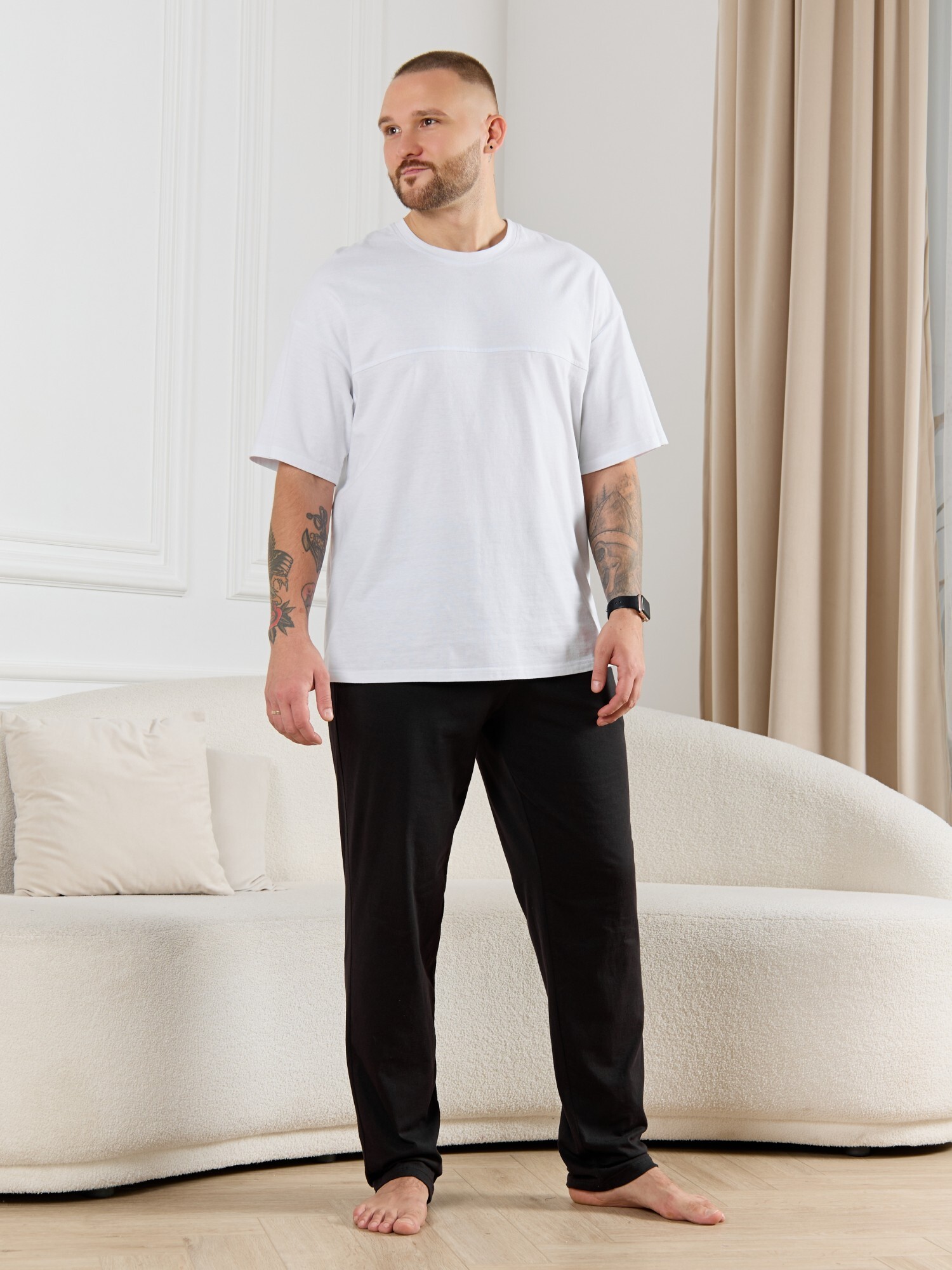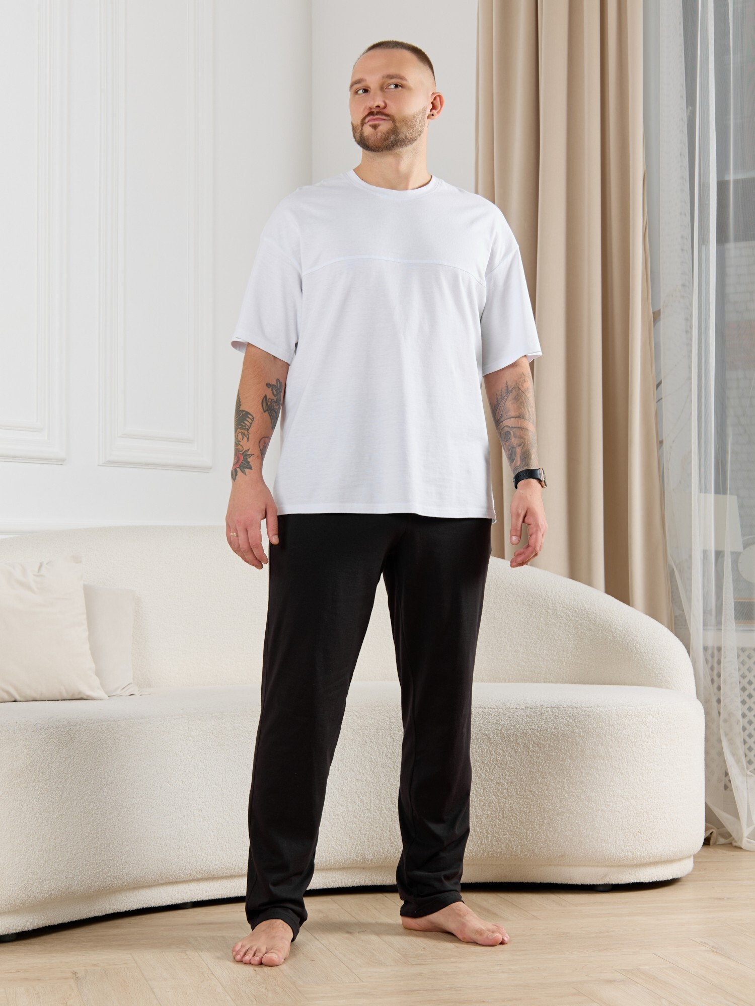 Брюки мужские из гладкокрашенго трикотажного полотна "кулирная гладь", свободного покроя, на притачном поясе с эластичной тесьмой внутри, с карманами в боковых швах. Нижние срезы обработаны подгибкой.