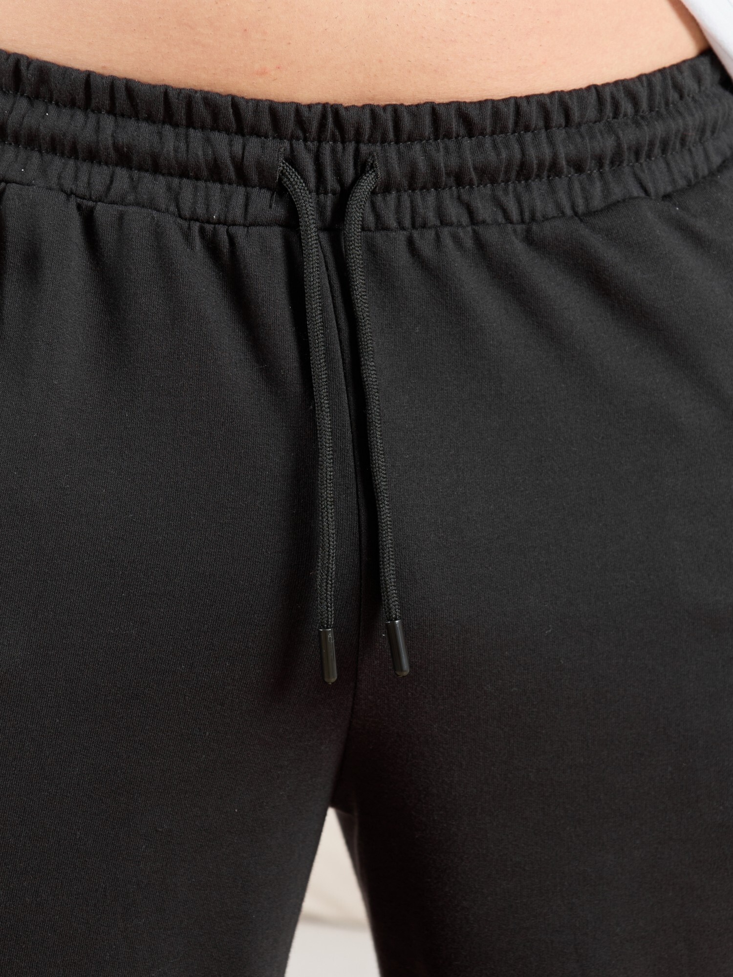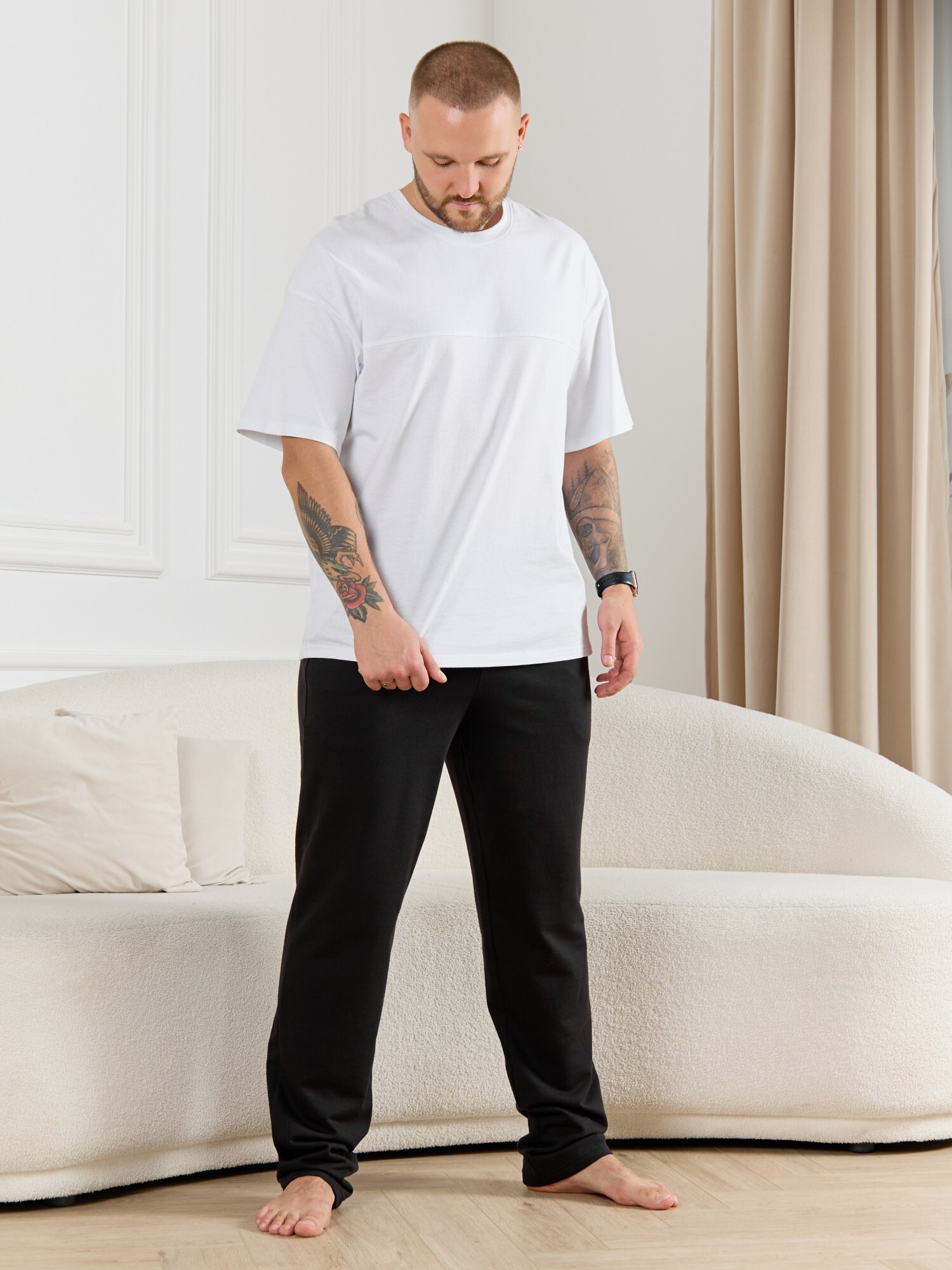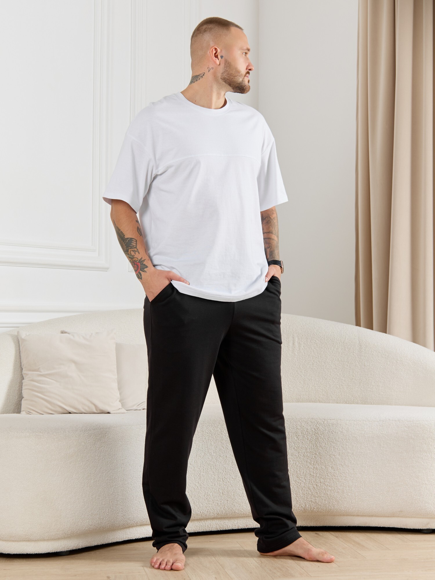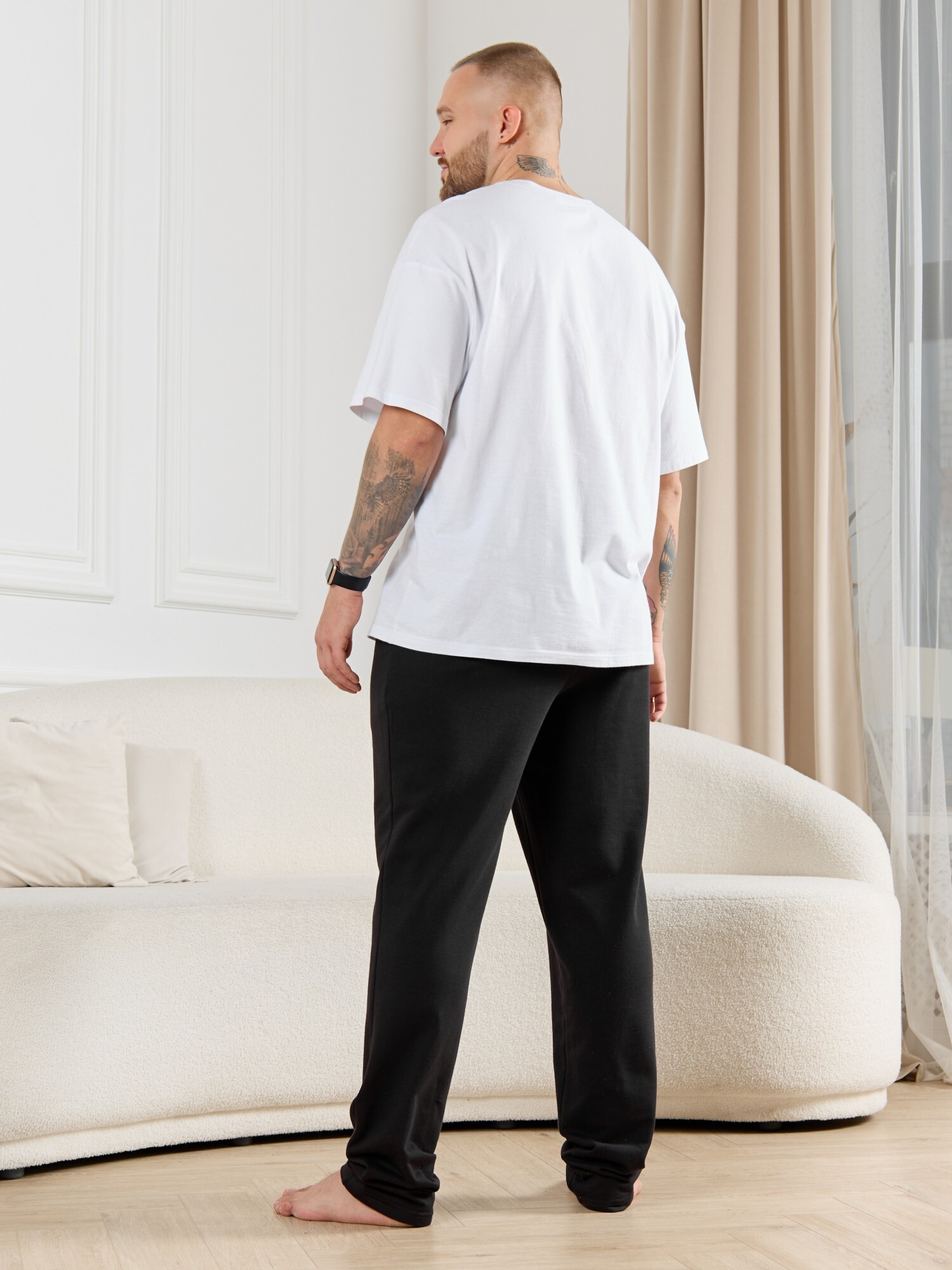 Брюки мужские из гладкокрашенго трикотажного полотна "футер 2-нитка", свободного покроя, на притачном поясе с эластичной тесьмой внутри, с карманами в боковых швах. Нижние срезы обработаны подгибкой.