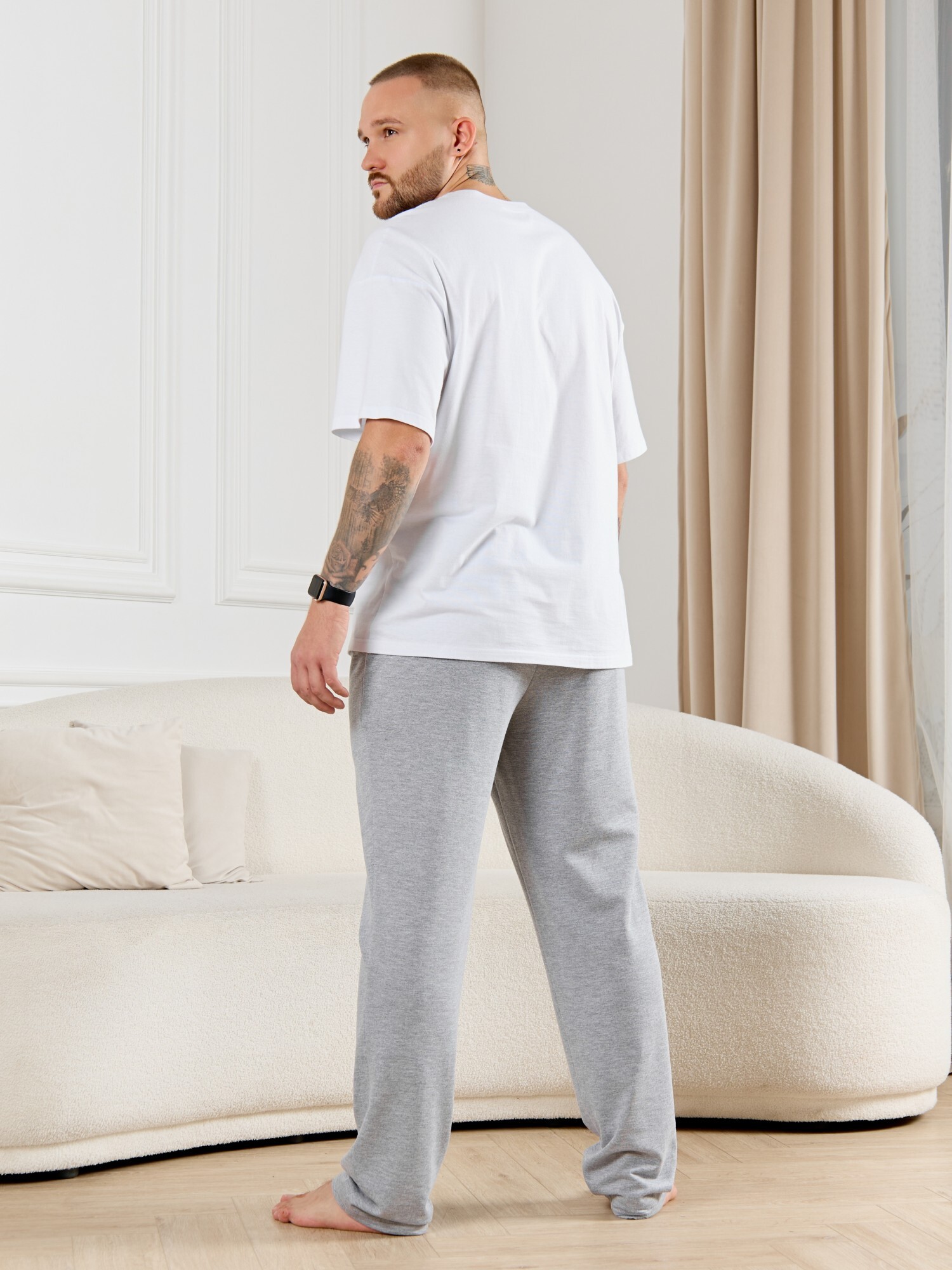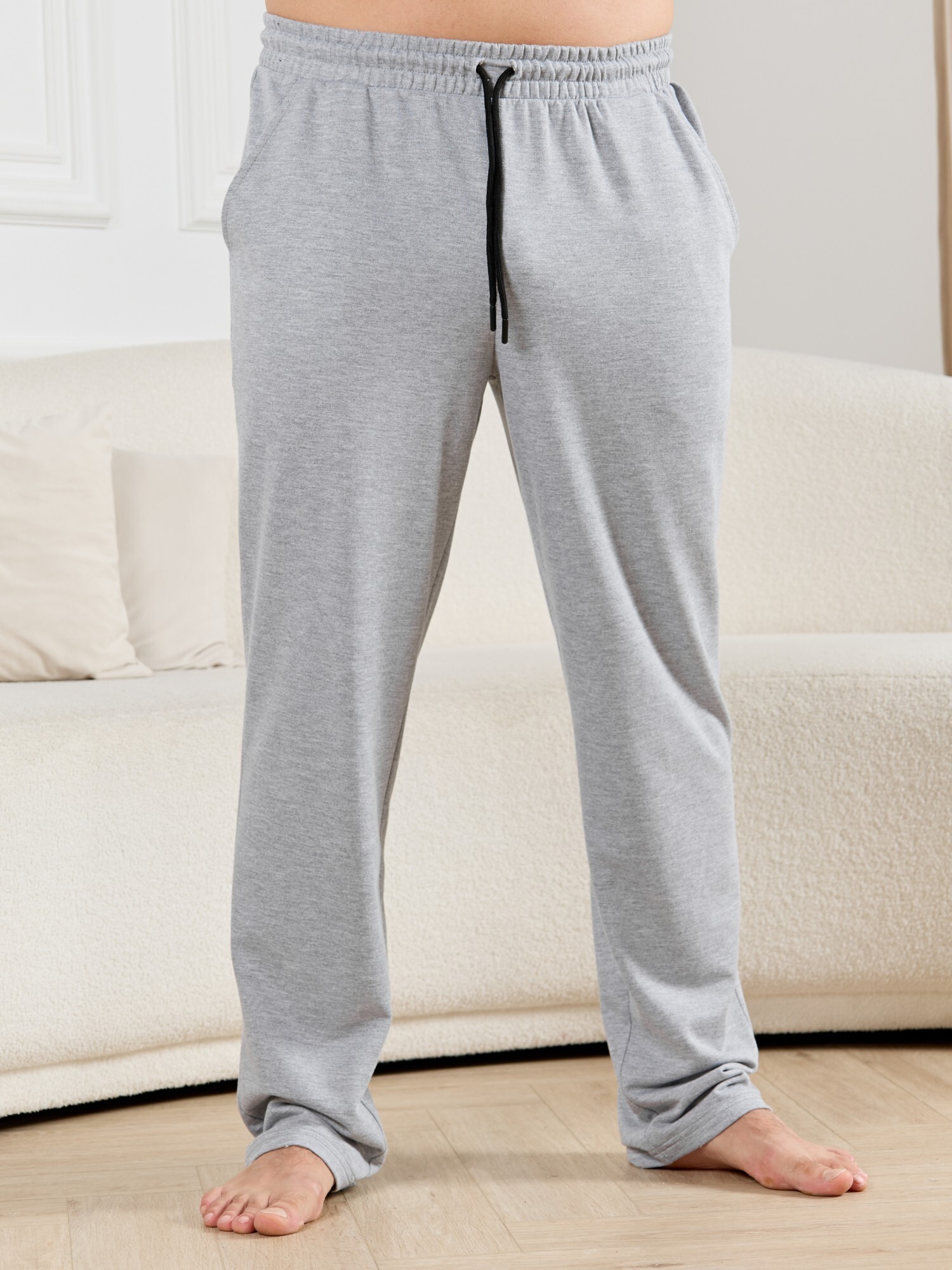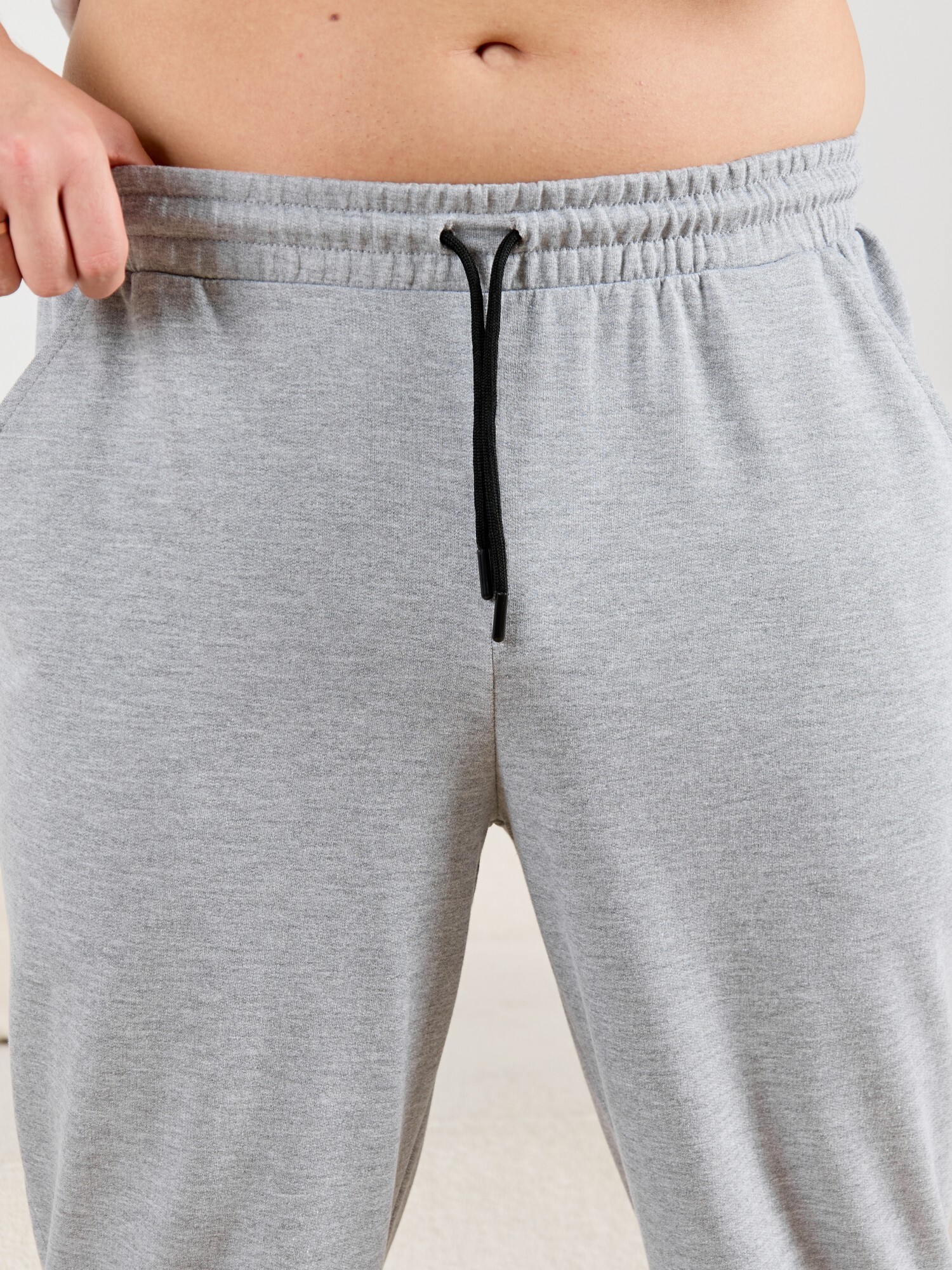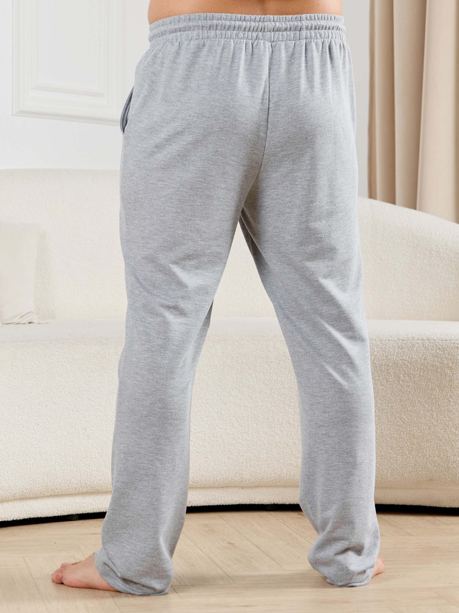Брюки мужские из гладкокрашенго трикотажного полотна "футер 2 -нитка", свободного покроя, на притачном поясе с эластичной тесьмой внутри, с карманами в боковых швах. Нижние срезы обработаны подгибкой.