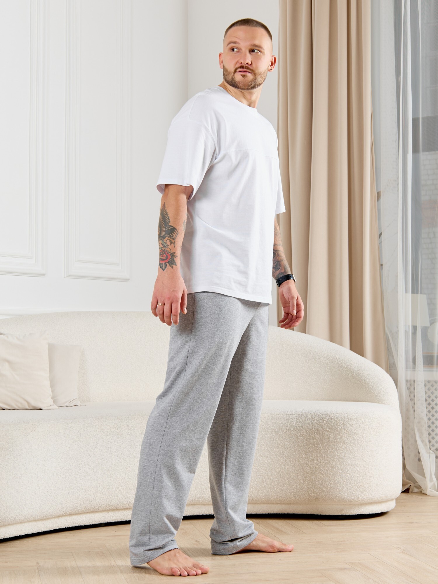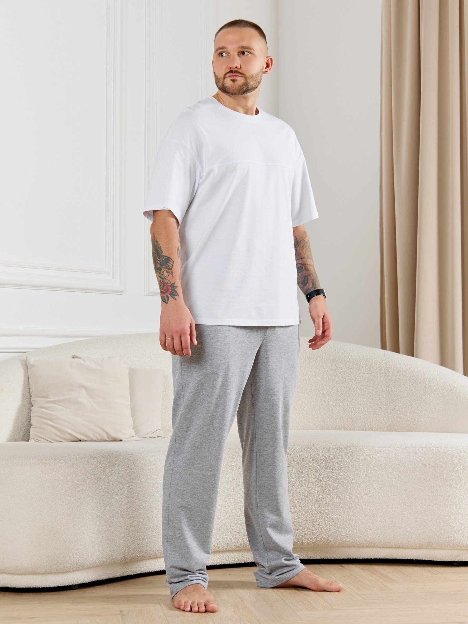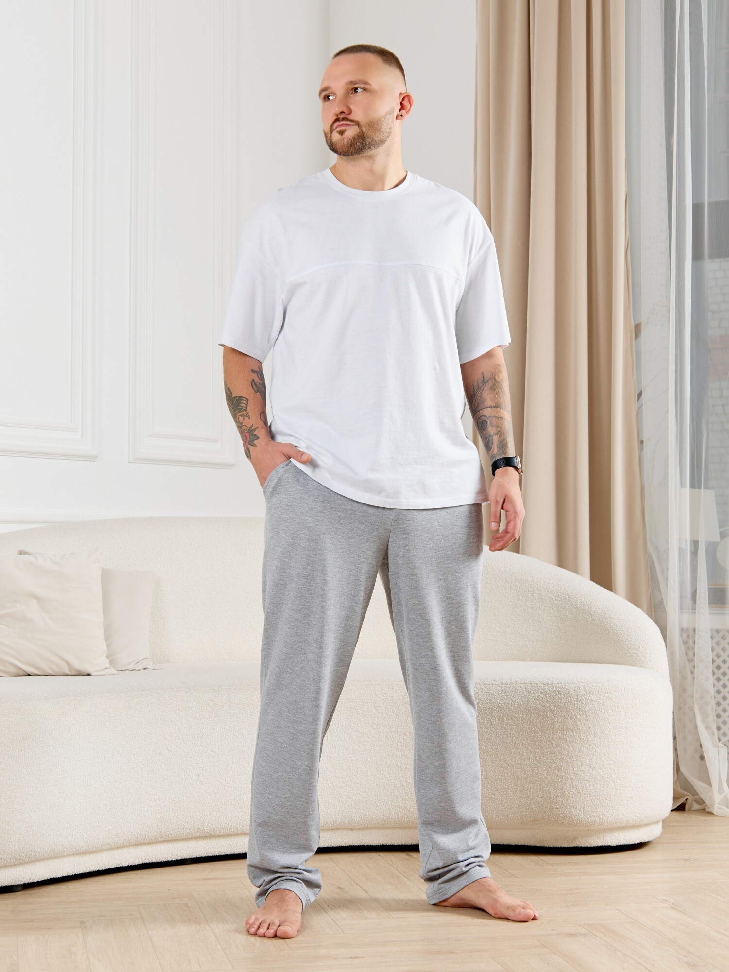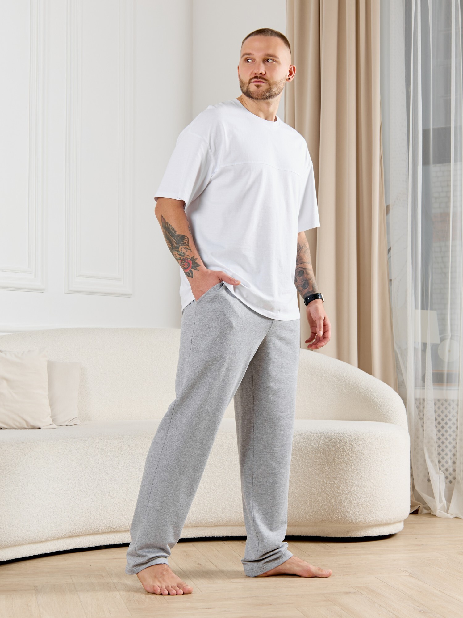 Брюки мужские из гладкокрашенго трикотажного полотна "футер 2 -нитка", свободного покроя, на притачном поясе с эластичной тесьмой внутри, с карманами в боковых швах. Нижние срезы обработаны подгибкой.