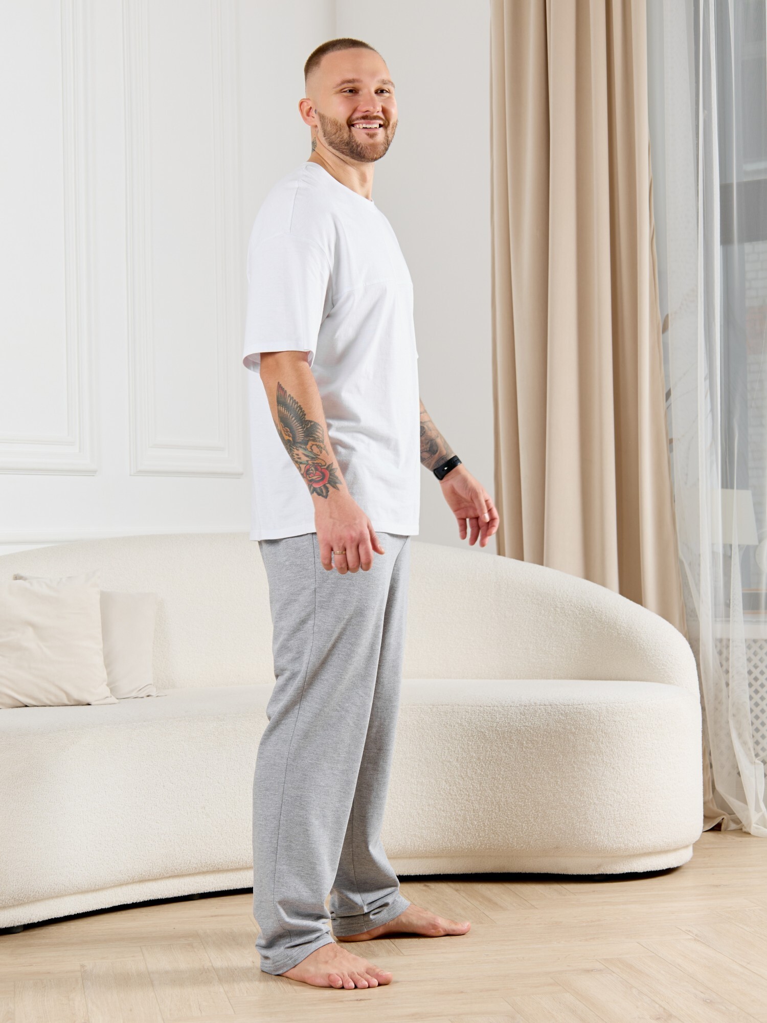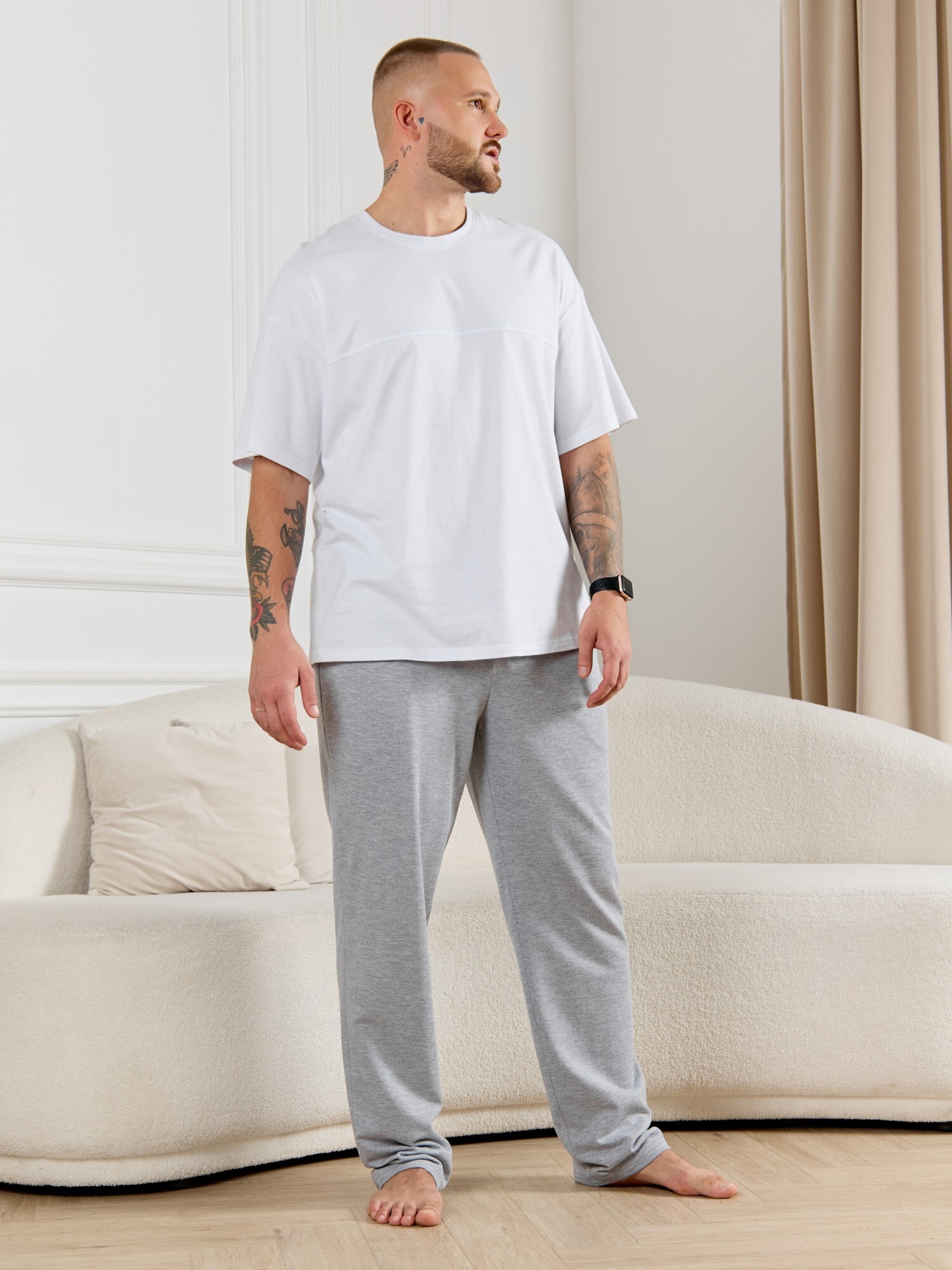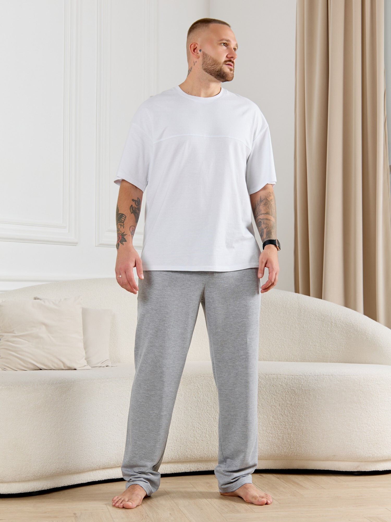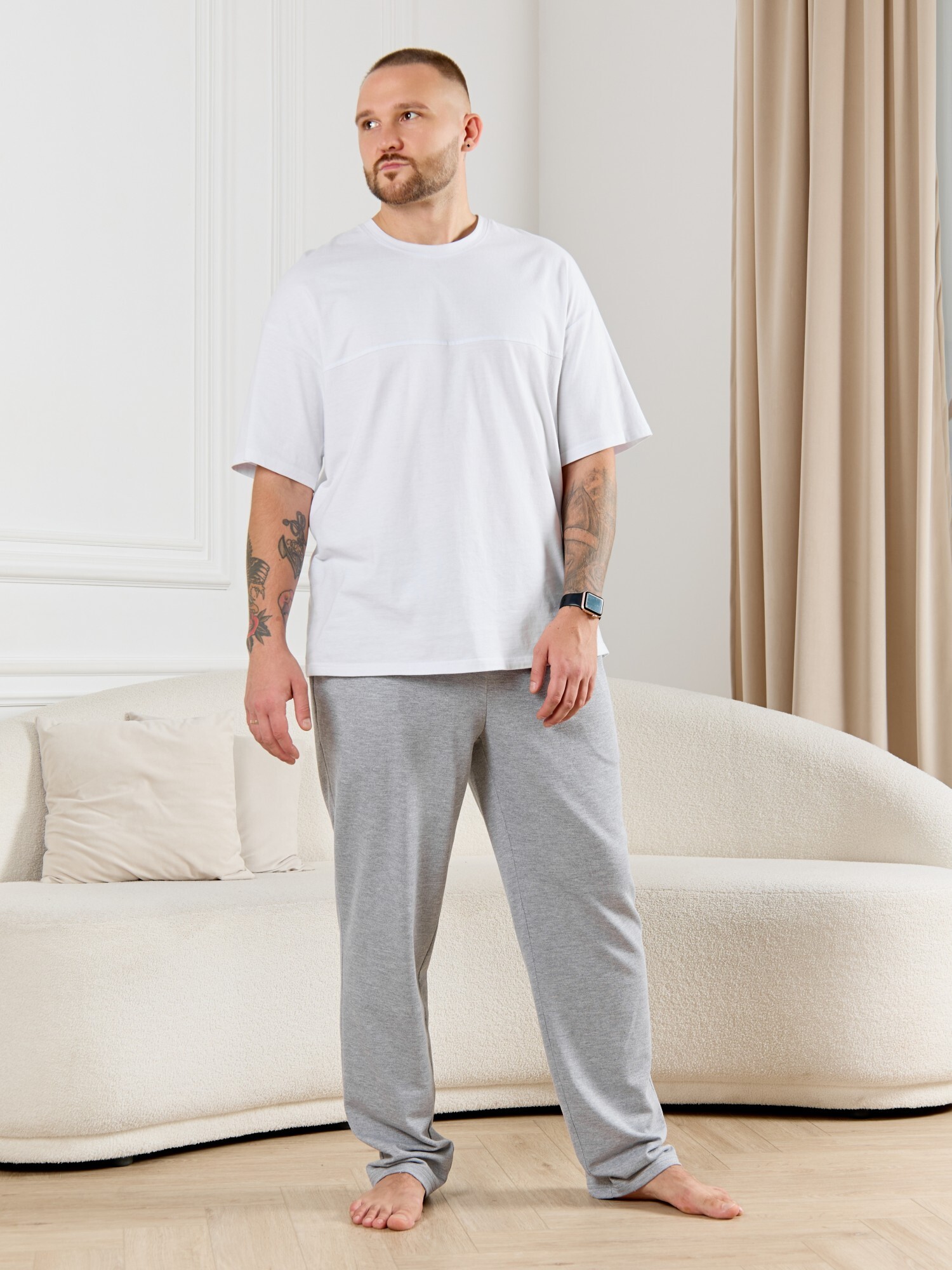 Брюки мужские из гладкокрашенго трикотажного полотна "футер 2 -нитка", свободного покроя, на притачном поясе с эластичной тесьмой внутри, с карманами в боковых швах. Нижние срезы обработаны подгибкой.