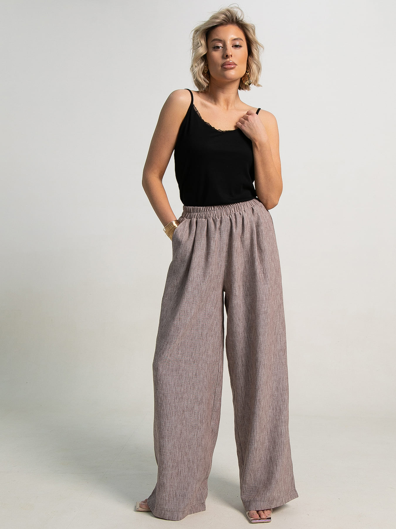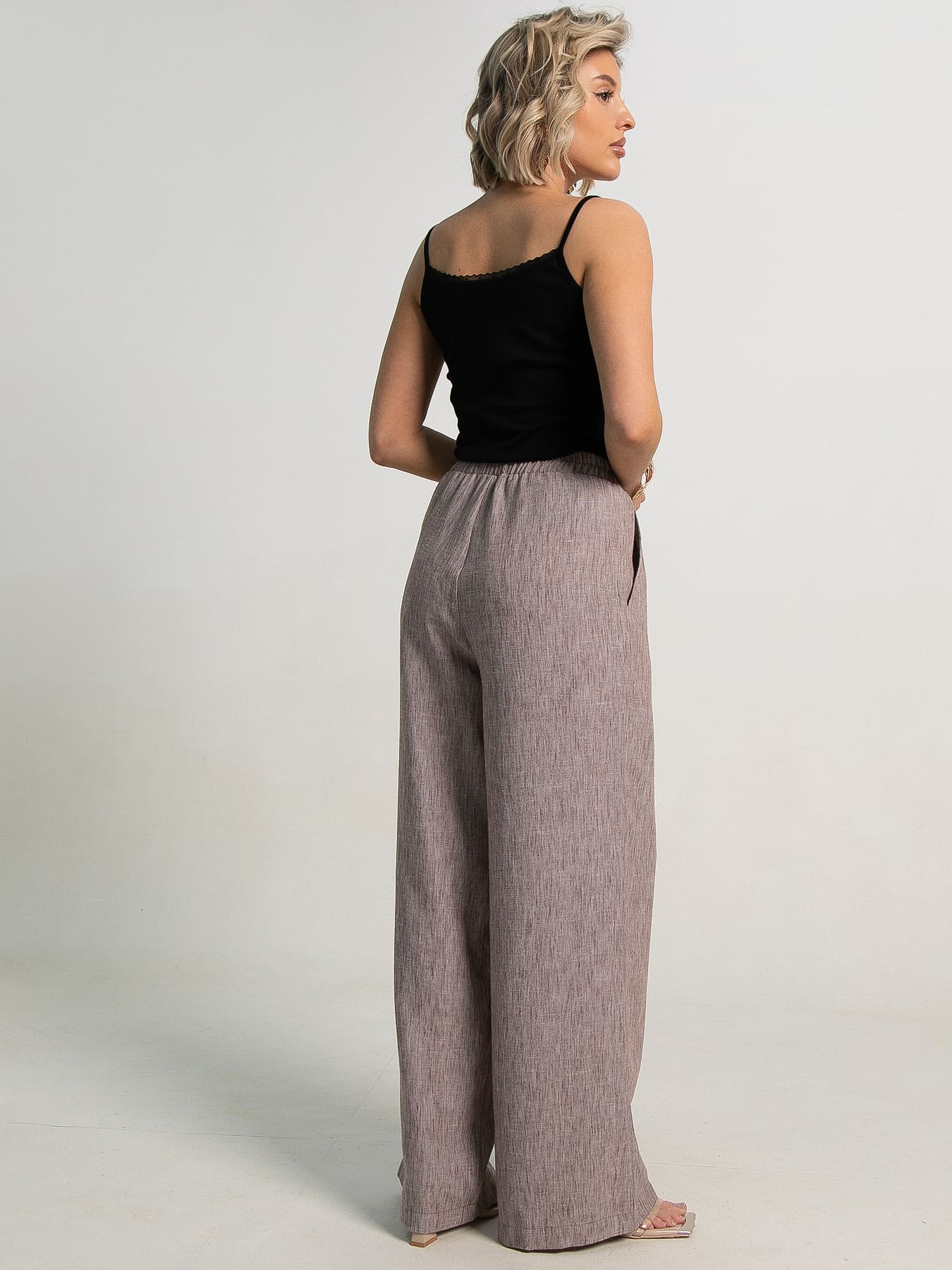 Погрузитесь в лето с нашими женскими широкими брюками изо льна – воплощением легкости, комфорта и непревзойденного стиля. Созданные специально для жарких дней, они станут вашим незаменимым спутником в любой ситуации. По талии резинка. Вы будете чувствовать себя свежо и комфортно даже в самые знойные дни, забыв о дискомфорте. Два удобных кармана, расположенных по бокам, добавляют функциональности и завершают образ. Эти летние брюки – настоящая находка для создания стильных комплектов. Комбинируйте их с легкой блузой для элегантного повседневного наряда или с топом для более расслабленного и трендового образа. Они станут прекрасной основой для бесконечных вариаций вашего летнего гардероба.