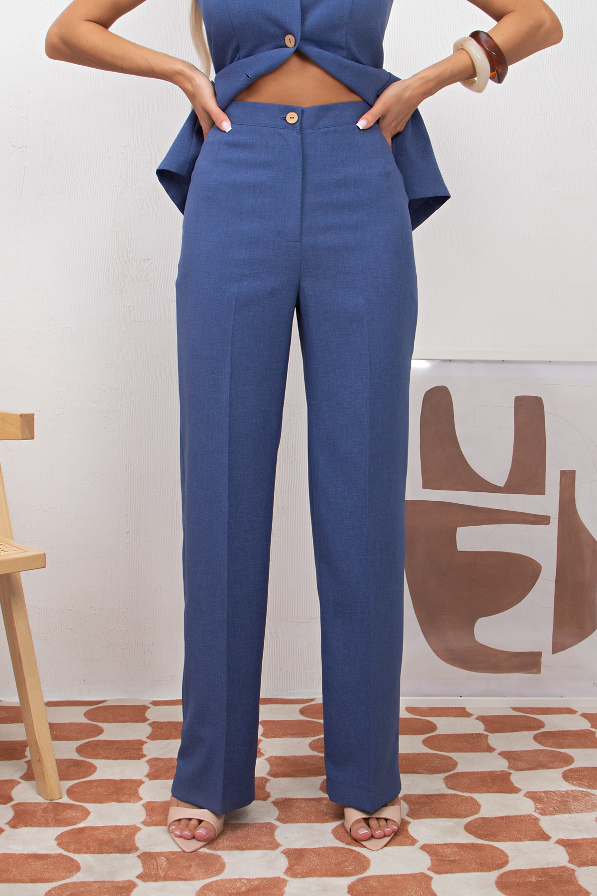 Стильные брюки изготовлены из текстильного полотна. Брюки свободного силуэта. Посадка высокая. Пояс втачной по спинке на резинке. По переду застежка -гульфик. Отутюженные стрелки по всей длине.