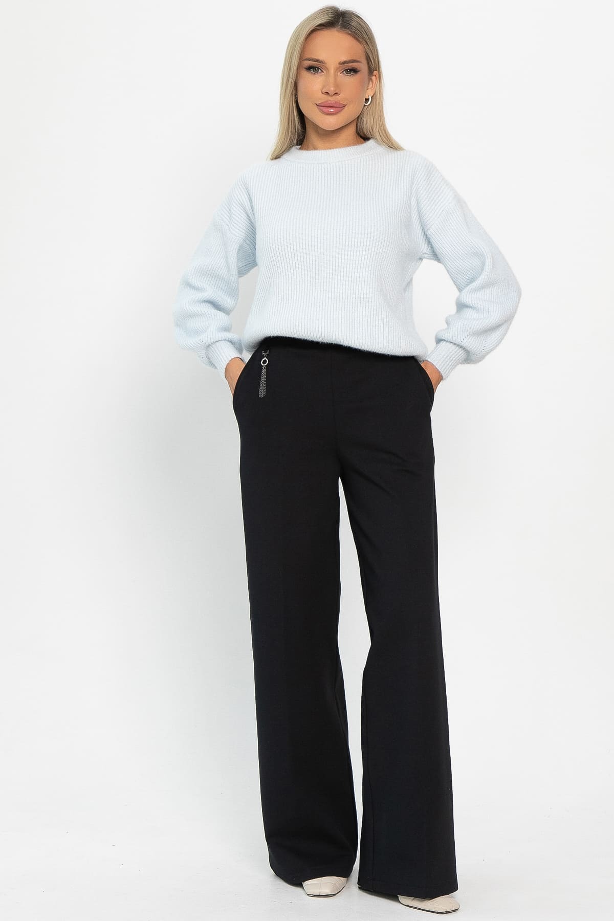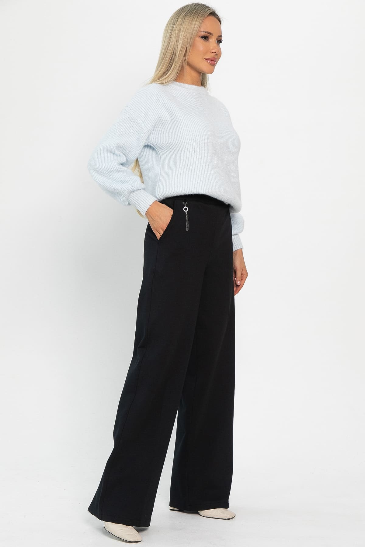 Подарите себе тепло и комфорт! Представляем вам утеплённые брюки-палаццо из трикотажа на флисе. Прекрасный выбор для прохладной погоды. Брюки с карманами в боковом шве, с притачным поясом на резинке. Модель прекрасно сочетается с рубашками, водолазками, объёмными свитерами и туниками. Создавайте разнообразные модные образы с брюками «Адель»!