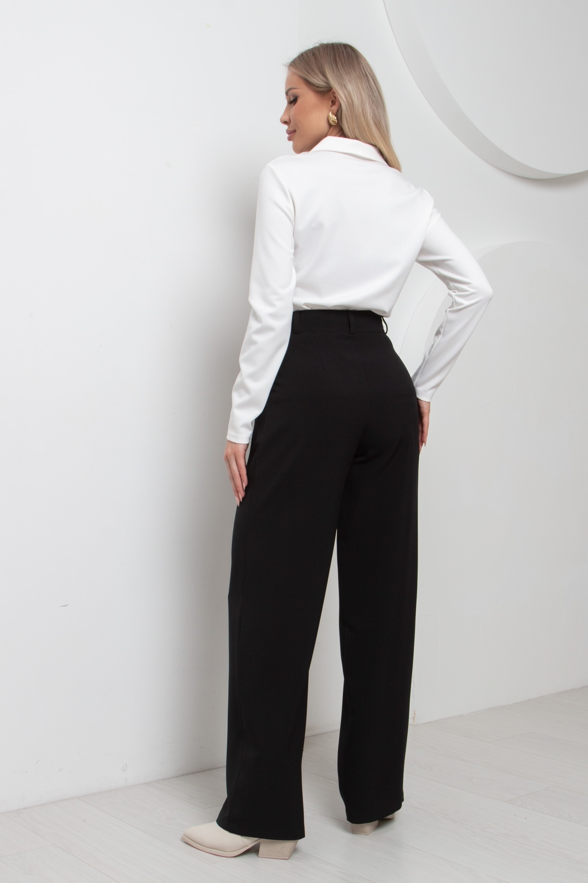 Стильные брюки прямого кроя с высокой посадкой на талии. Верх оформлен притачным поясом со шлевками под ремень и резинкой по спинке. Застежка на пуговицу и молнию оформлена гульфиком. Модель имеет функциональные карманы в боковых швах.