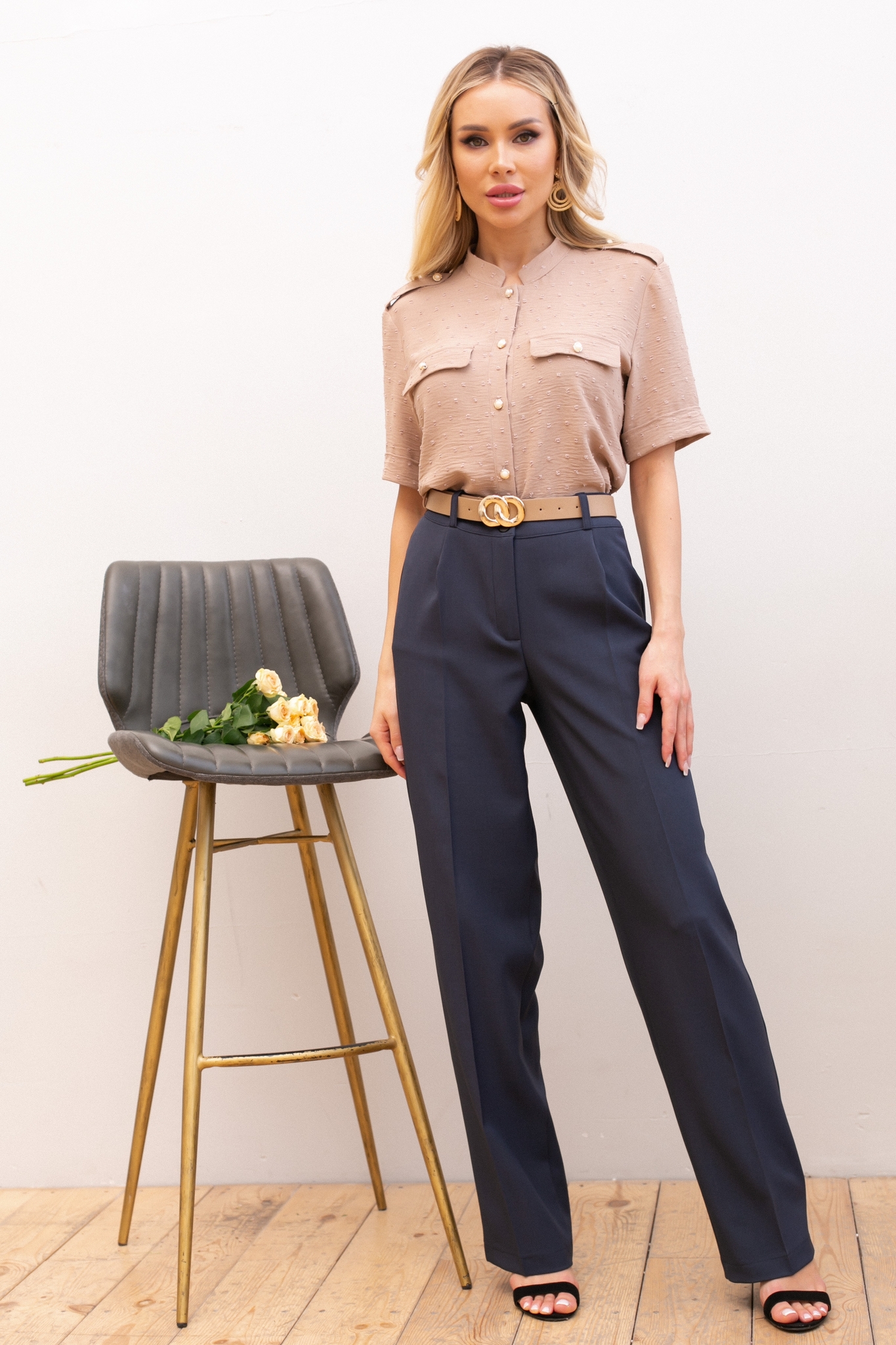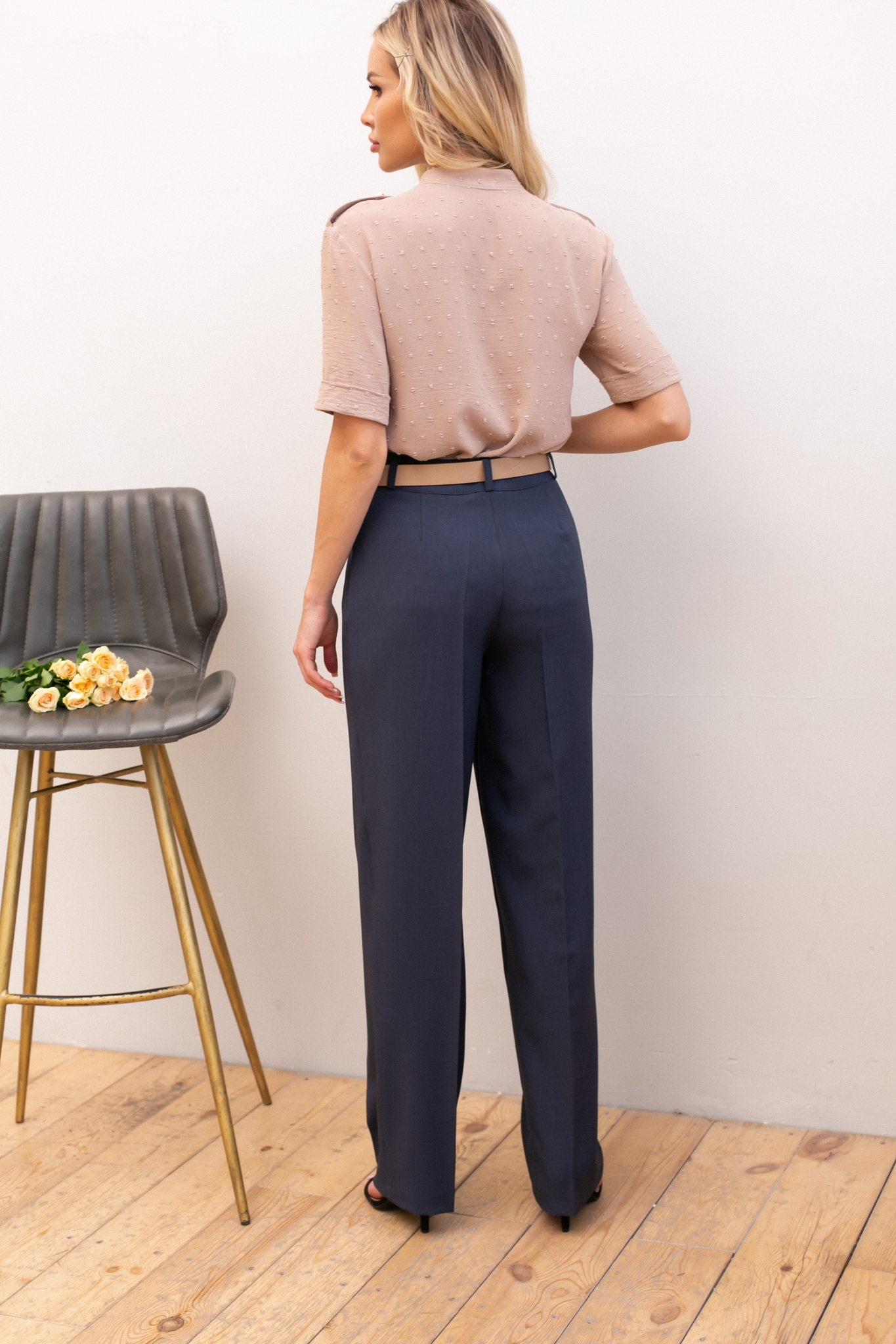 Стильные брюки свободного силуэта из костюмной ткани. Высокая посадка. Втачной пояс, дополнен шлевками под ремень. Застежка - гульфик на пуговицу и молнию. Отутюженные стрелки идут по всей длине брючен.