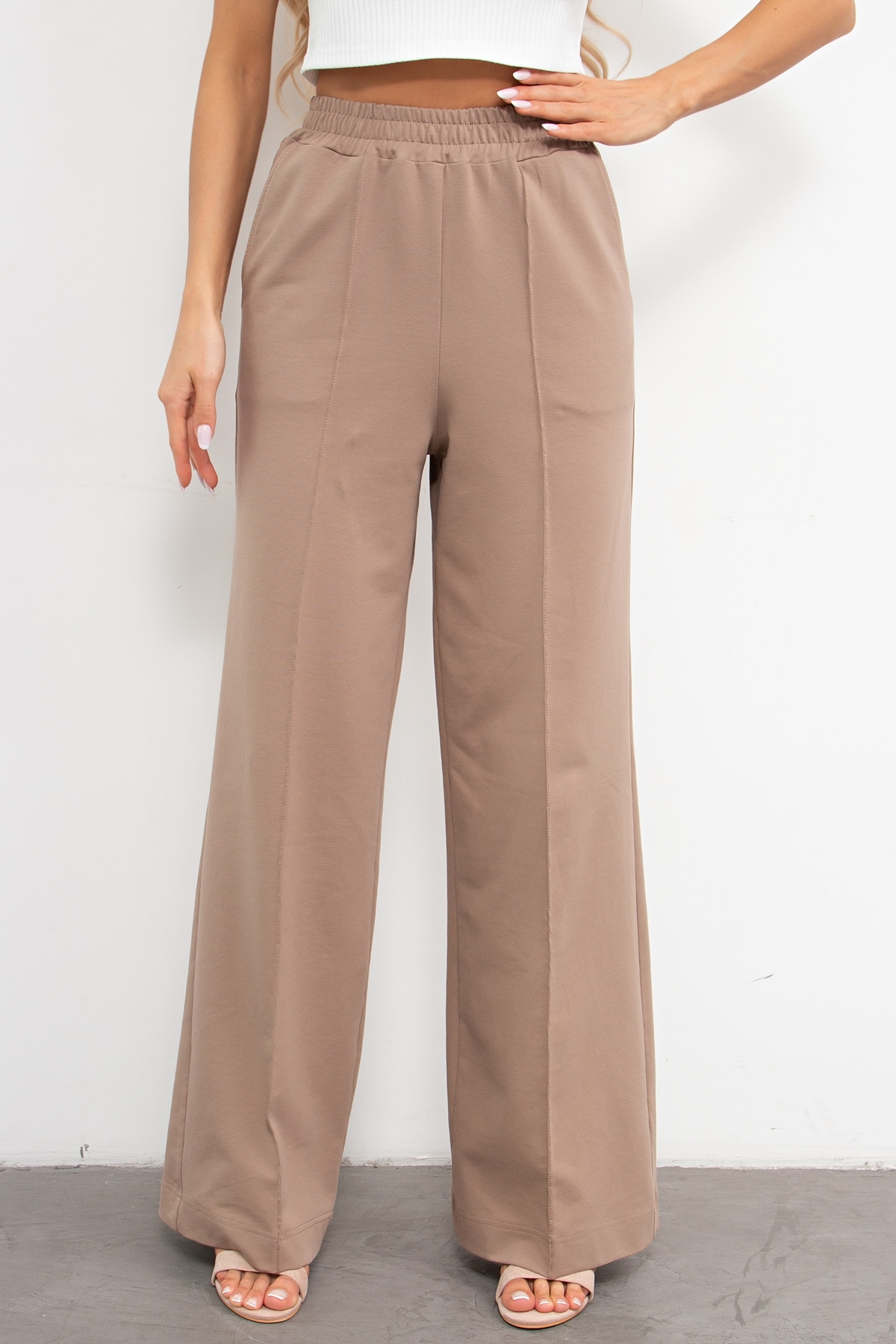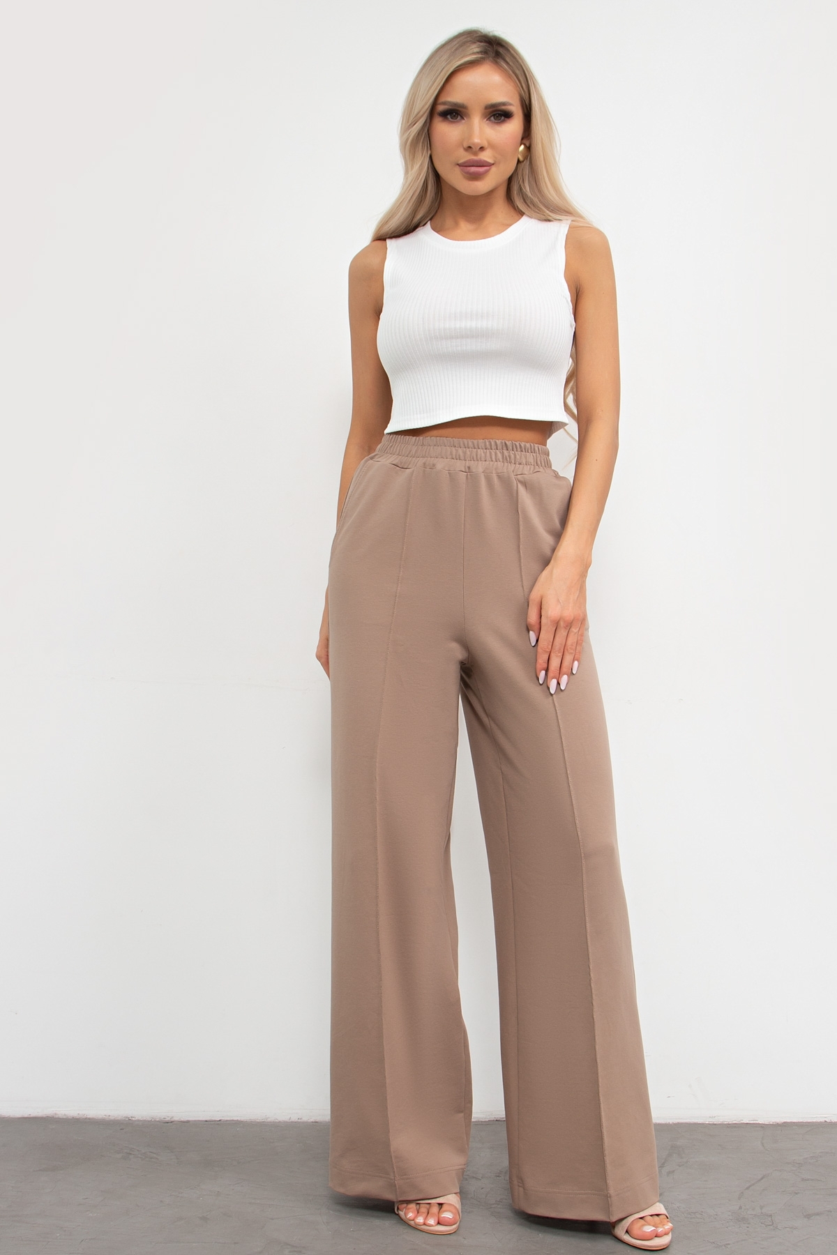 Прямые брюки из трикотажного полотна. Отрезной пояс по линии талии на широкой резинке. Спереди стрелка закреплена строчкой, что зрительно удлиняет ноги. Боковые карманы с отрезным бочком. Модель выполнена из качественного трикотажа, который хорошо держит форму. Прекрасная модель для активных будней и отдыха.