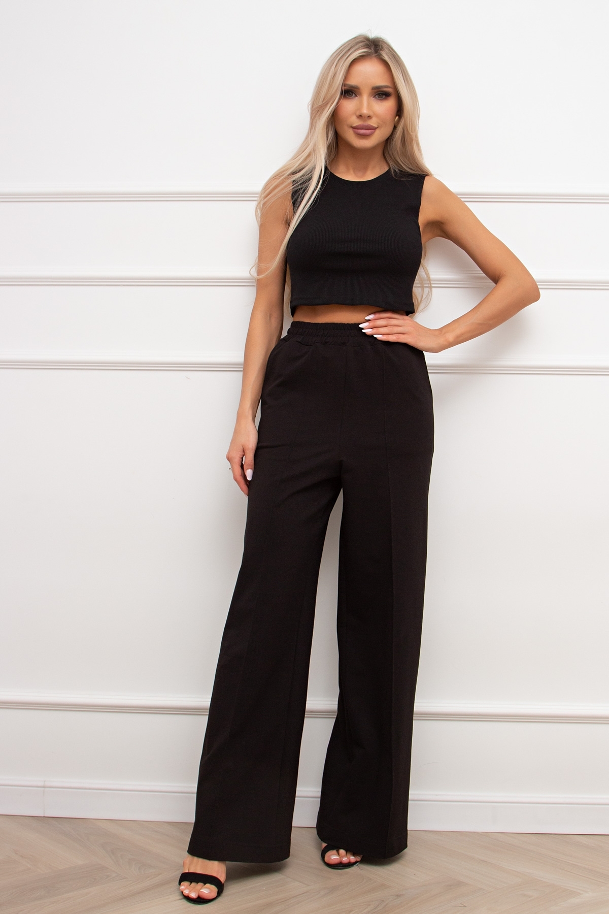 Прямые брюки из трикотажного полотна. Отрезной пояс по линии талии на широкой резинке. Спереди стрелка закреплена строчкой, что зрительно удлиняет ноги. Боковые карманы с отрезным бочком. Модель выполнена из качественного трикотажа, который хорошо держит форму. Прекрасная модель для активных будней и отдыха.