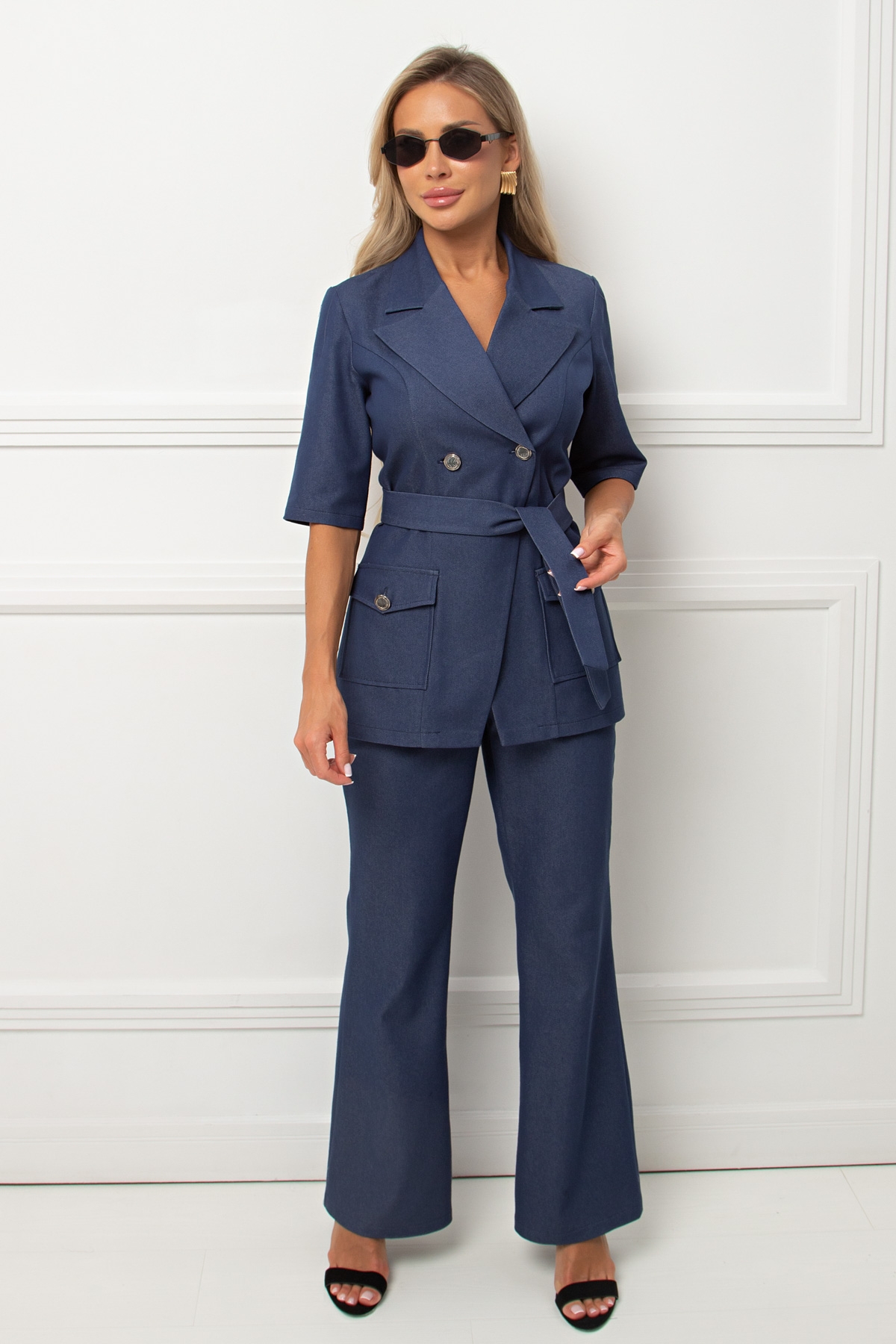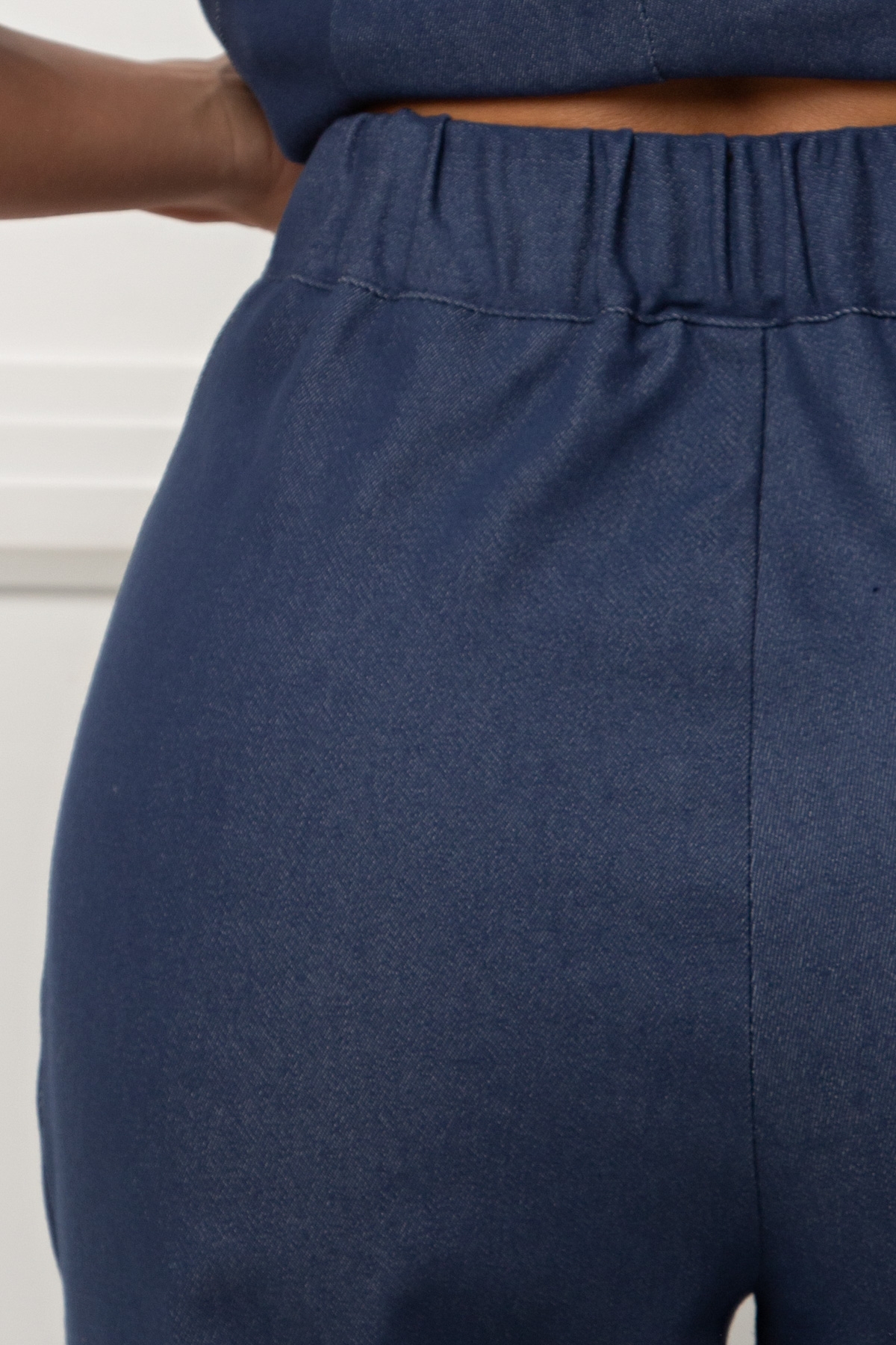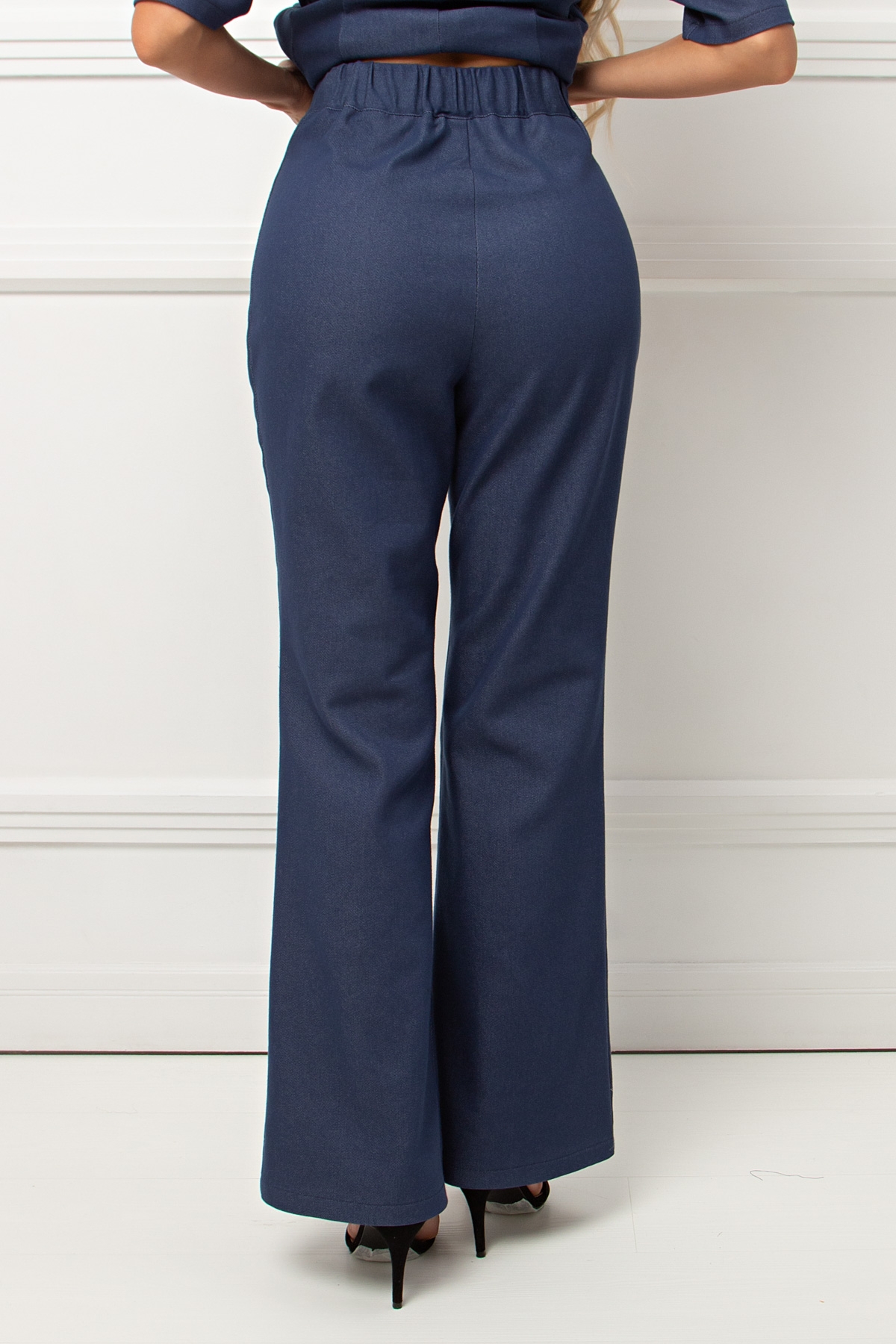 Практичные брюки полуприлегающего силуэта из джинсы. Комфортную посадку на талии обеспечивает притачной пояс с эластичной резинкой по спинке. По переду застежка -гульфик на молнию и пуговицу. К низу брючин небольшой клеш.