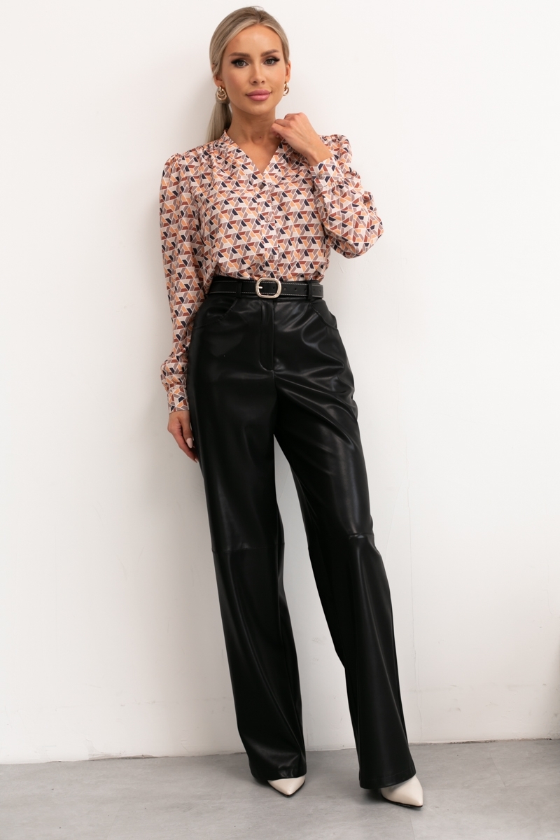Стильные брюки прямого силуэта из эко - кожи на замшевой основе. Втачной пояс переходит в застежку-гульфик на молнию и пуговицу. Модель имеет функциональные карманы в боковых швах. Брюки являются идеальной основой для создания модного образа.