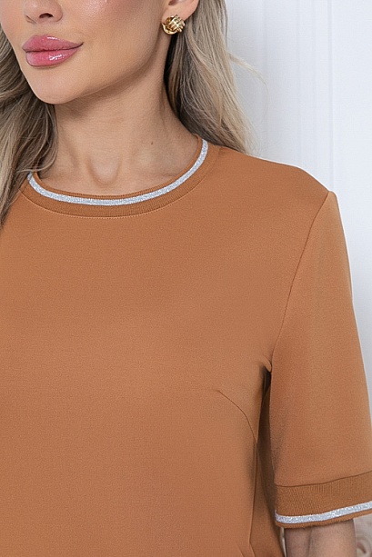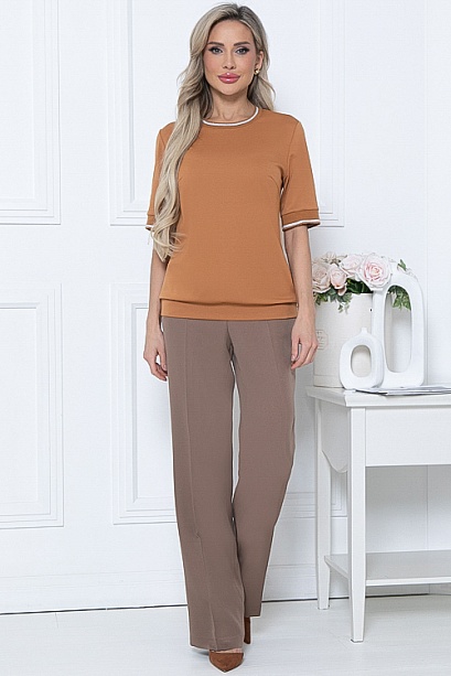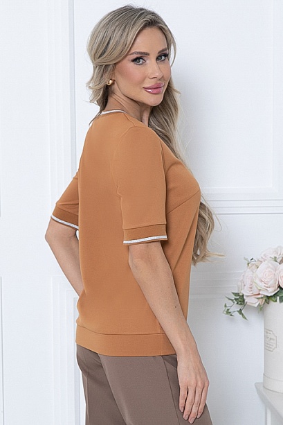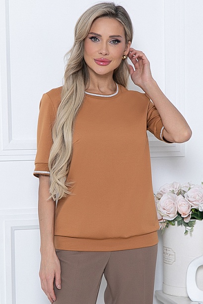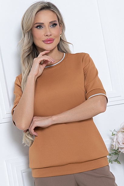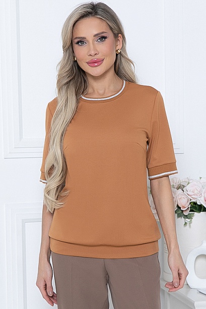 Джемпер из трикотажного полотна свободного силуэта на притачном поясе.Горловина и манжеты рукавов оформлены эластичными подвязами.