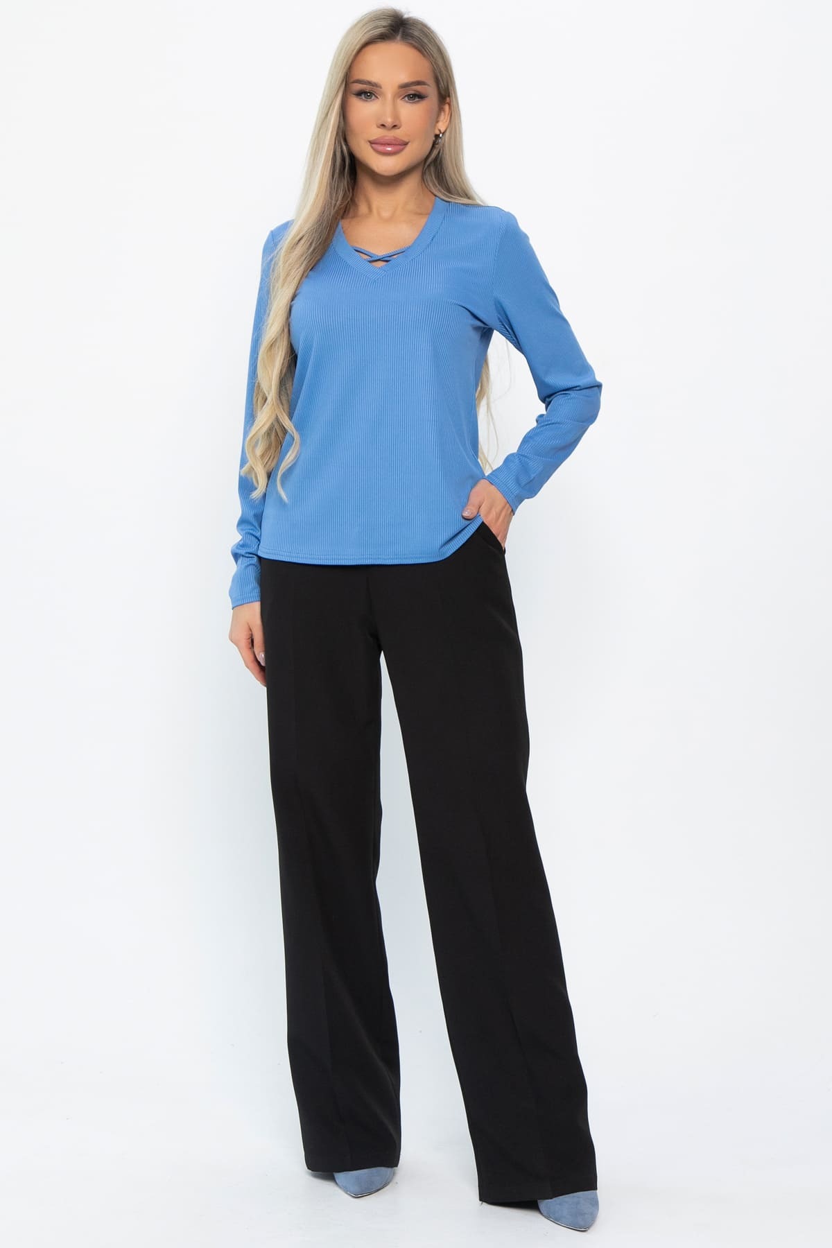 Замечательный джемпер глубокого голубого цвета. Длинные рукава и вырез на груди с декоративными вставками делают его незаменимой одеждой для повседневного и делового стиля. Великолепно подойдет к брюкам, джинсам и юбкам.