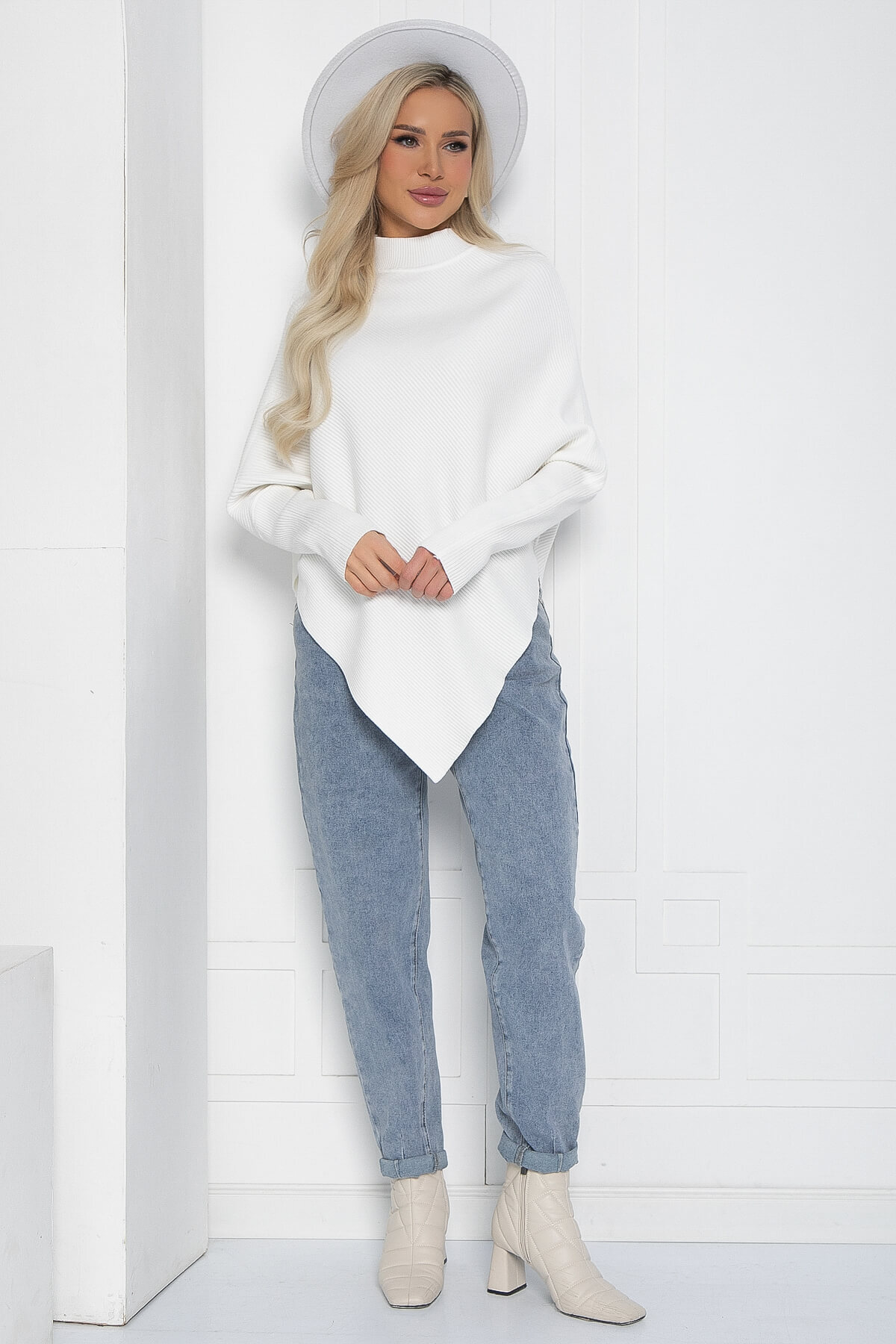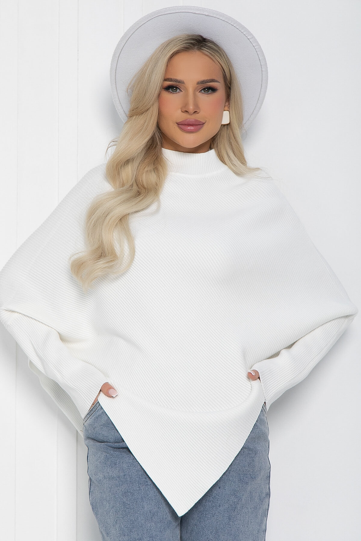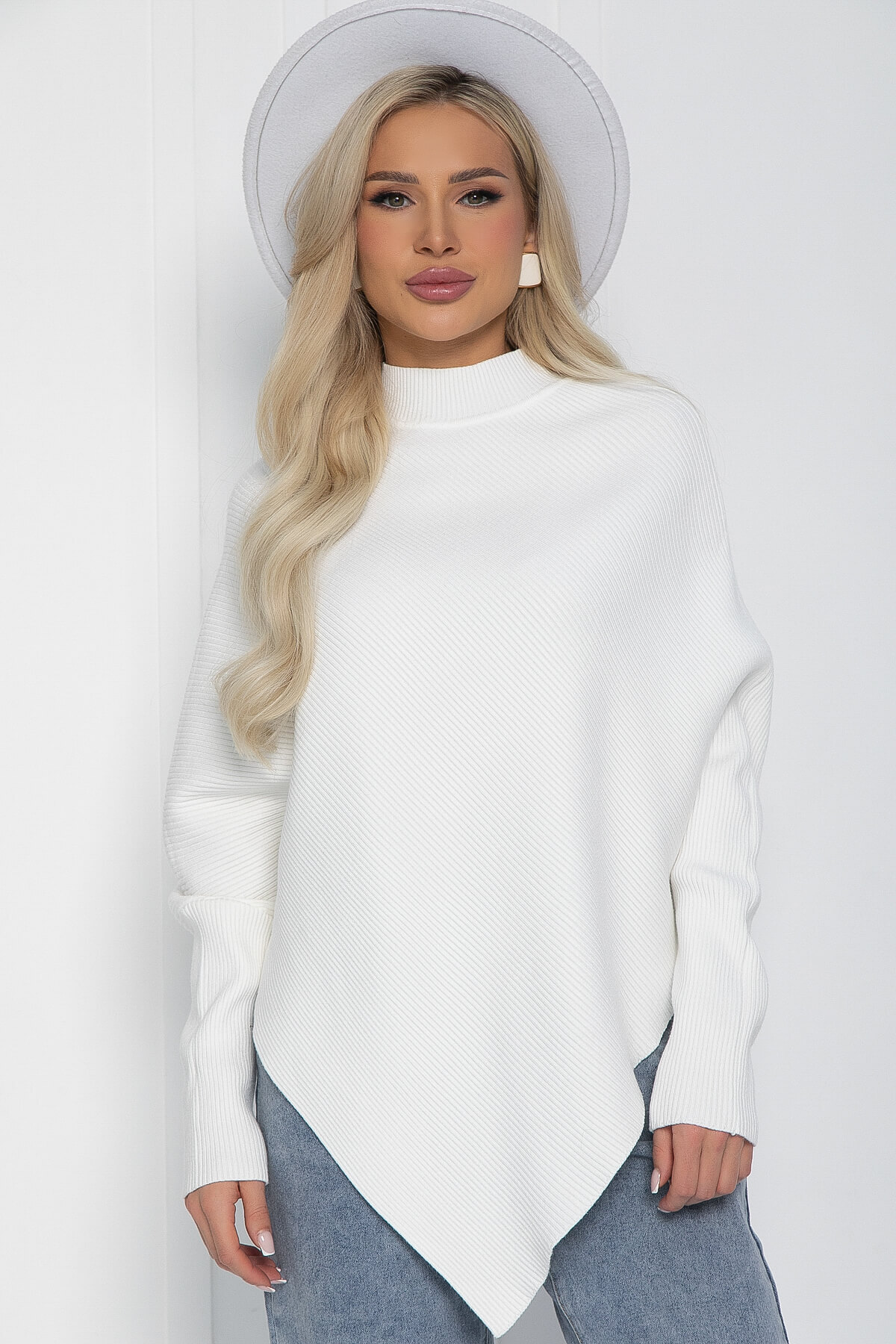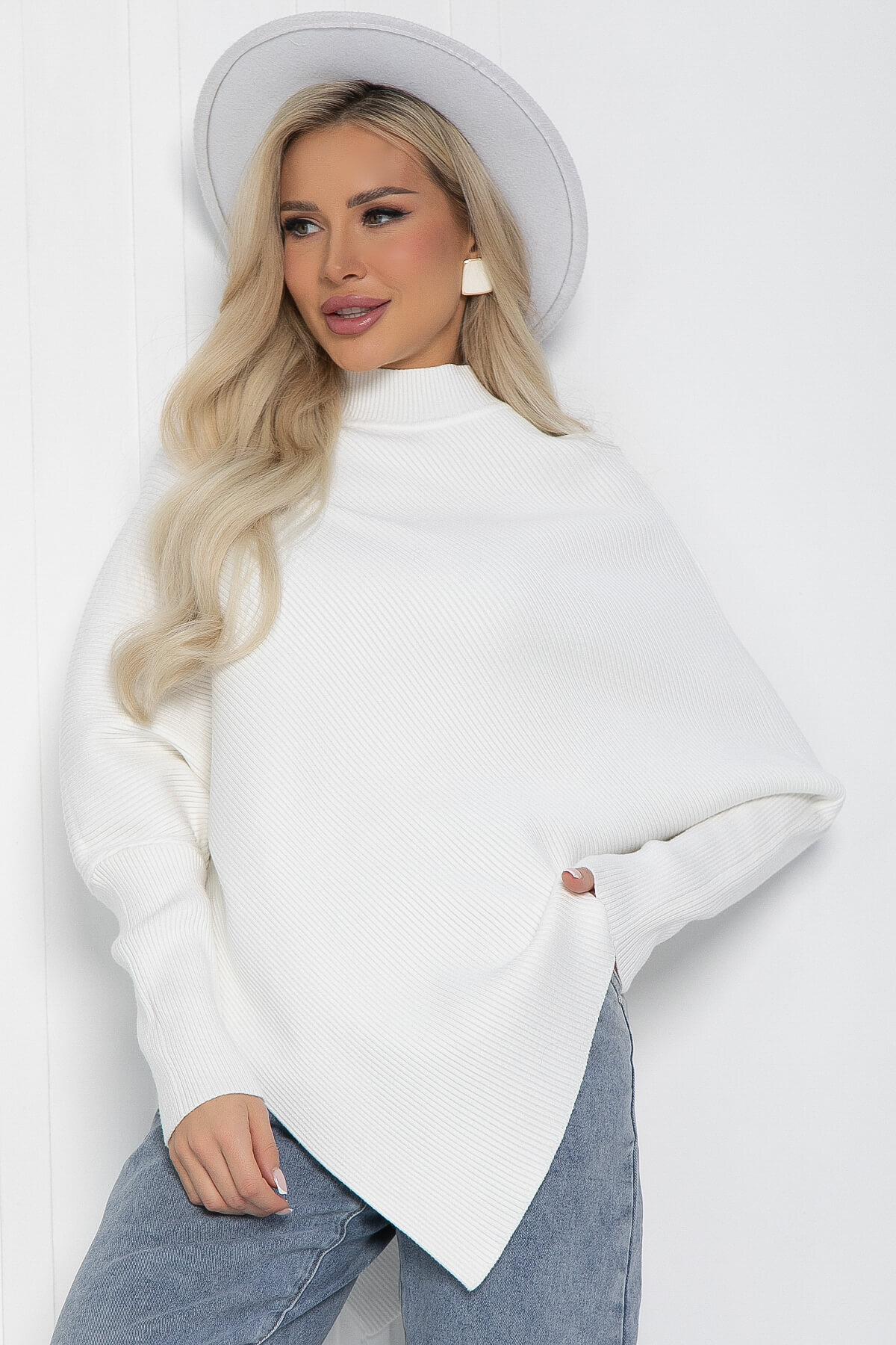 Джемпер, выполненный в стиле пончо, станет прекрасным выбором для любого сезона. Его асимметричный крой и элегантный силуэт не оставят вас незамеченной. Рукава, скроенные по типу «летучая мышь», придадут вашему образу легкость и воздушность, что делает эту модель привлекательной. Такой джемпер отлично подойдет как для офисных будней, так и для повседневной жизни.