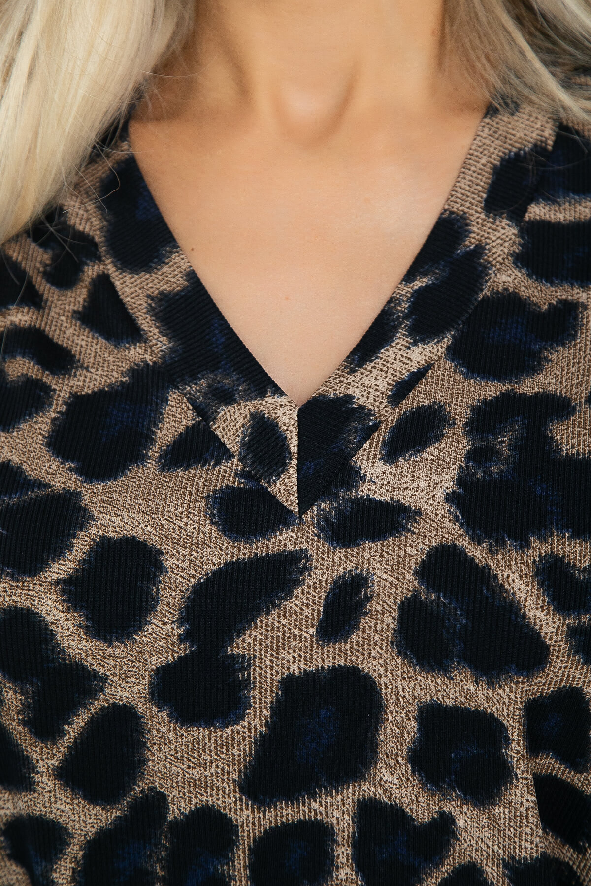 Трикотажный джемпер свободного силуэта с анималистичным принтом и V-образной горловиной — идеальное сочетание комфорта и шика! Отлично подойдет для повседневной носки и будущим мамам.