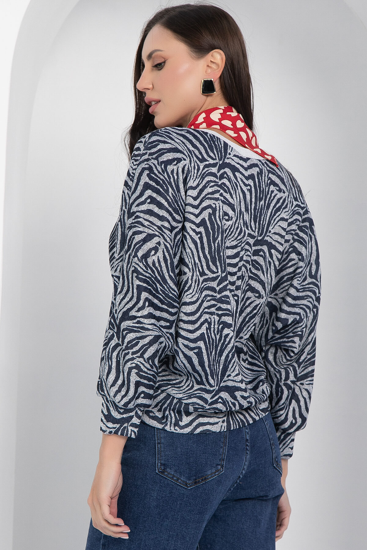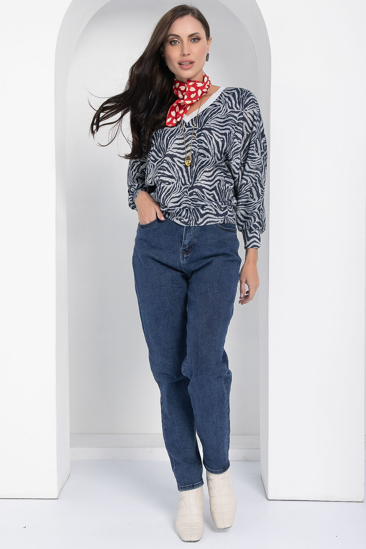 Трикотажный джемпер свободного силуэта с анималистичным принтом и V-образной горловиной — идеальное сочетание комфорта и шика! Отлично подойдет для повседневной носки и будущим мамам.