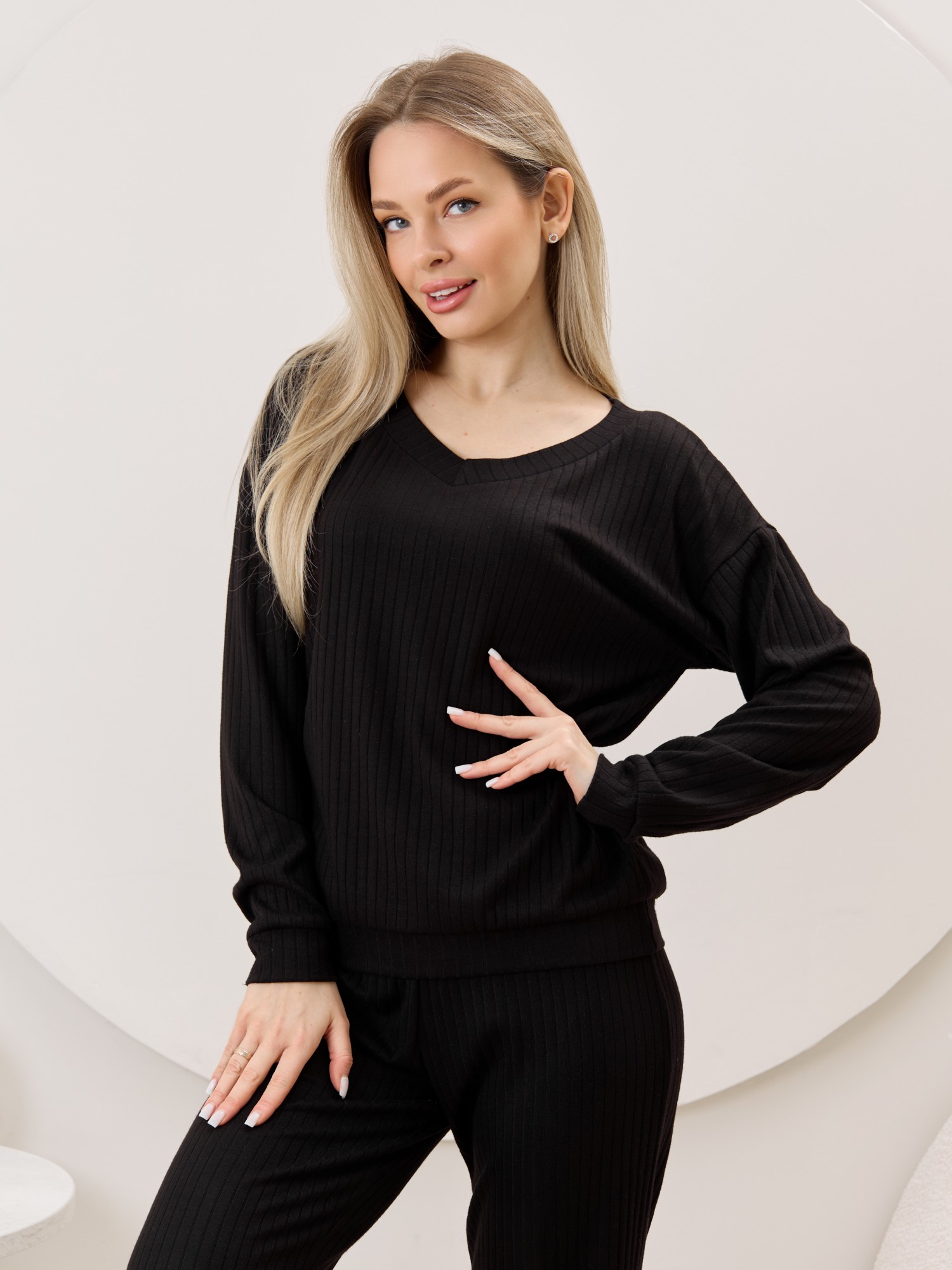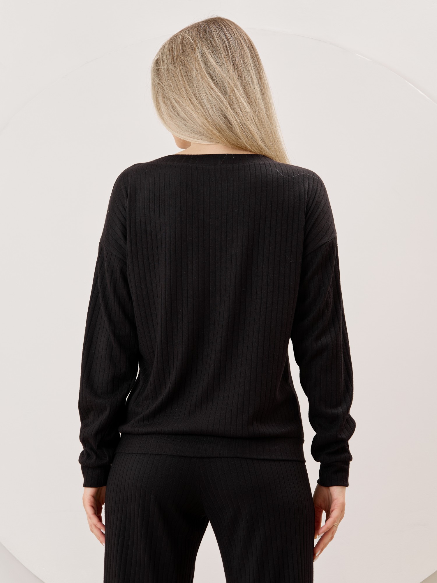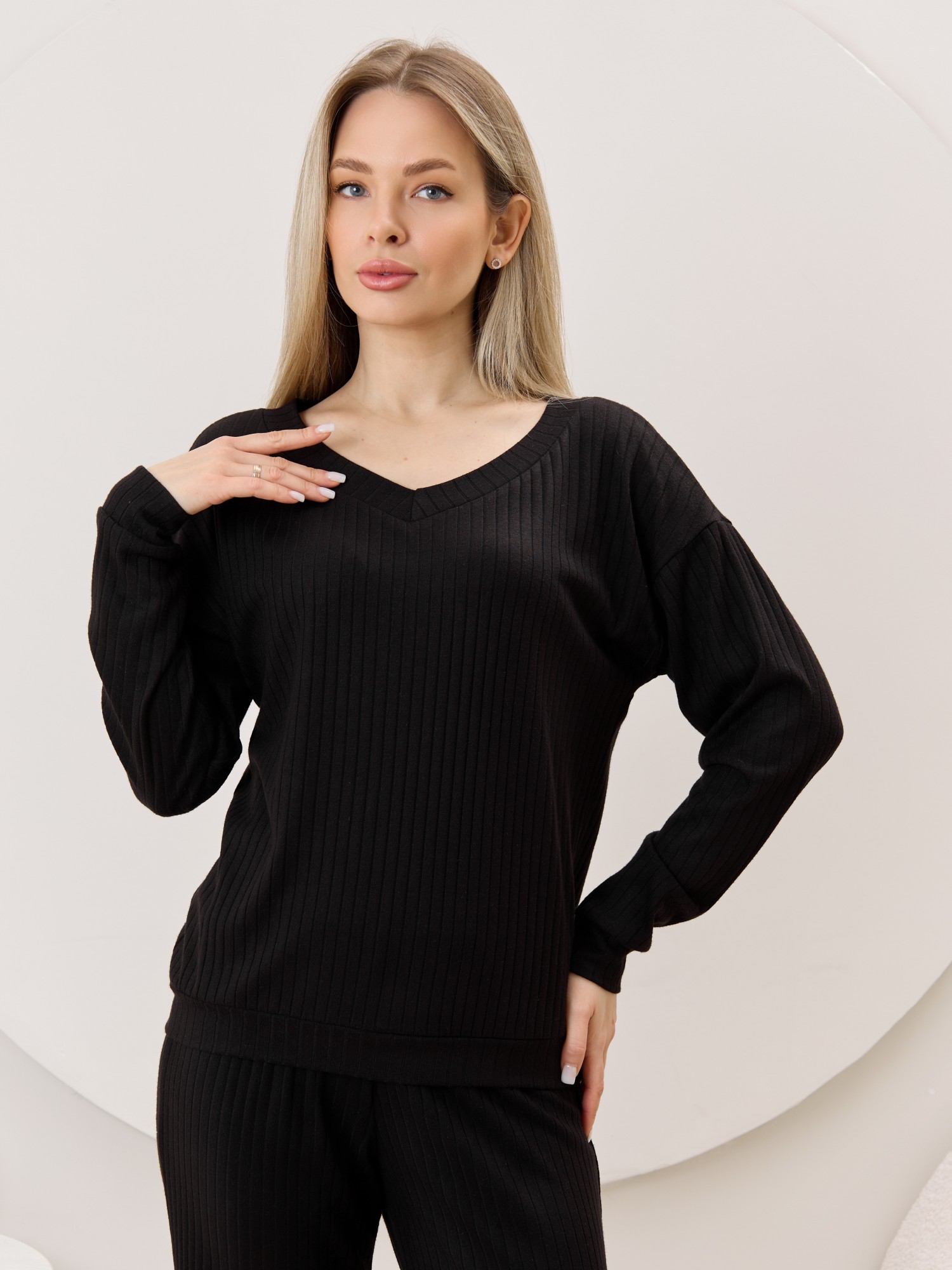 Джемпер женский из гладкокрашенного трикотажного фактурного полотна в «рубчик» с добавлением ангоры, классического покроя, с расширенной V-образной горловиной, обработанной втачной планкой, длинными втачными рукавами. Низ изделия обработан притачным поясом, рукава с манжетами.